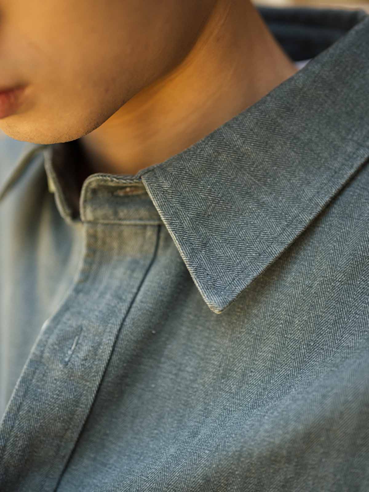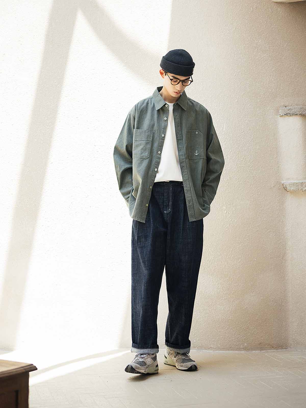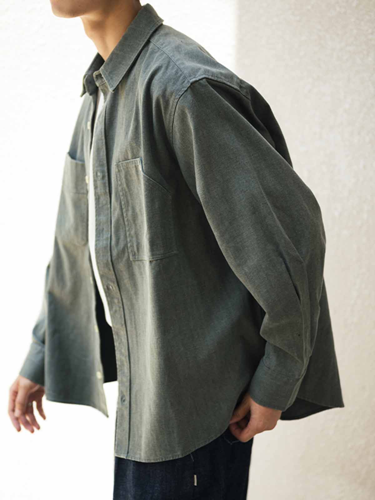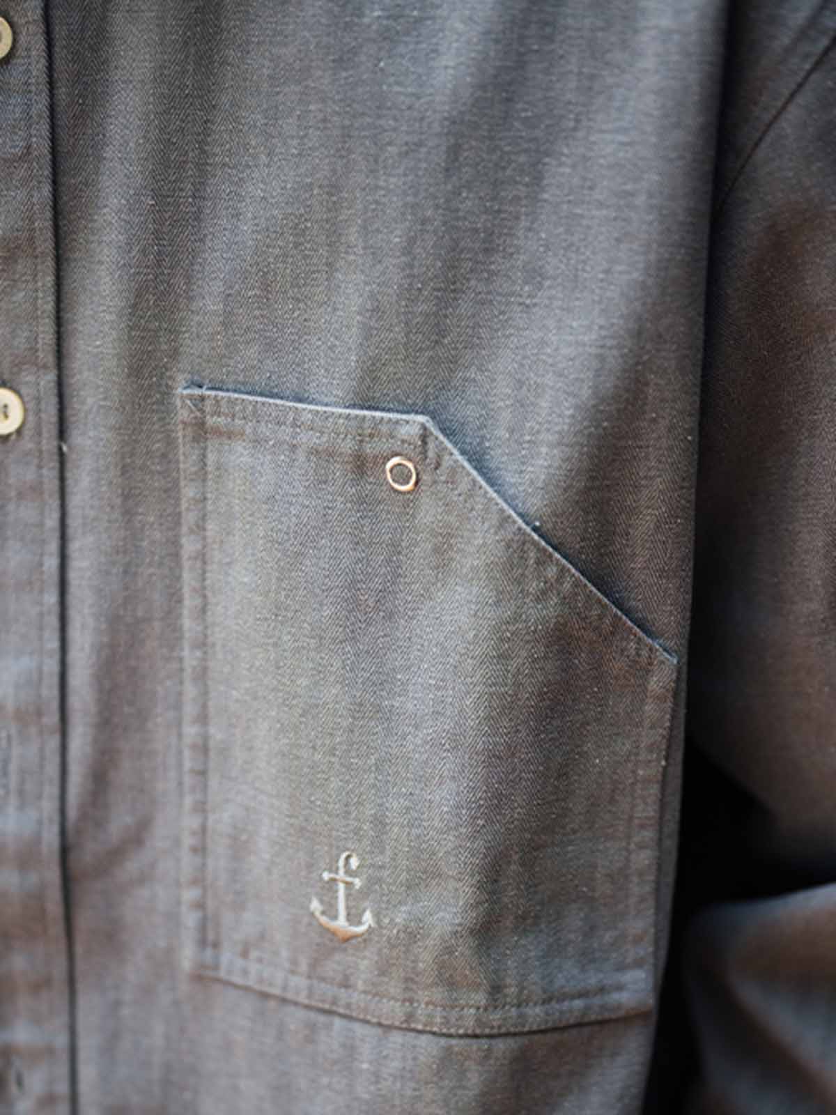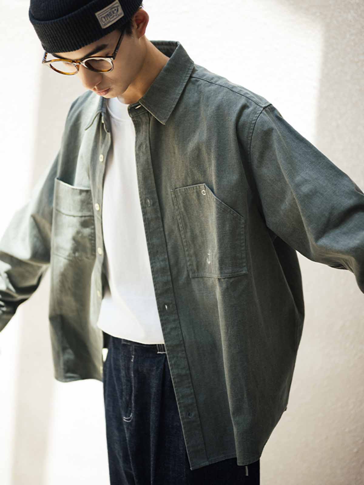 1940年代のChief Petty Officersシャツの実用性を継承しつつ、日本製の310gヘリンボーンコットン生地を採用。手触りがしっかりとした素材感とウォッシュによる不規則な色落ちが特徴で、シルエットはゆるめのルーズフィット。左胸はCPOシャツらしいフラップポケット、右胸はUSレイルロードジャケット由来の非対称ポケットを配置。耐腐食性YKK五爪ボタンと“f”アンカー刺繍がディテールを引き立て、秋冬に単体またはレイヤードで幅広いスタイルを楽しめる。
