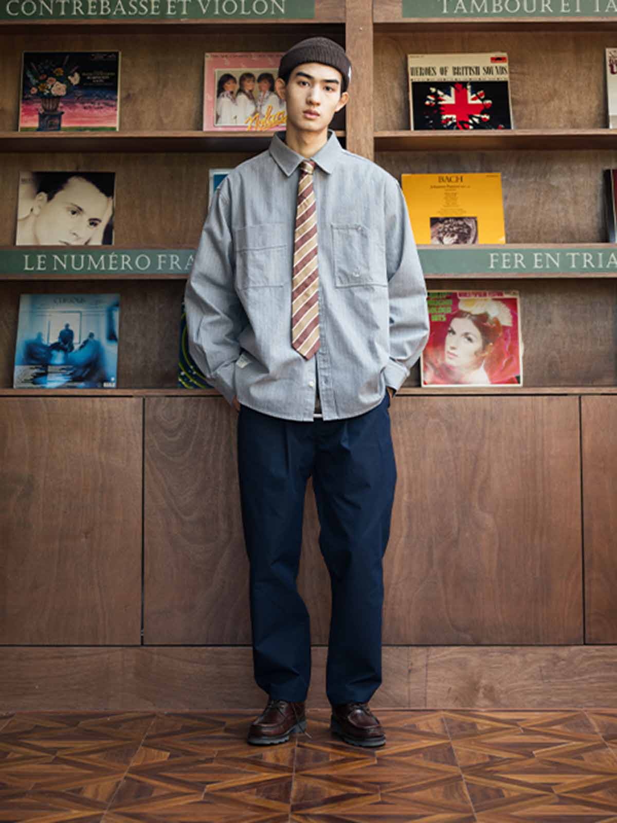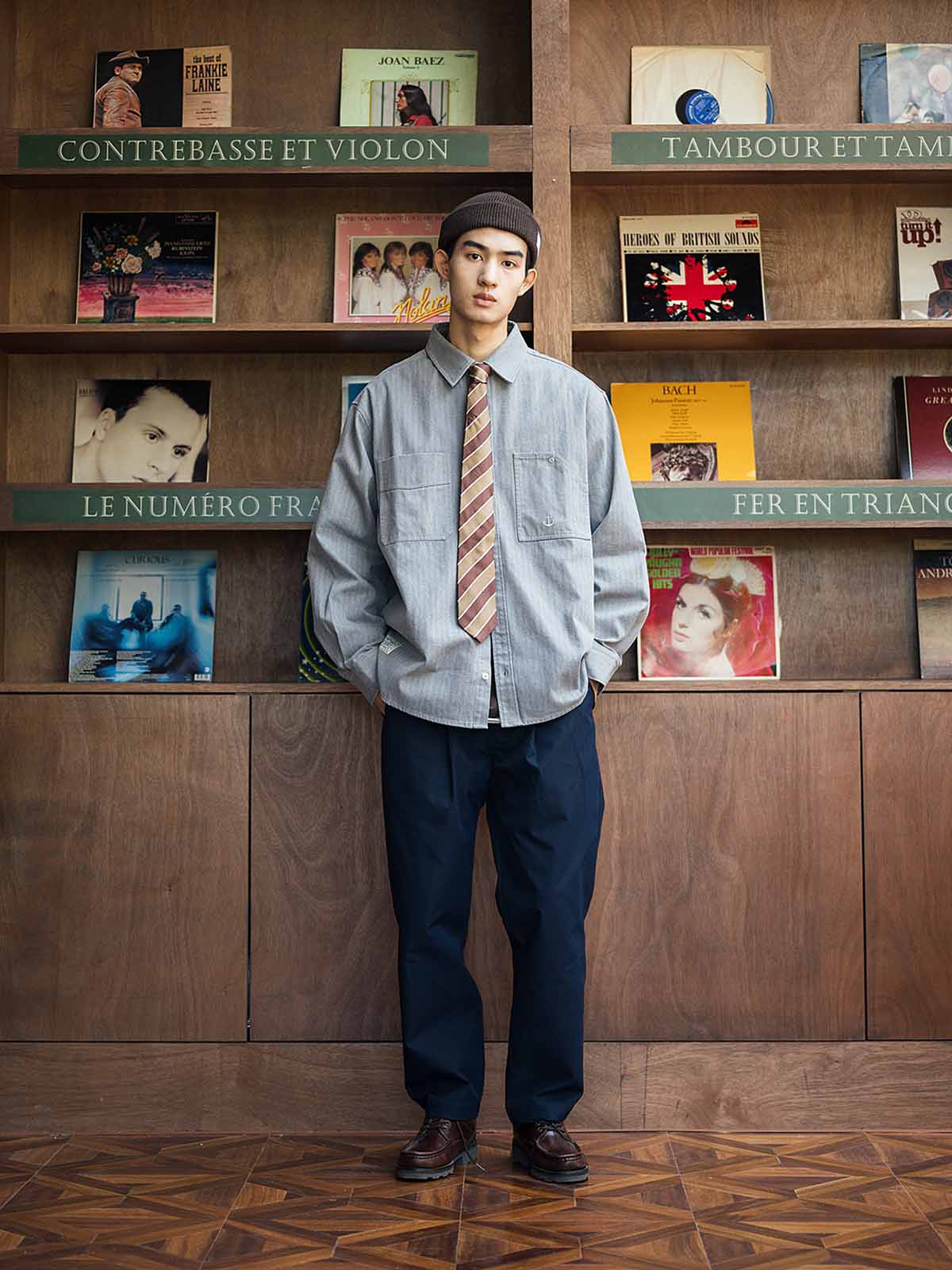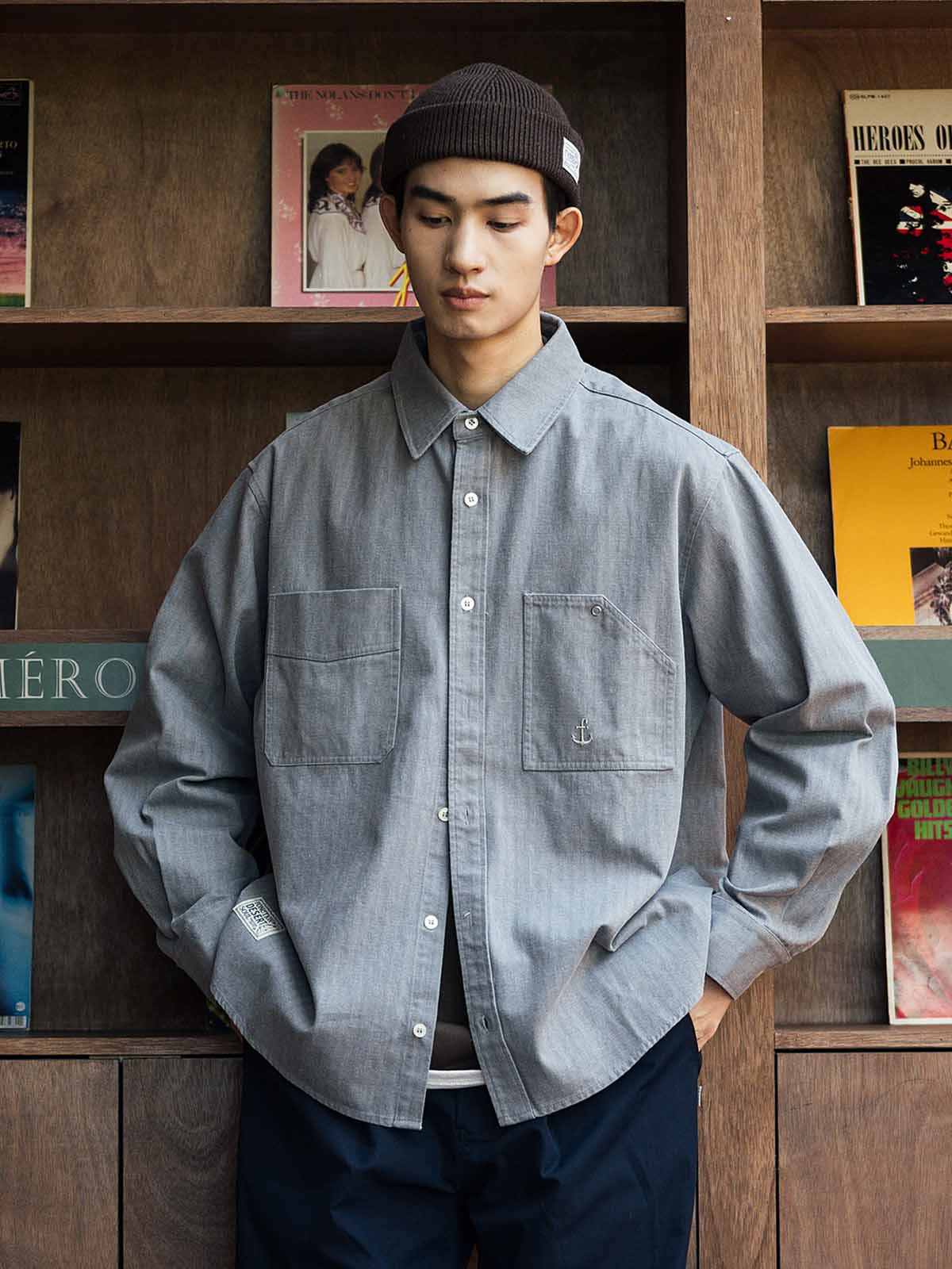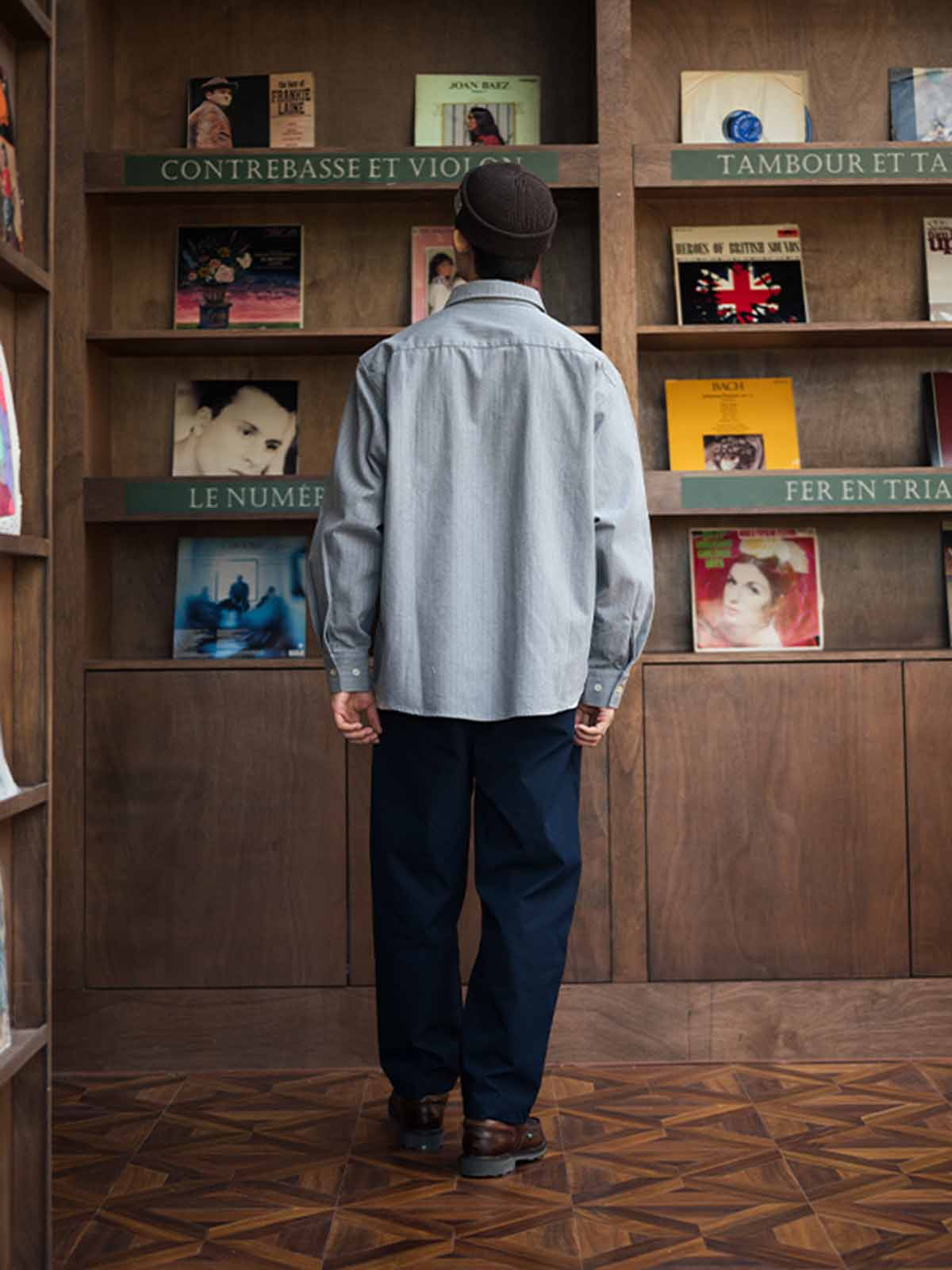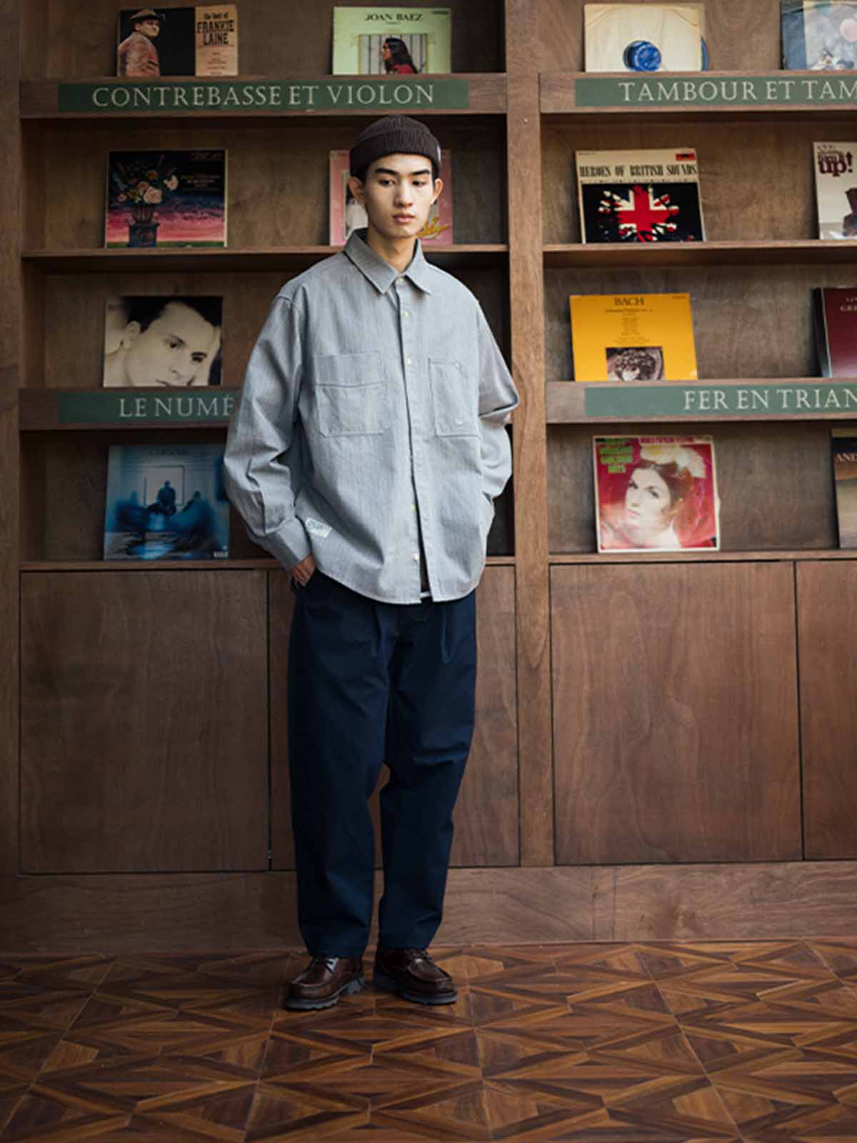 1940年代のChief Petty Officersシャツの実用性を継承しつつ、日本製の310gヘリンボーンコットン生地を採用。手触りがしっかりとした素材感とウォッシュによる不規則な色落ちが特徴で、シルエットはゆるめのルーズフィット。左胸はCPOシャツらしいフラップポケット、右胸はUSレイルロードジャケット由来の非対称ポケットを配置。耐腐食性YKK五爪ボタンと“f”アンカー刺繍がディテールを引き立て、秋冬に単体またはレイヤードで幅広いスタイルを楽しめる。