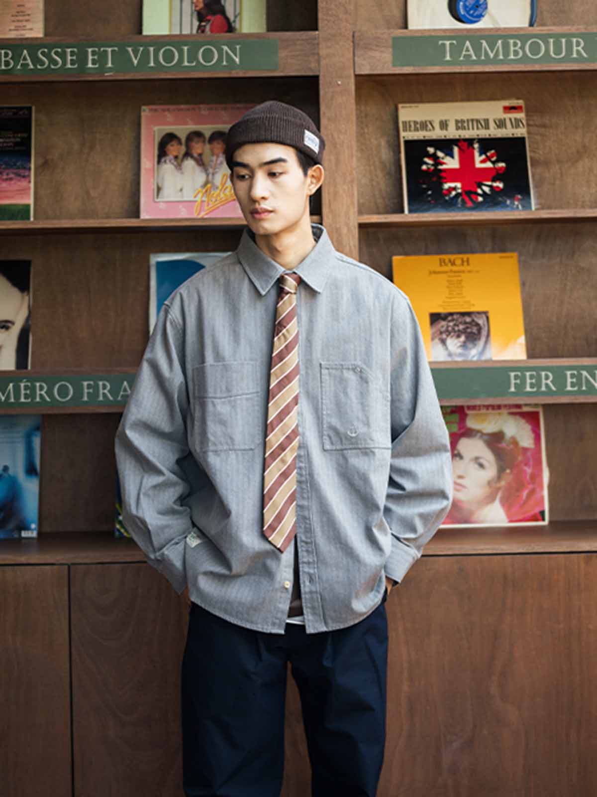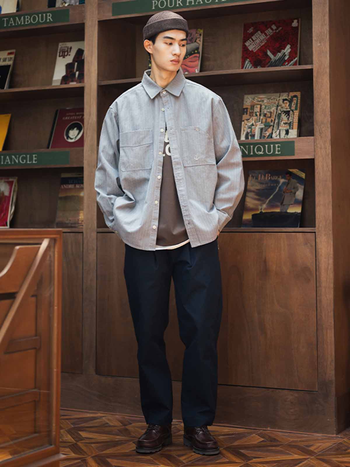 1940年代のUSN CPOシャツをベースに、日本製310gヘリンボーン生地でミリタリーと都市カジュアルを融合した厚手シャツ。