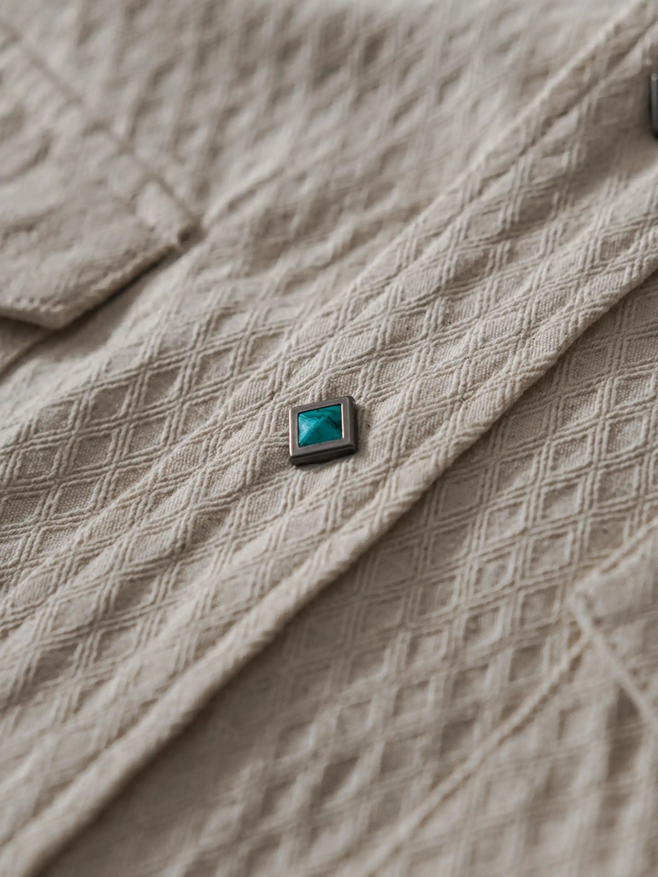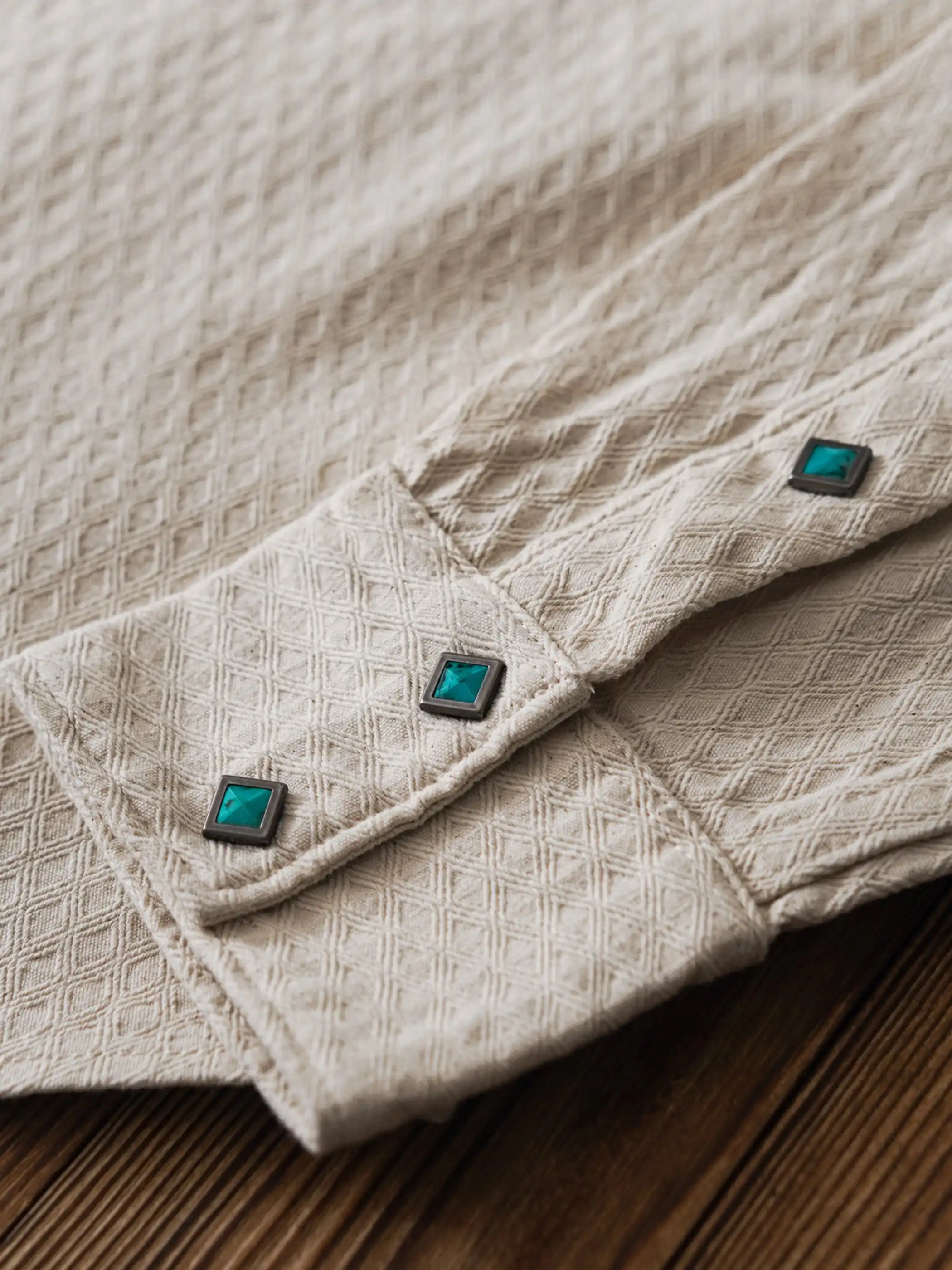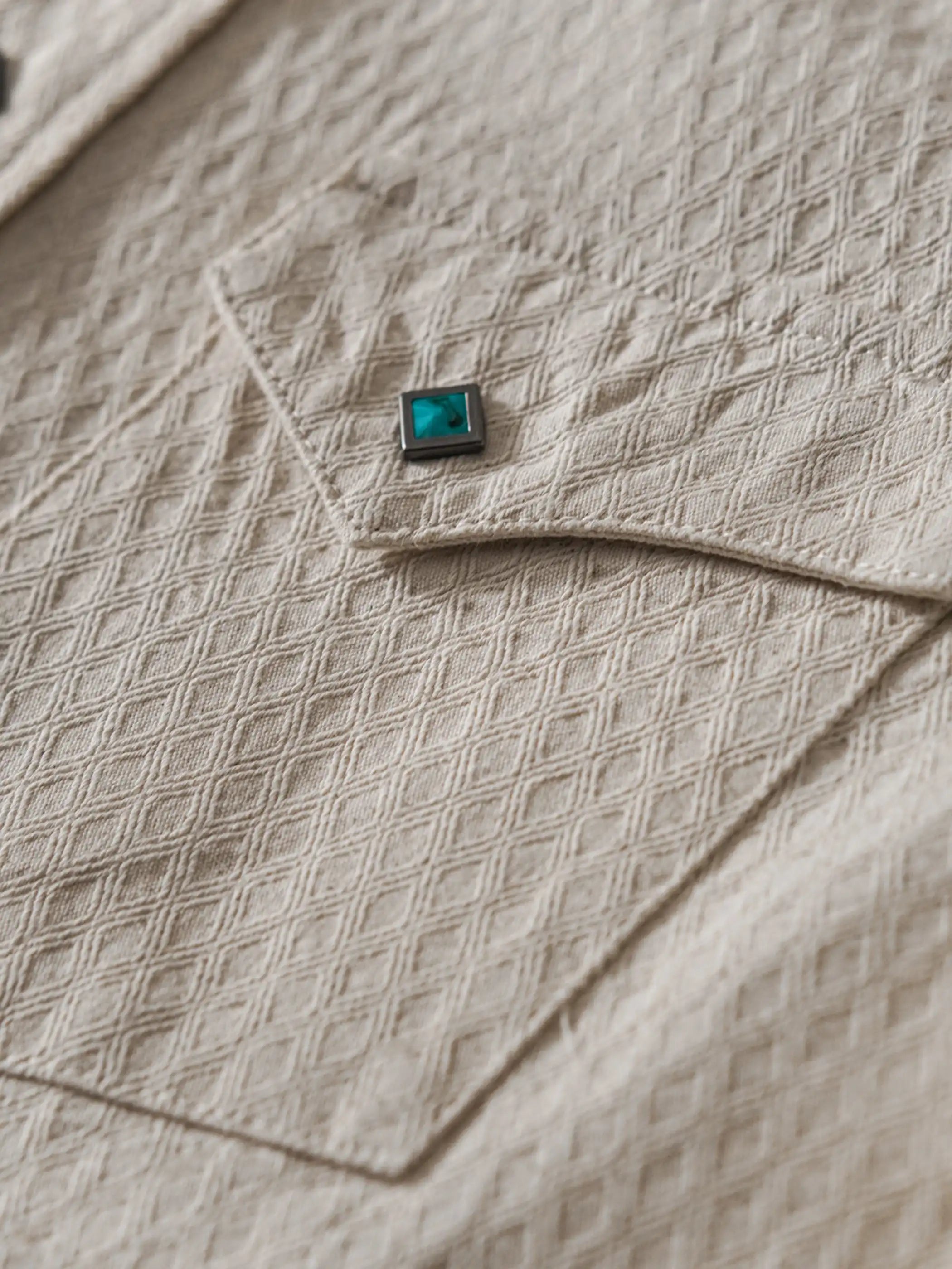 9.2オンスのジャカード織りコットンを使用し、洗い加工によって生まれる自然な風合いが特徴。生成りの色味を活かした生地には籾殻(もみがら)が含まれており、漂白していないため、素材そのものの粗野な魅力が感じられます。最大のポイントはターコイズ調のボタンと酸化銀風のメタルカラーを組み合わせたコンチョ風デザインで、アメリカンヴィンテージのシルバーアクセサリーを想起させる仕上がり。幾何学的なジャカード柄の質感とターコイズボタンが絶妙にマッチし、シンプルなホワイト系シャツでは物足りない方にもおすすめです。厚手ながらも通気性があり、春秋はアウター感覚で、冬はインナーとしても重宝するオールラウンダーです。