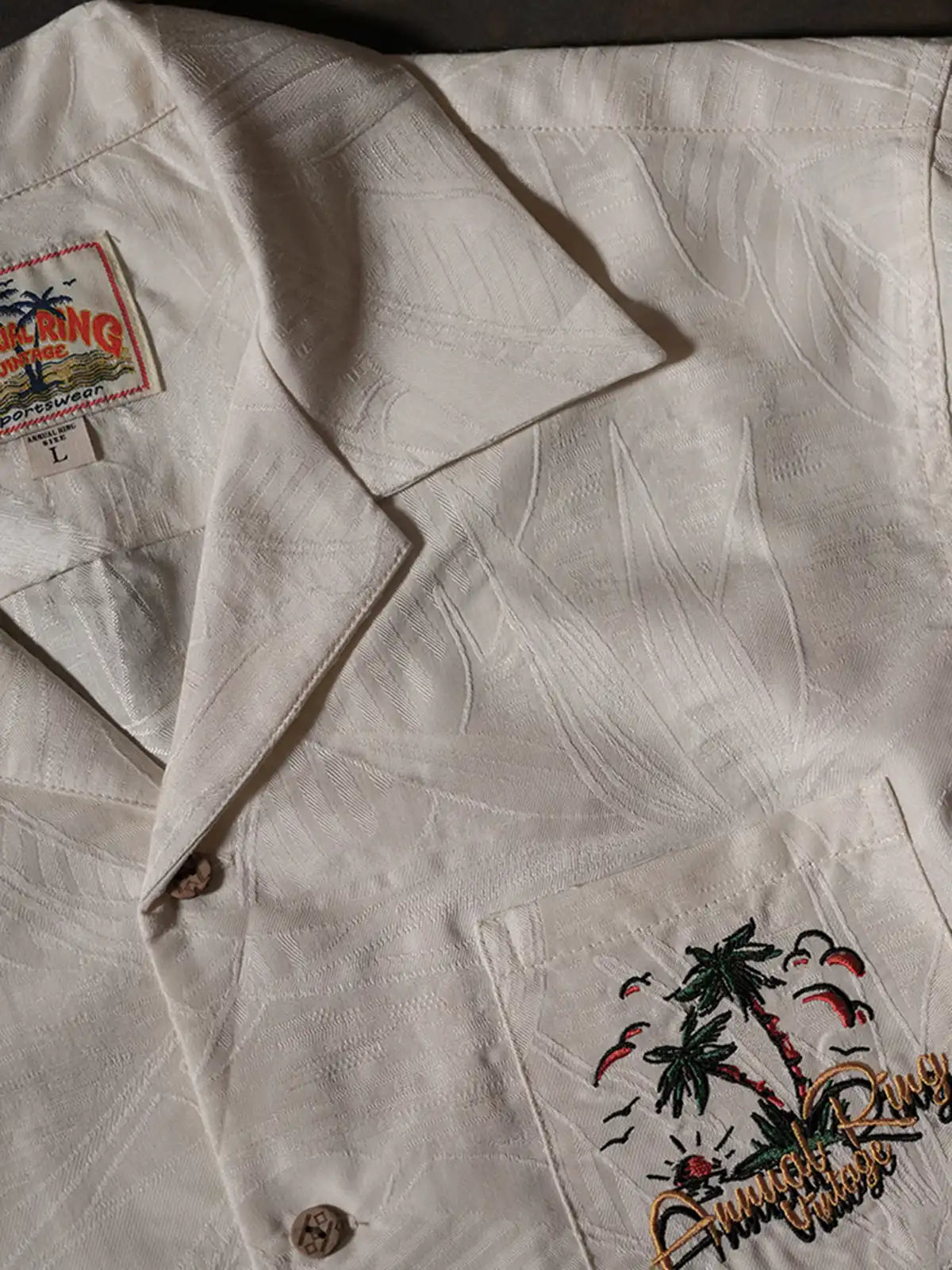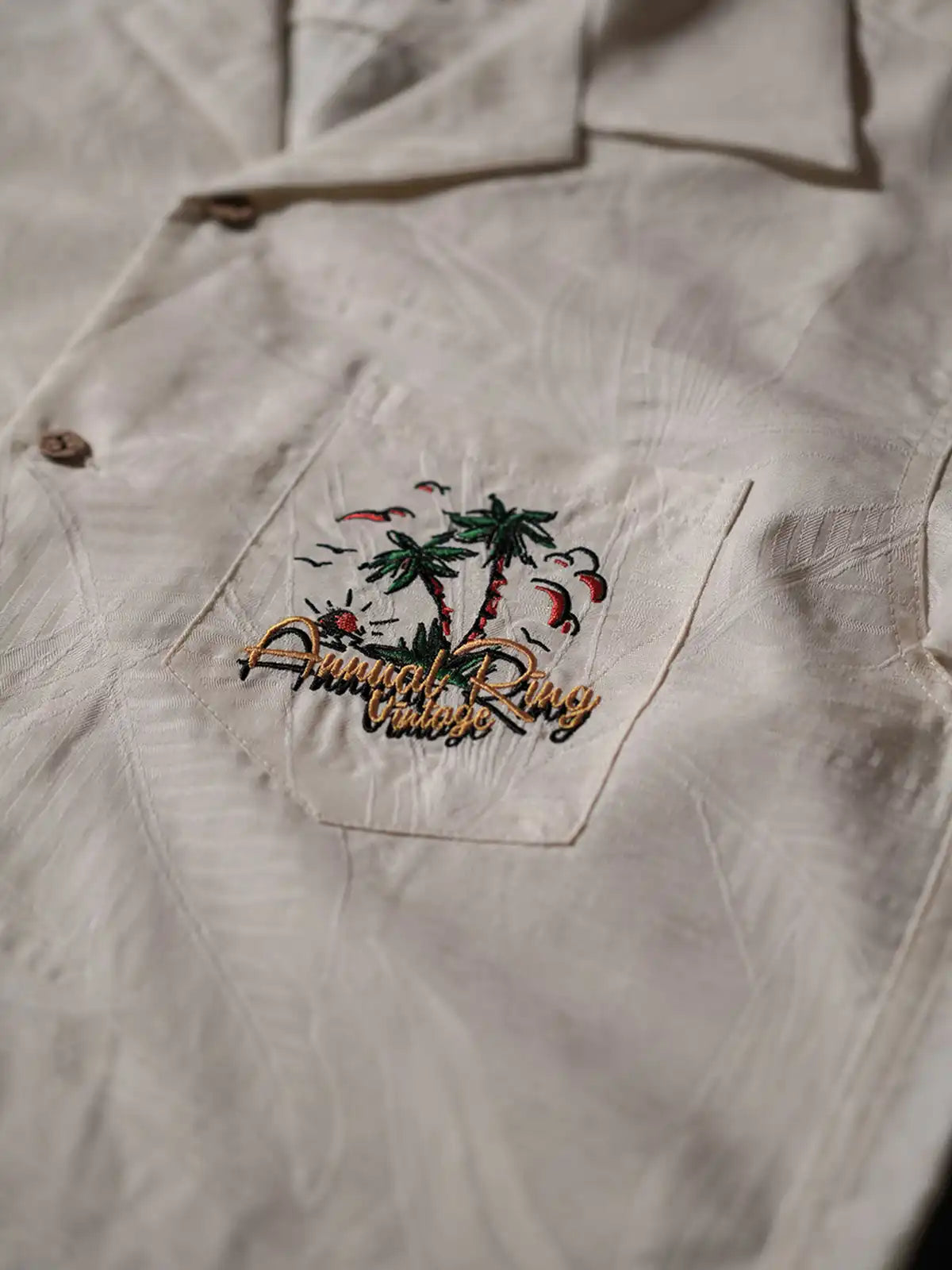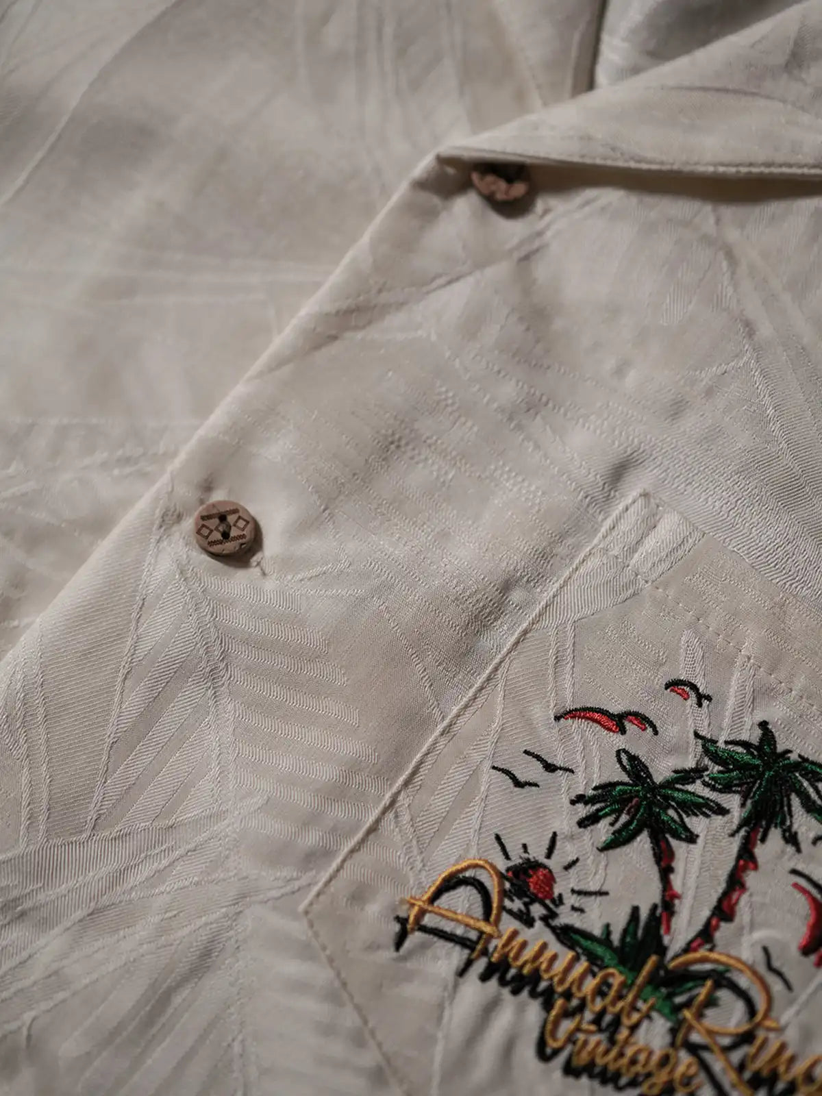 1970年代のオールド・アロハシャツをモチーフに再構築した一着。天丝(リヨセル)72%とポリエステル28%を配合したオリジナル生地を使用し、リヨセル特有の柔らかい光沢と滑らかさに加え、ポリエステルの混紡でシワになりにくい実用性を備える。ジャカード織りで表現されたパラダイスバード(極楽鳥花)や熱帯植物の模様が生地全体に浮かび上がり、奥行きのある表情を演出。天然ココナッツボタンはヴィンテージ調のラテカラーに仕上げられ、一つ一つ手磨きされた質感が高級感を引き立てる。胸ポケットにはサンセットとヤシの木を描いた緻密な刺繍を施し、さりげなく個性を主張。リラックスしたボックスシルエットと古巴襟のカッティングが夏のリゾートに最適。