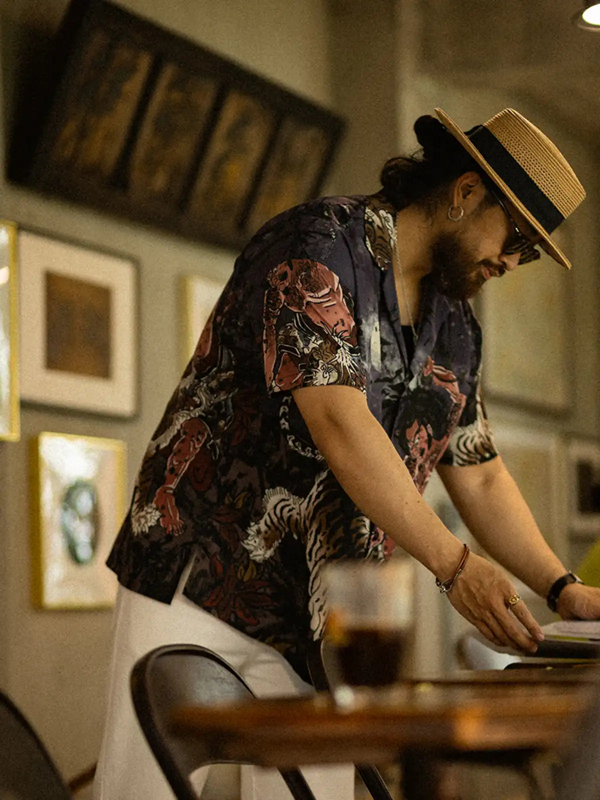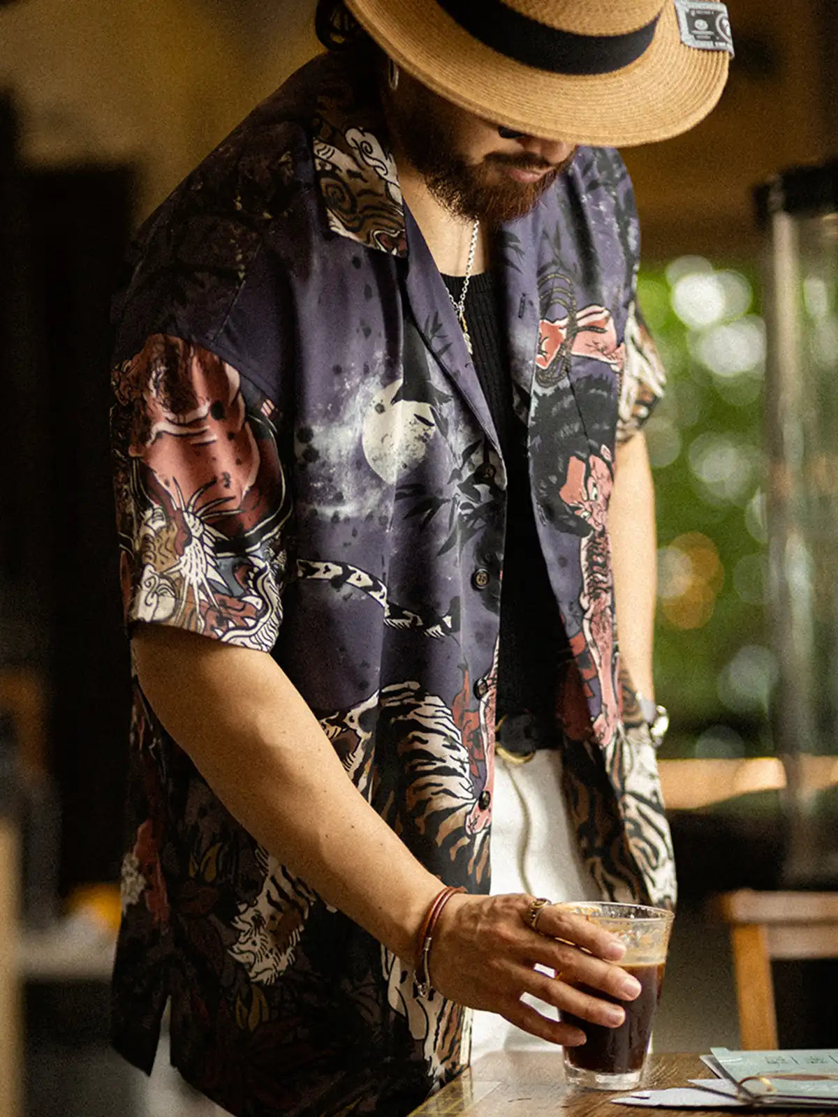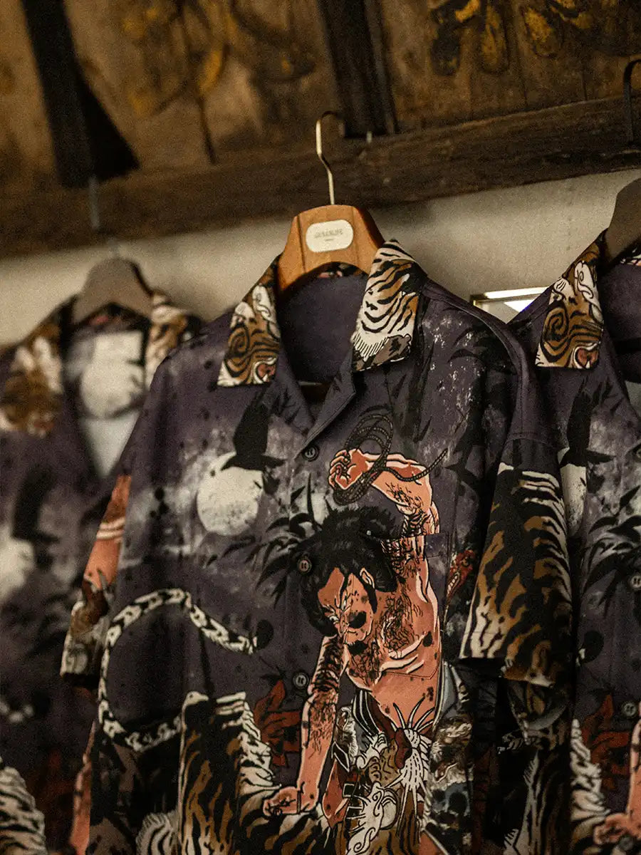 宋代英雄伝説「武松が虎を討つ」をパターンマッチ印刷で表現した、涼感ナイロン製キューバカラーシャツ。