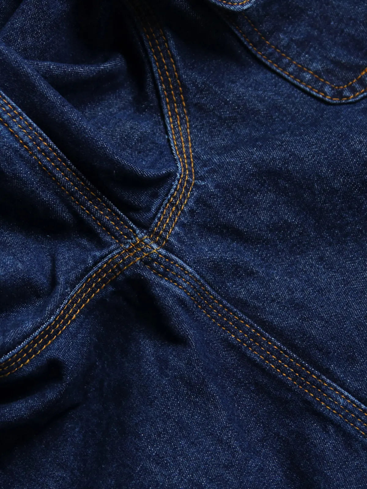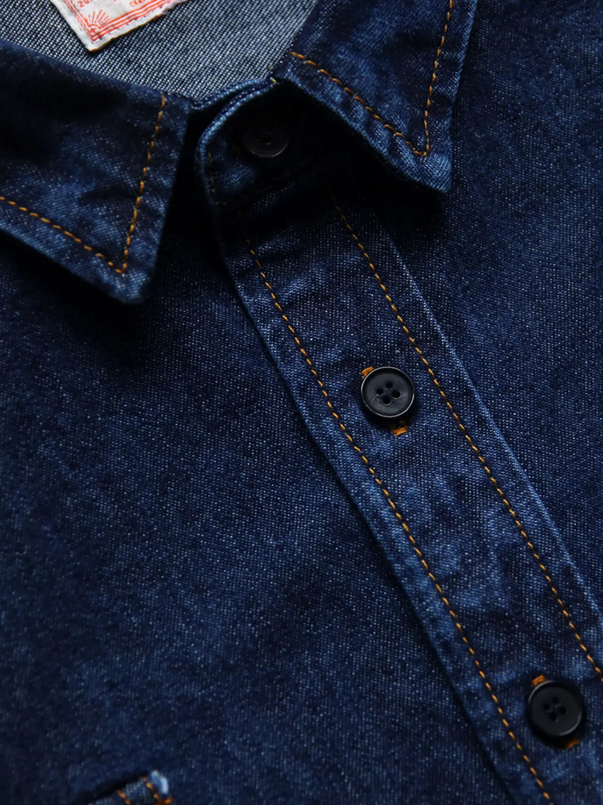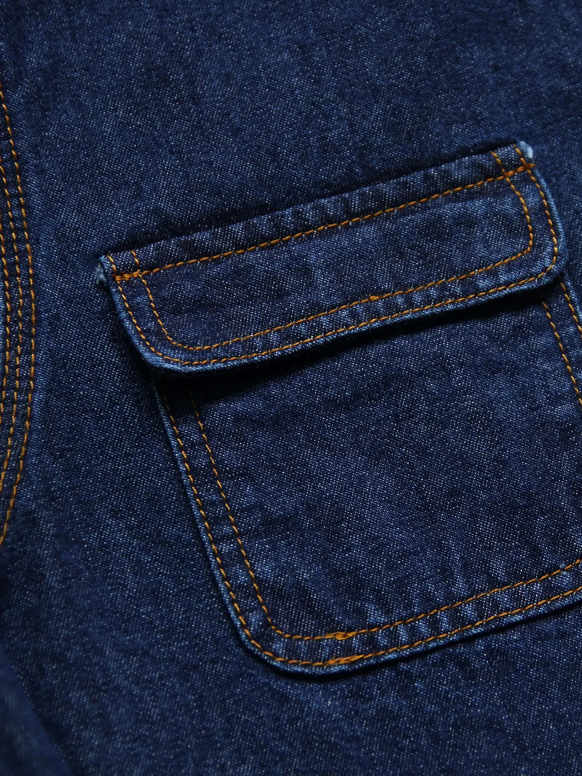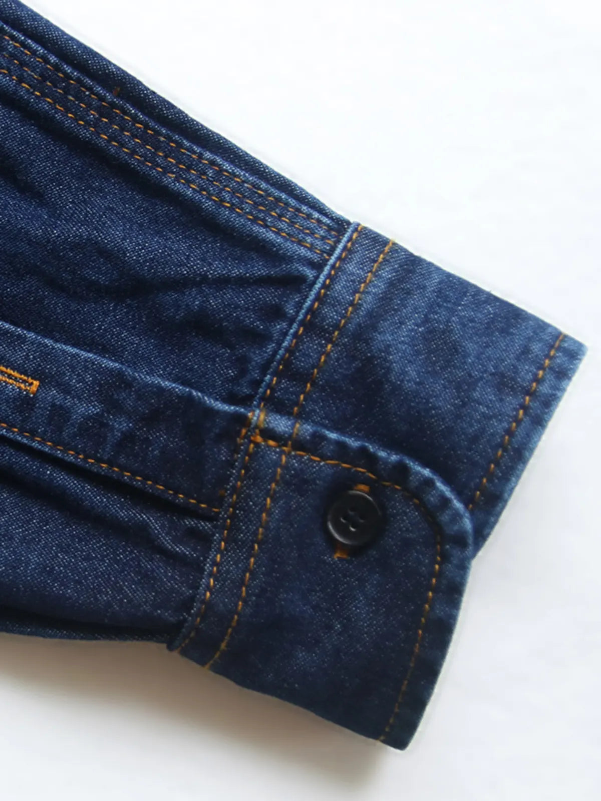 スクエアカラーと立体ポケット、隠しポケットが特徴のアメカジスタイル長袖デニムシャツ。