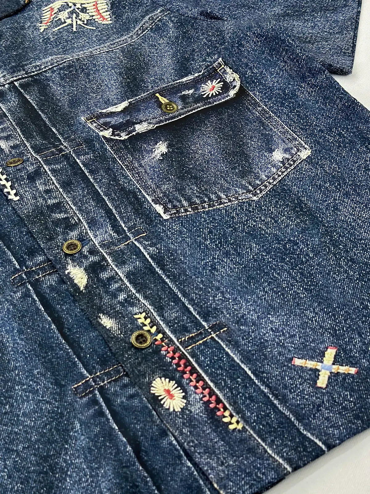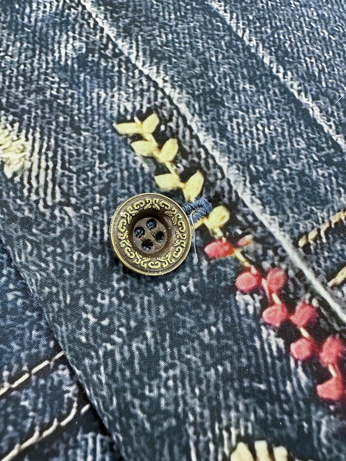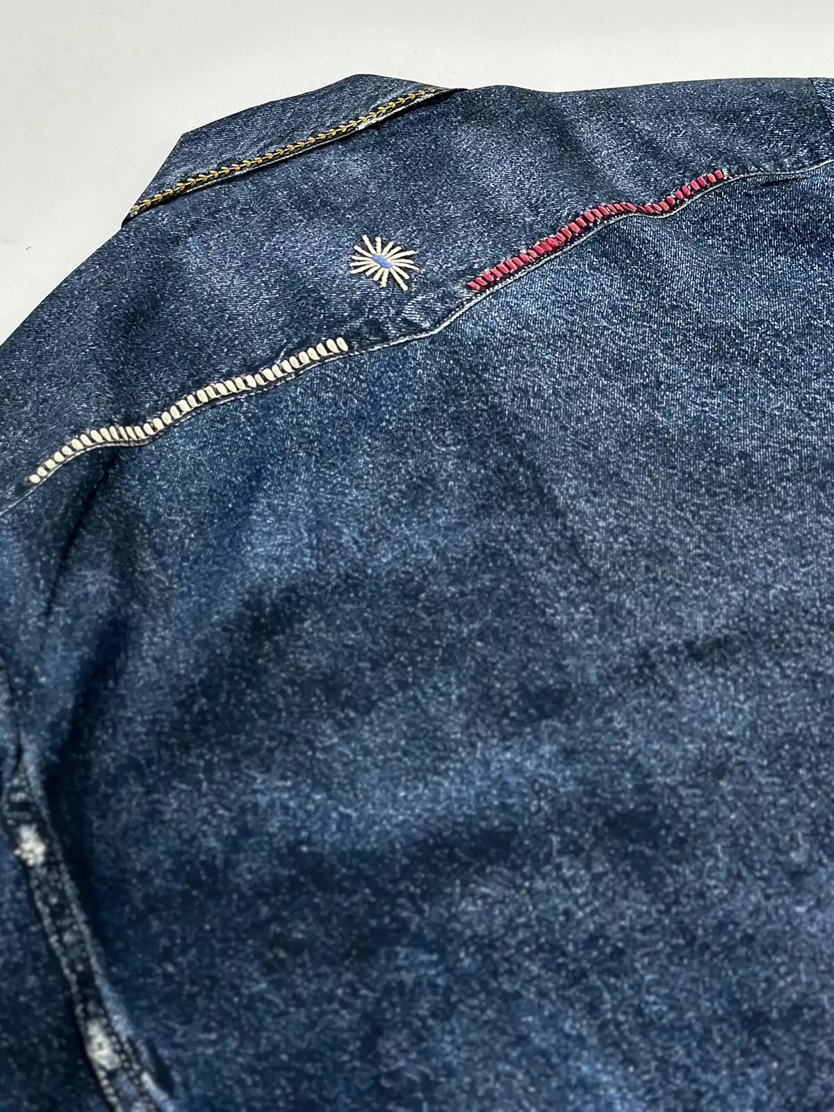 ヴィンテージ風ウォッシュを施した6.5ozデニム生地にインディアンの雷鳥モチーフをプリントし、本格的なヨーク切り替えとスナップボタンを備えたワークウェアシャツ。
