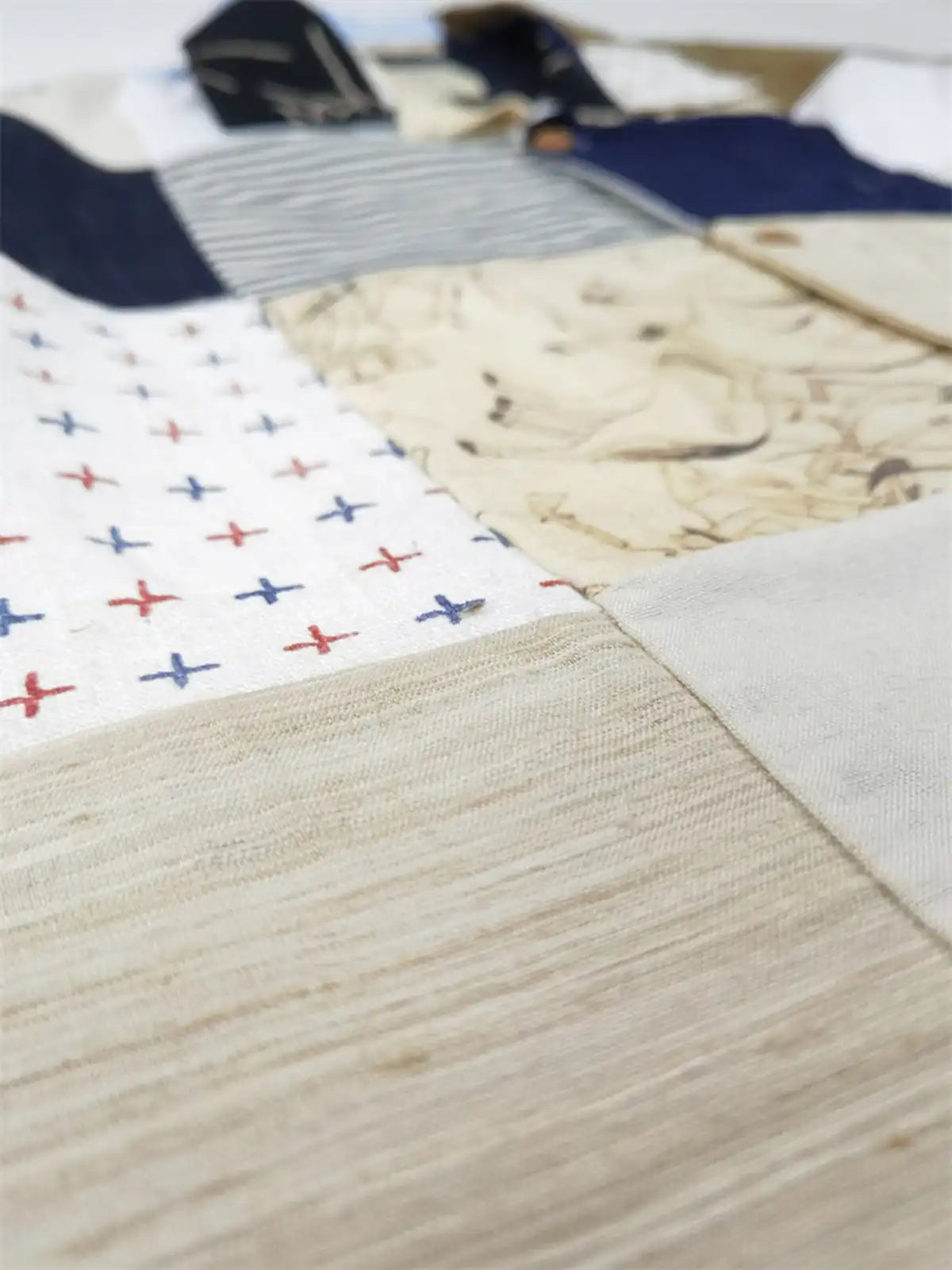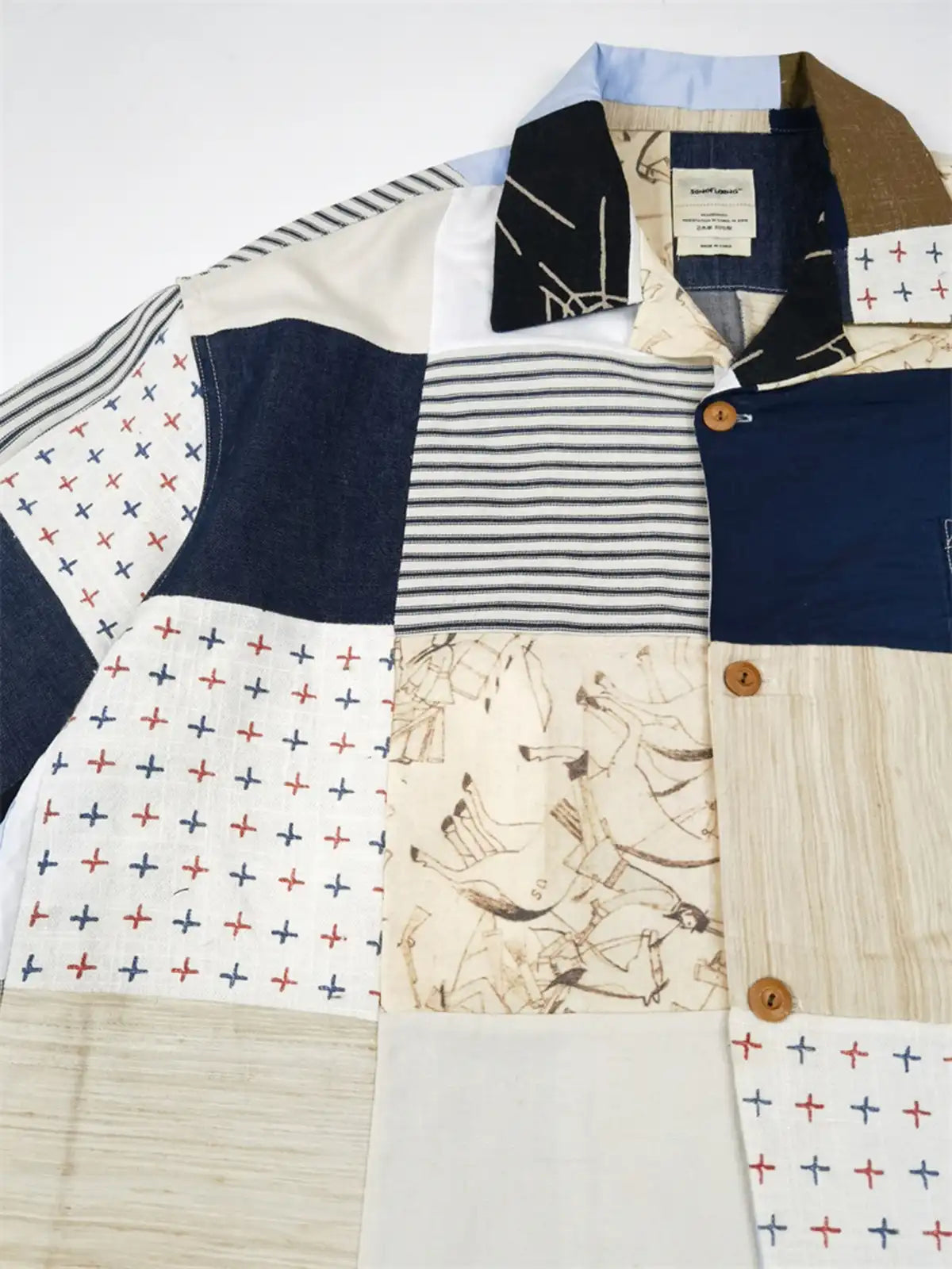 本シャツは、レトロな印象のブロック状パッチワークを採用し、シルク(柞蚕)、ウール、靛青ストライプのコットン、綿麻プリントなど多彩な生地を組み合わせています。複数の素材を使用することで、色合いやテクスチャーが各部分で異なり、見た目にも個性的でアートピースのような風合いを持ちます。オープンカラー(キューバカラー)とゆったりめのボックスシルエットが、夏のカジュアルコーデやリゾートスタイルに活躍。さらに、一部の布には洗い加工や刺し子風ステッチが施されており、より深みのあるヴィンテージテイストを演出します。ランダムなパネル配置により、製品ごとに異なる表情を楽しめるのも魅力です。