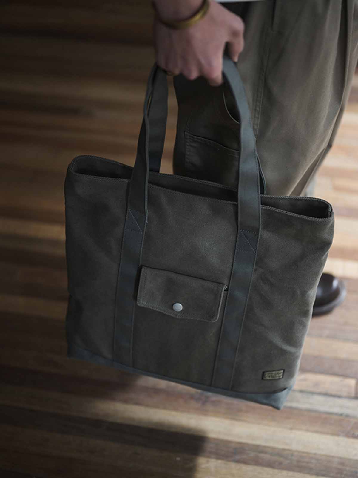 24オンスのデッドストックオリーブグリーンキャンバスを使用したトートバッグ。生地は軽く糊付け加工が施され、程よい重量感と硬さを備え、不規則な色落ちが使い込むほどにヴィンテージ感を増していく。開口部にはスムーズに開閉可能なTalonヴィンテージゴールドジップを採用。肩紐は長めで、手持ちと肩掛けの2WAY仕様。内側と外側にはそれぞれ独立ポケットを備え、14インチのノートパソコンを収納可能。内部はすべて丁寧なパイピング処理が施され、耐久性にも優れている。ヴィンテージテイストの織りネームがアクセント。ミリタリーやヴィンテージ好きにおすすめの個性溢れるデザイン。