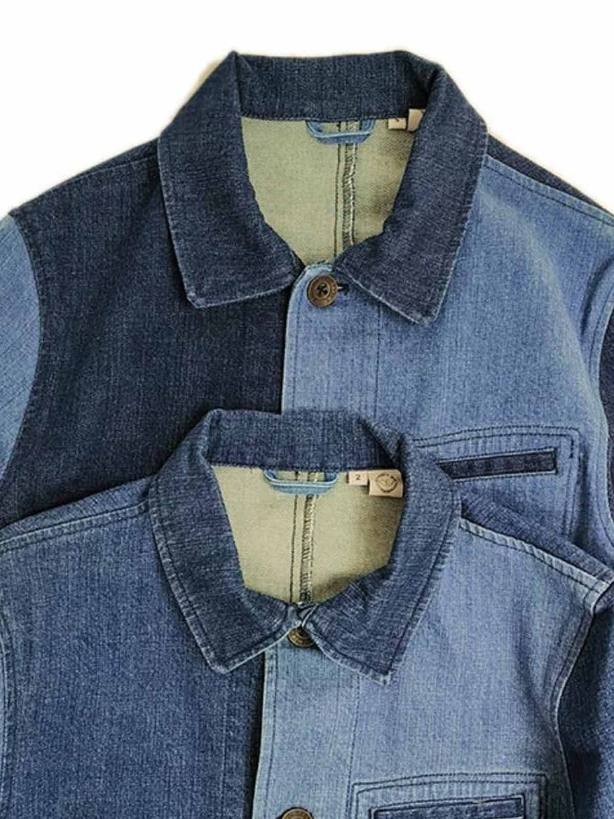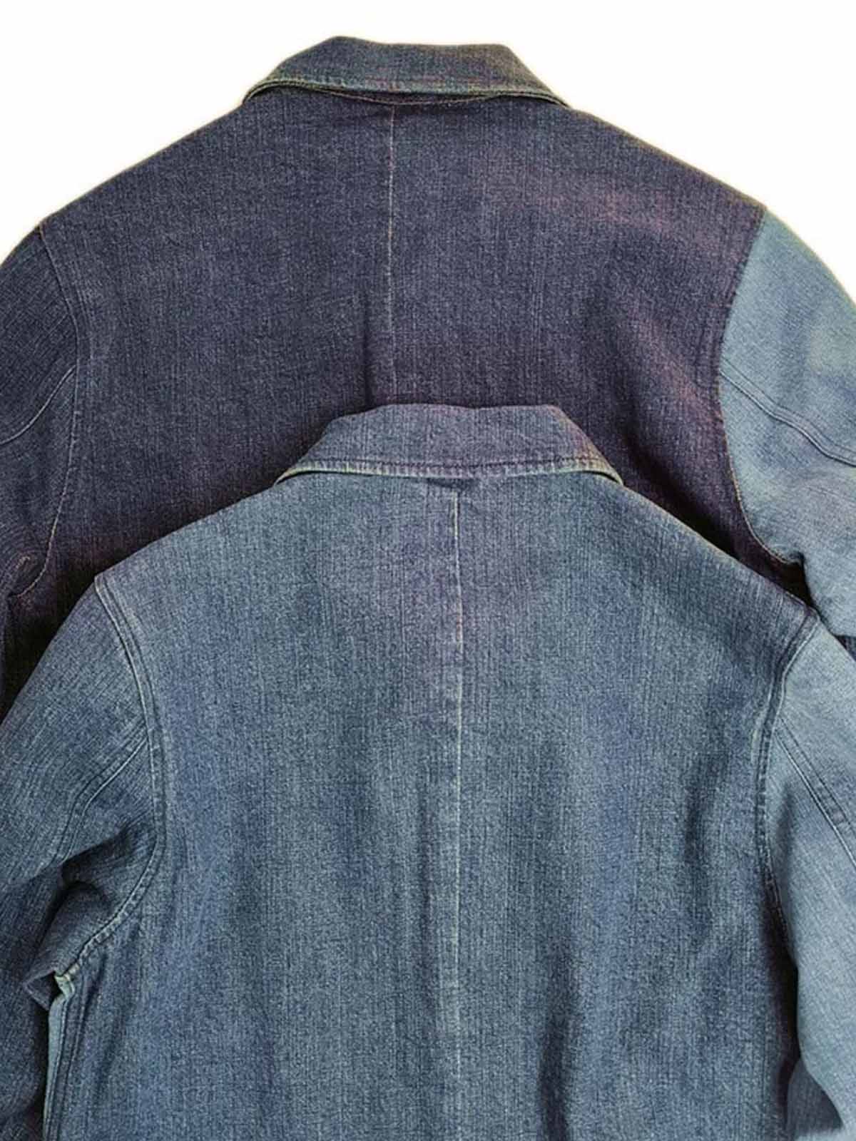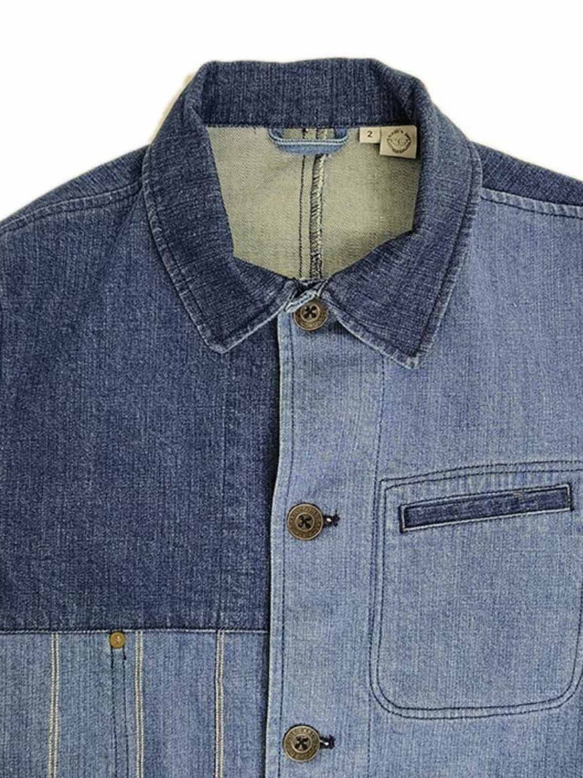 深い青と淡い青のデニム生地を巧みに組み合わせたパッチワークで、ヴィンテージ感とスリムなシルエットを両立する中長丈コートです.