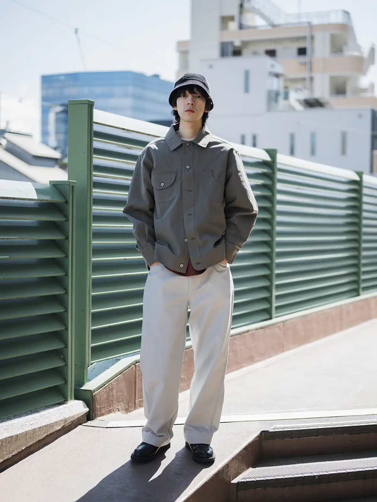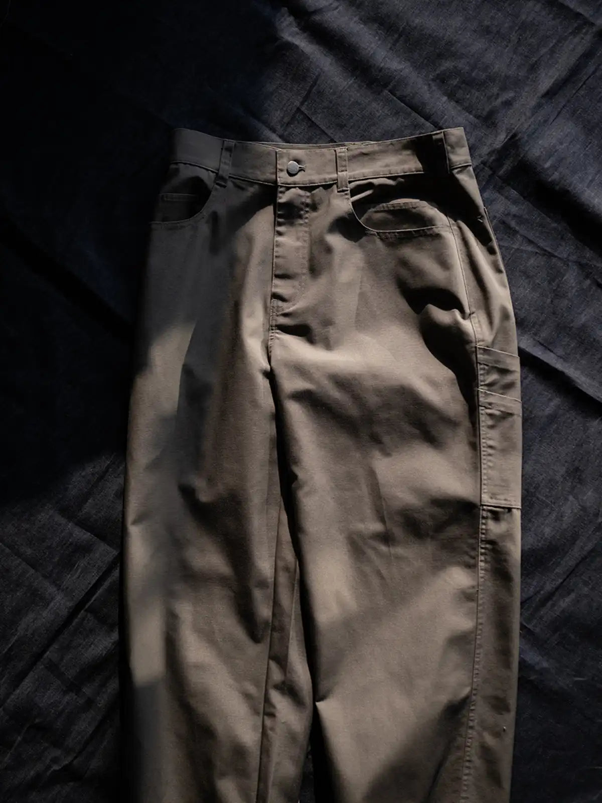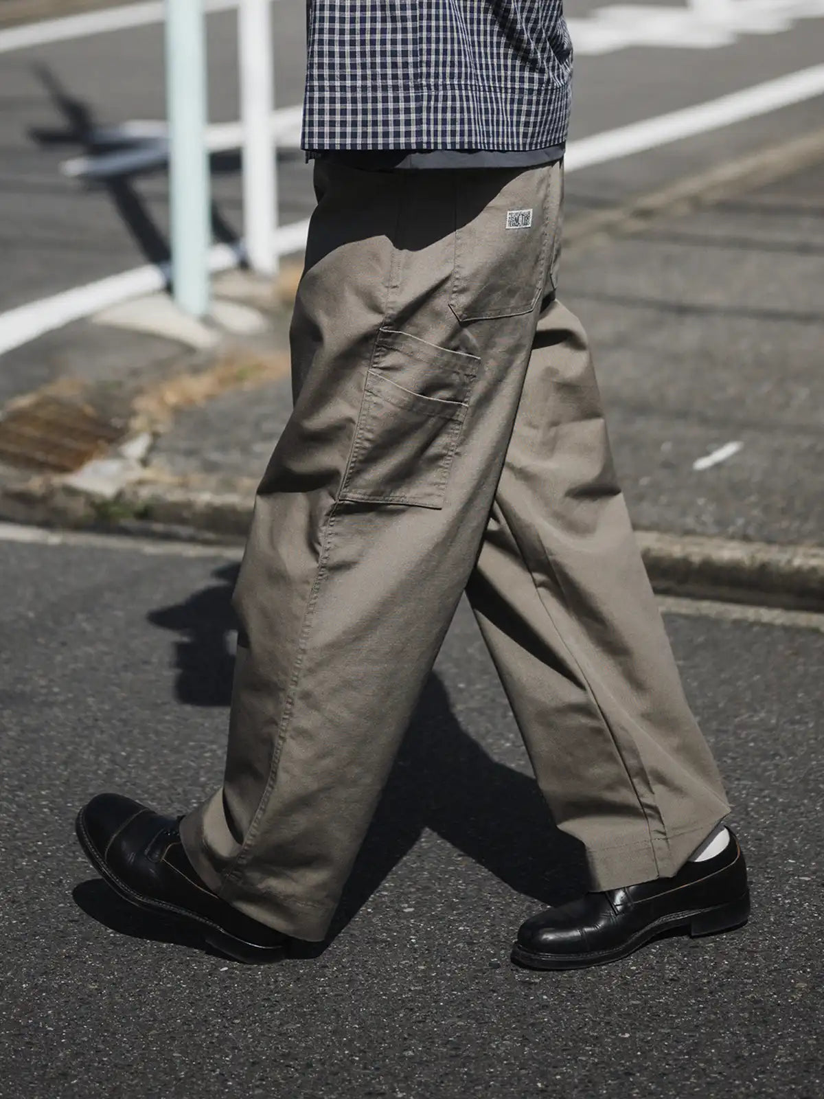 当時の作業用パンツに見られる、腰・ヒップ周りのゆったりとした設計とストレートなラインが特徴。フロントには対称のアーチ型ポケットを2つ、左脚下方に斜め貼り付けポケットを2つ、さらに背面には工具用ループ付きポケットを備え、合計8つのポケットが実用性とデザイン性を両立。ウエストベルトとベルトループを広めにとり、裾はロールアップしやすいように長めに設定。T/C(コットン×ポリエステル)混紡の珠帆(たまほ)生地を用い、酵洗加工により程よい柔らかさと骨位のアタリを演出。部分的に起毛し、洗いざらしのユーズド感を再現することで、長年着用したようなヴィンテージ感を楽しめます。