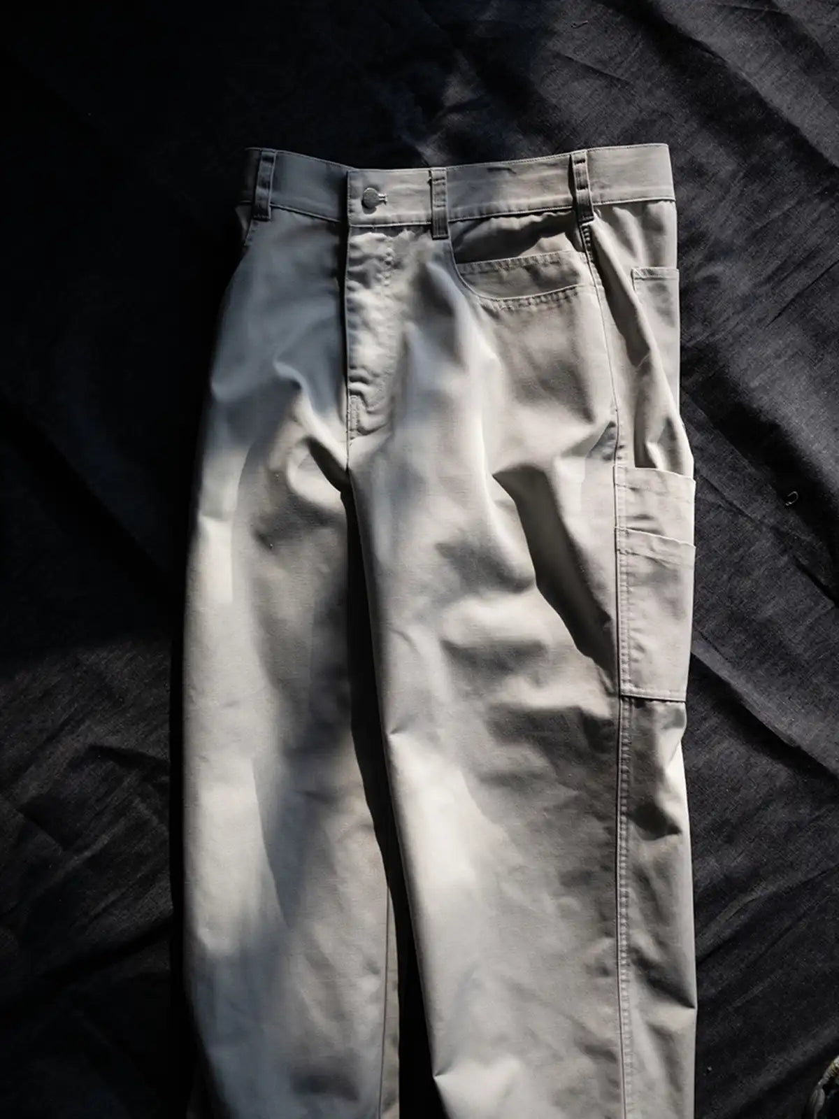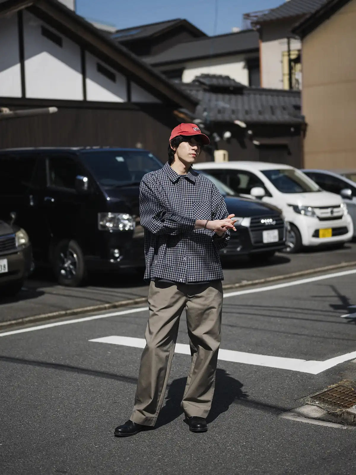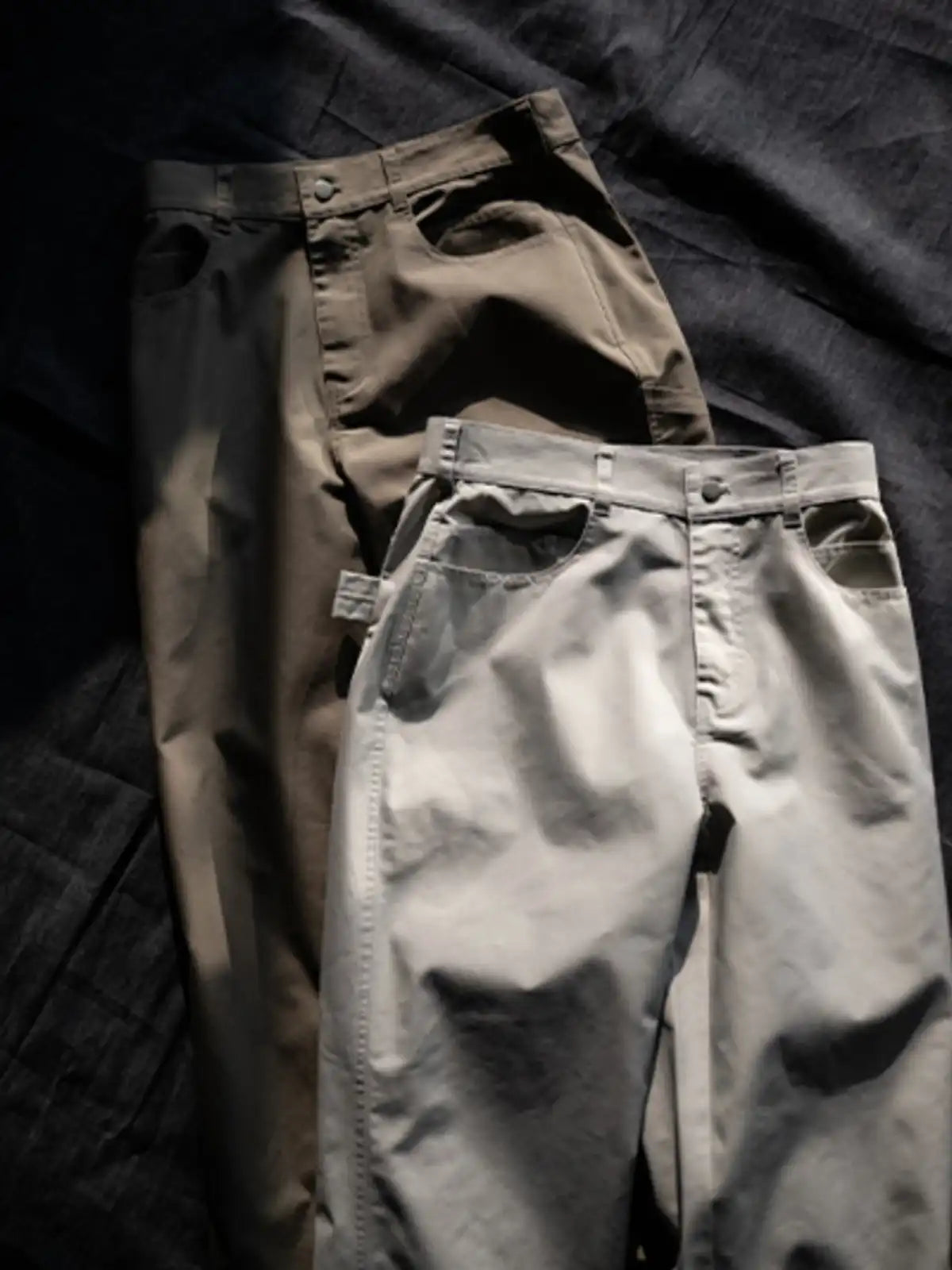 当時の作業用パンツに見られる、腰・ヒップ周りのゆったりとした設計とストレートなラインが特徴。フロントには対称のアーチ型ポケットを2つ、左脚下方に斜め貼り付けポケットを2つ、さらに背面には工具用ループ付きポケットを備え、合計8つのポケットが実用性とデザイン性を両立。ウエストベルトとベルトループを広めにとり、裾はロールアップしやすいように長めに設定。T/C(コットン×ポリエステル)混紡の珠帆(たまほ)生地を用い、酵洗加工により程よい柔らかさと骨位のアタリを演出。部分的に起毛し、洗いざらしのユーズド感を再現することで、長年着用したようなヴィンテージ感を楽しめます。