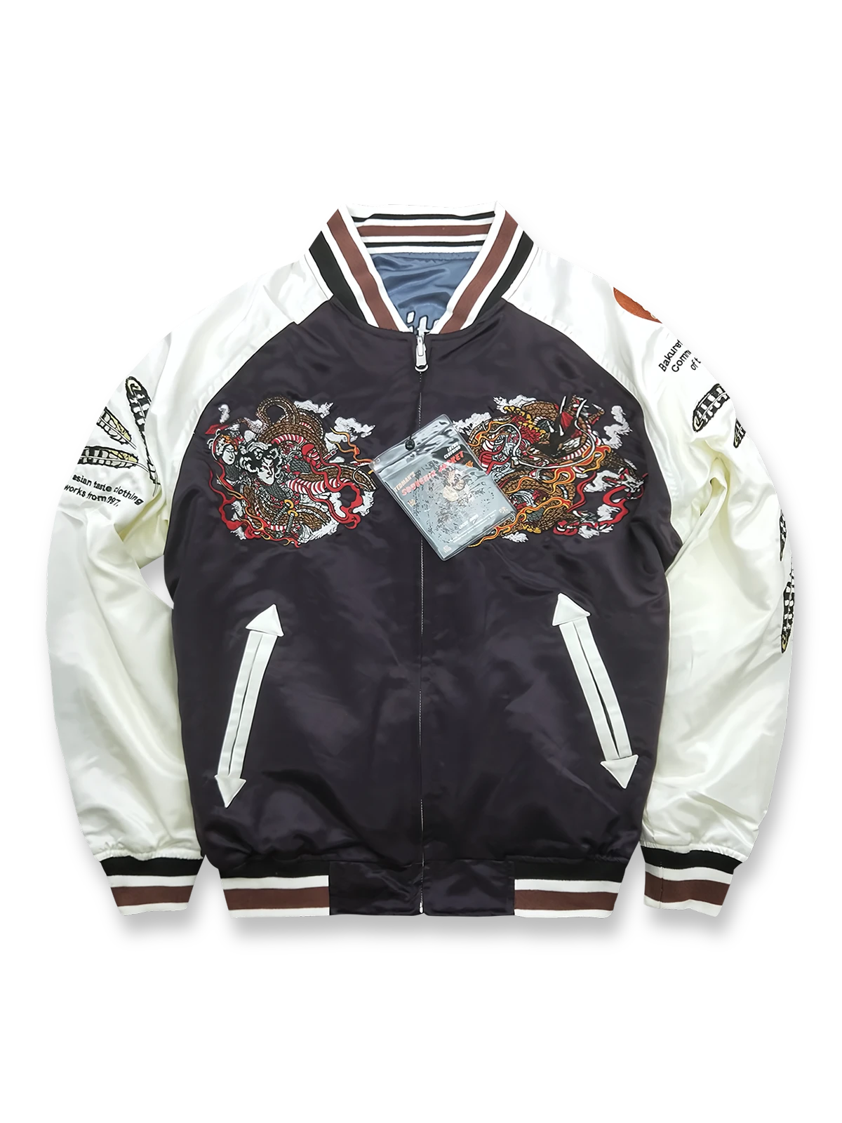 赤鬼と青龍の刺繍が両面に施されたリバーシブルシルクジャケット。和風デザインとハワイアンテイストが融合し、独特な幸運の象徴を表現。