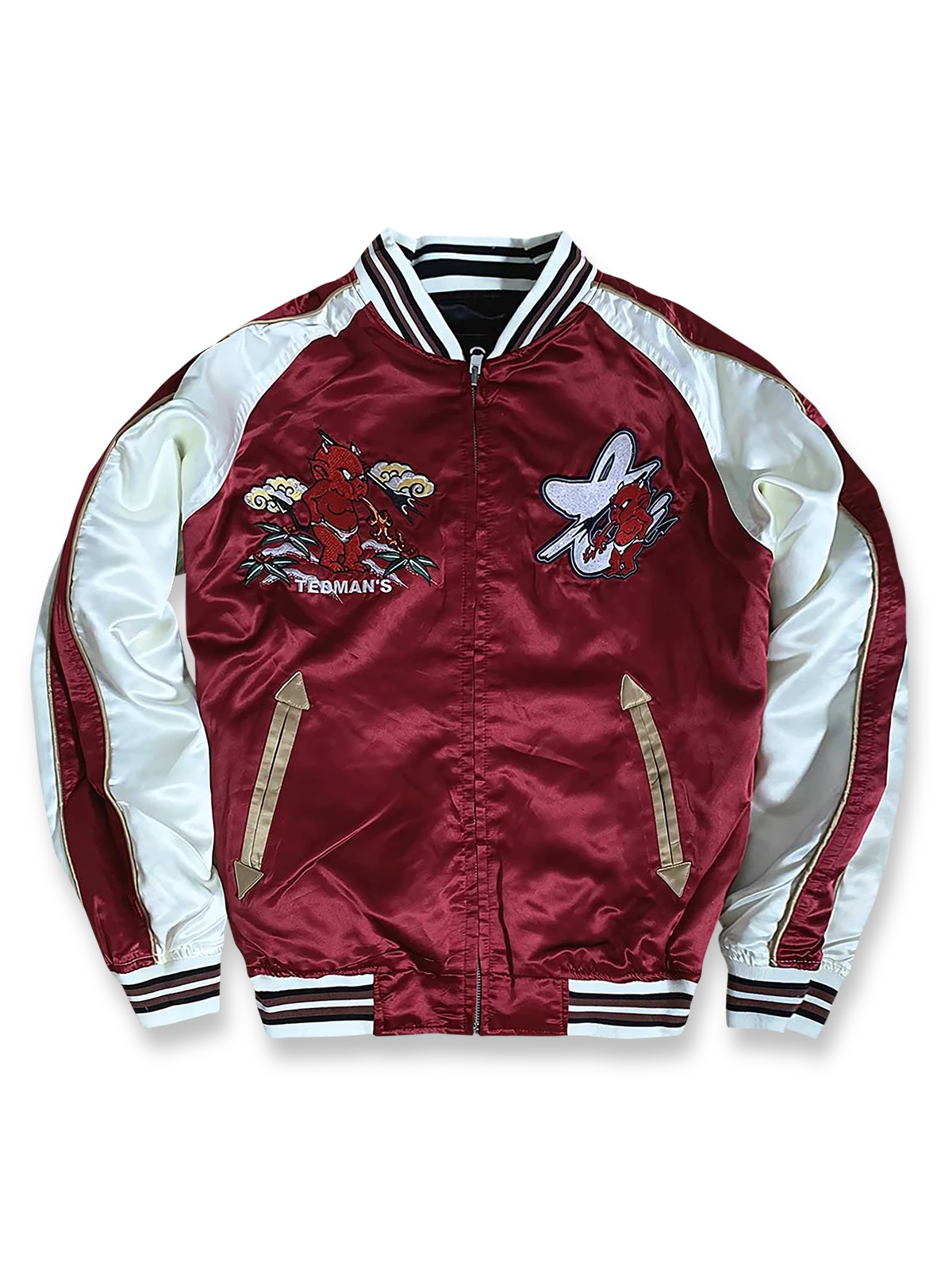 このリバーシブルジャケットは、横須賀風の伝統刺繍技法で丁寧に仕上げられており、一方には福運を象徴する「七福神」が宝船に乗る姿が描かれ、吉祥と豊穣の意味が込められています。もう一方には「赤鬼」と「虎」の刺繍が施され、力強さと守護を象徴する斬新なデザインが特徴です。高級シルク生地を使用しており、滑らかで上品な光沢感が際立ちます。シルク刺繍は綿やナイロンの刺繍に比べて高度な技術を要し、繊細な仕上がりが特別感を演出しています。一針一針に職人の魂が宿り、ファッションアイテムとしてだけでなく、コレクション価値のある芸術作品としても楽しめます。ヴィンテージスタイルや文化的な深みを求める男性に最適で、独自の個性と品位を引き立てます。