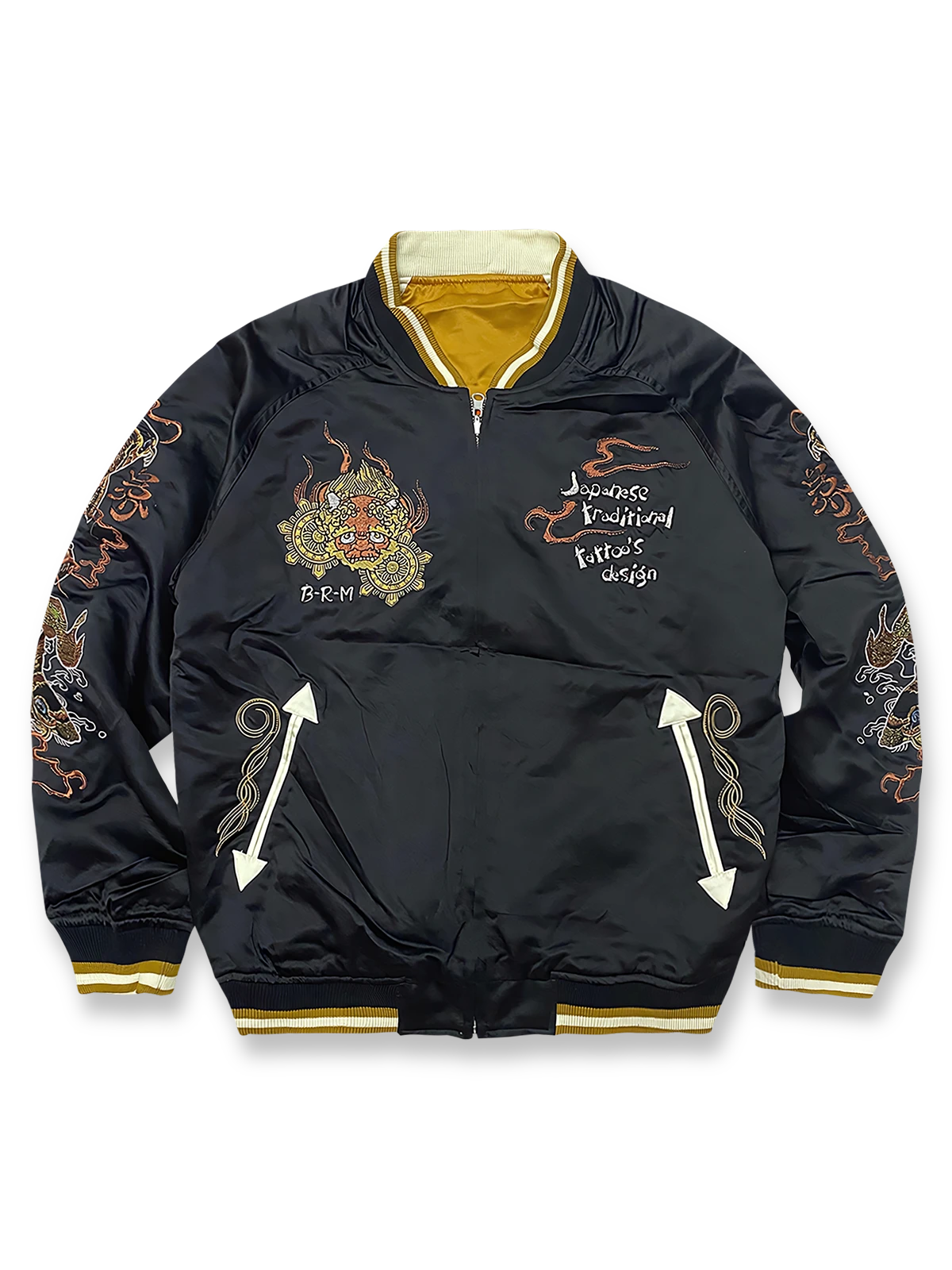 このリバーシブルジャケットは、片面はシルク素材に富士山、波、クジラの刺繍が施され、自然の美と勇気の象徴としてデザインされています。もう片面はベルベット素材に鬼若丸の戦いの場面が描かれ、日本の伝統的な英雄の姿が表現されています。異なる素材と刺繍テーマが組み合わされることで、勇敢さと力強さが強調されています。全体にわたる精緻な刺繍技術により、豊かなディテールが際立つ日本の伝統を感じさせるデザインが特徴です。日常のスタイリングにもコレクションにも最適で、ヴィンテージとアートの融合を求める方にふさわしい一着です。