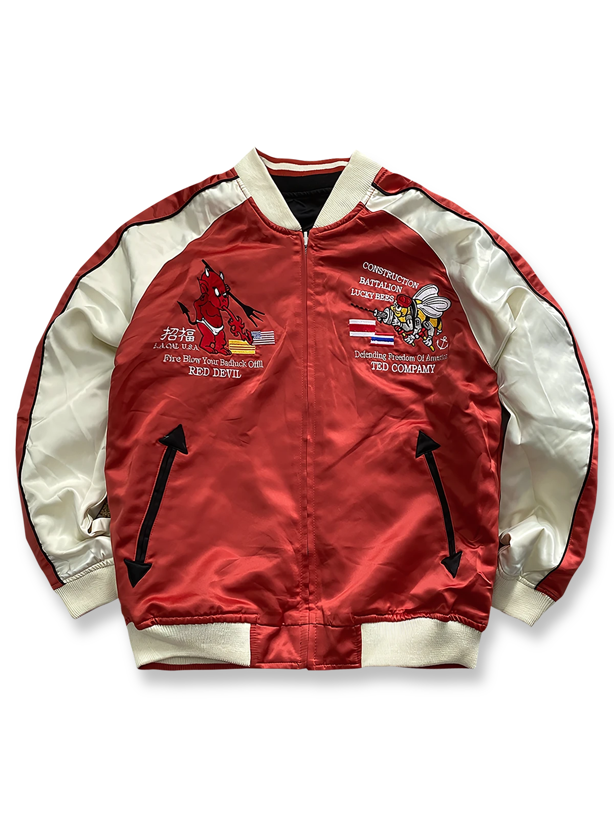 このジャケットは、リバーシブル刺繍デザインで、横須賀風の刺繍技術とアメリカ文化の要素を組み合わせています。一方には「テッドマン」(幸运の赤鬼)をテーマに、ハワイ四島の風景やアメリカ海軍のモチーフが背景に描かれ、テッドマンのイメージが異国風情と力強さを演出します。もう一方には、和の文化と音楽を融合させた「着物ギタリスト」をテーマとした刺繍が施され、伝統と現代の交錯が印象的なデザインです。刺繍は細部まで丁寧に仕上げられ、鮮やかな色彩が際立ちます。サテン素材の滑らかな質感と光沢が、精緻な刺繍技術と相まって、日常のスタイリングにも、コレクションとしても適しています。個性とヴィンテージを愛する方に理想的な一着です。