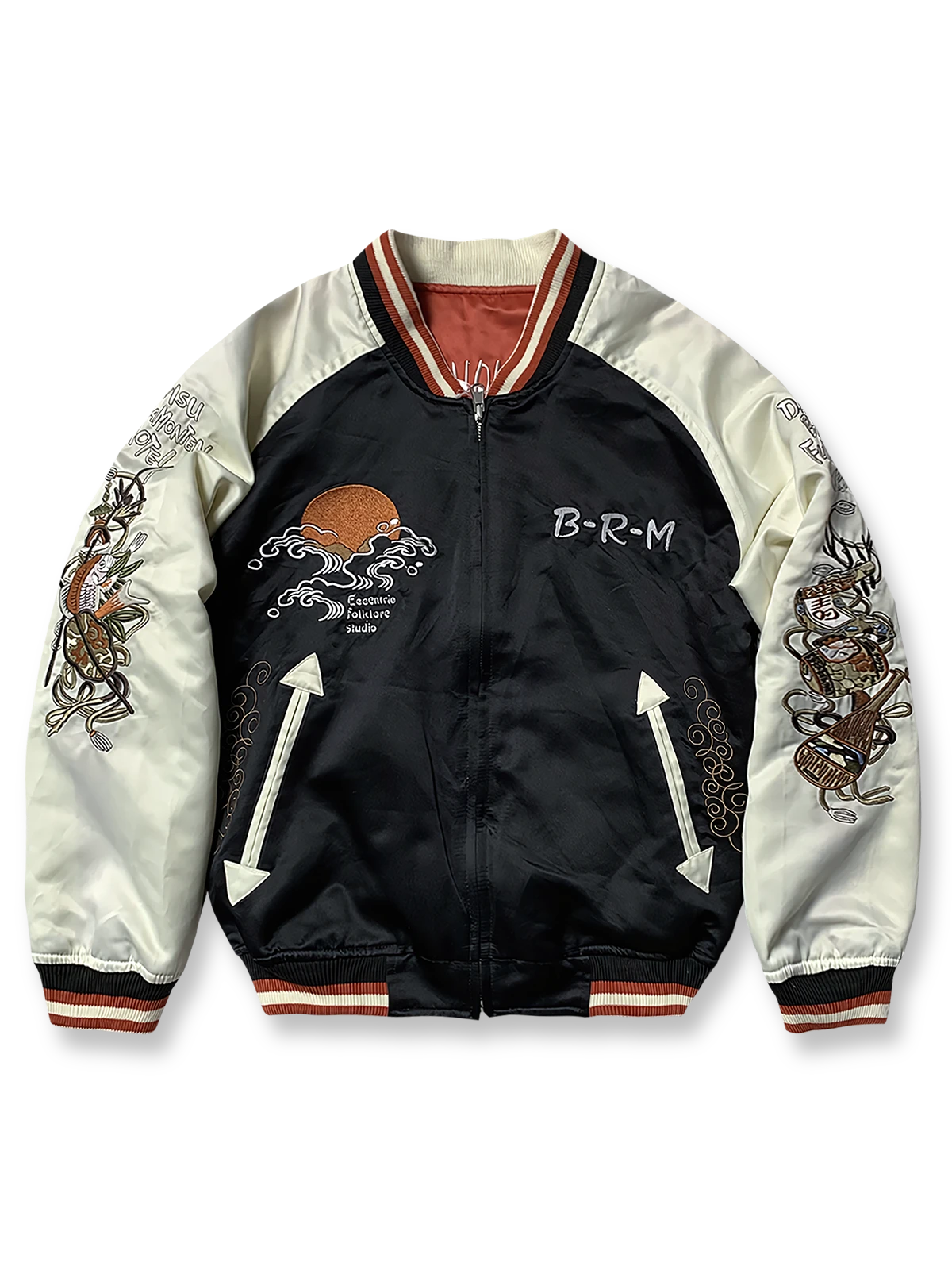リバーシブル刺繍デザインで、「Fortune Favors the Bold」(幸運は勇者を好む)の図案が横須賀刺繍の伝統文化と芸術を表現する一着。