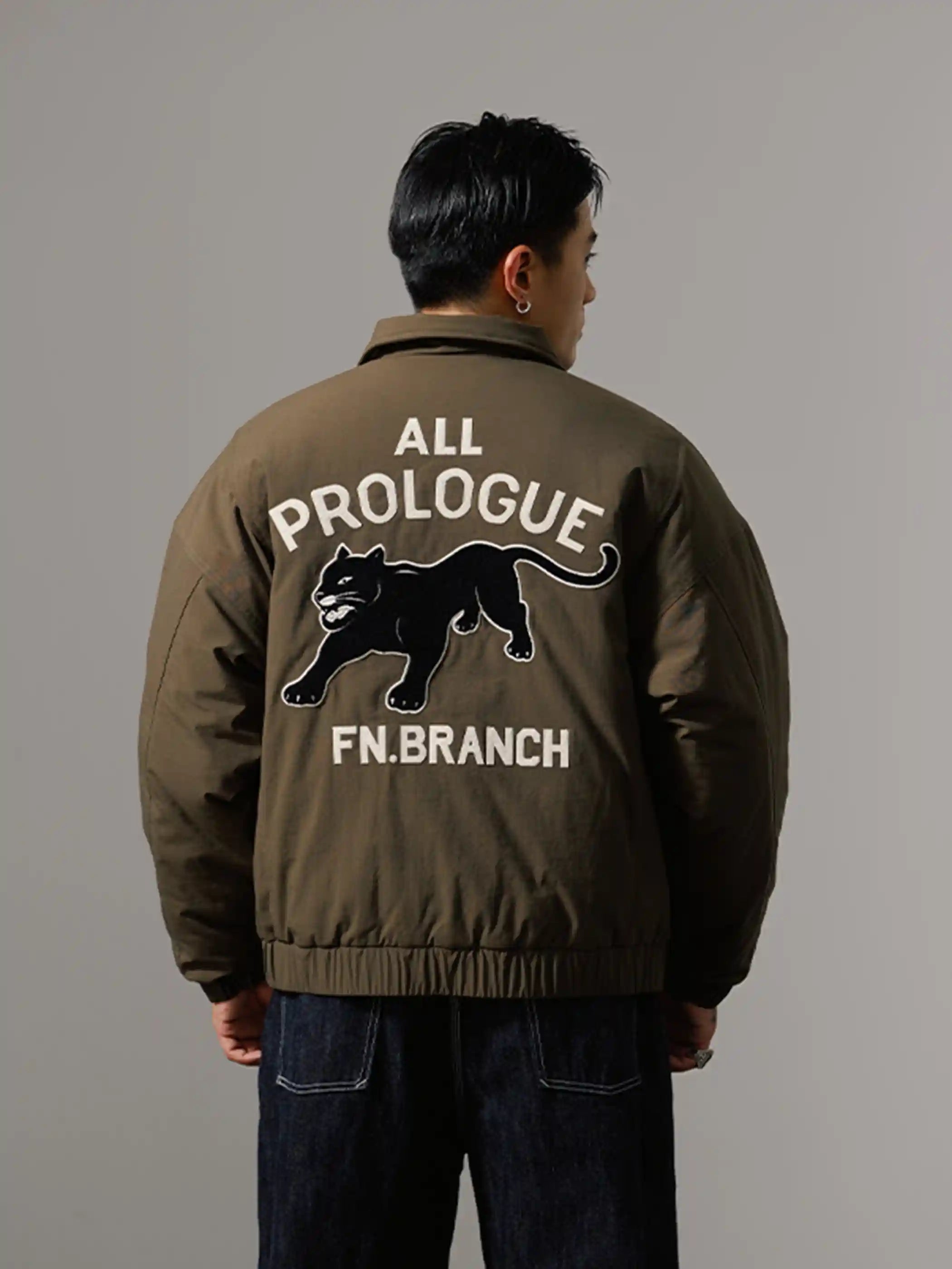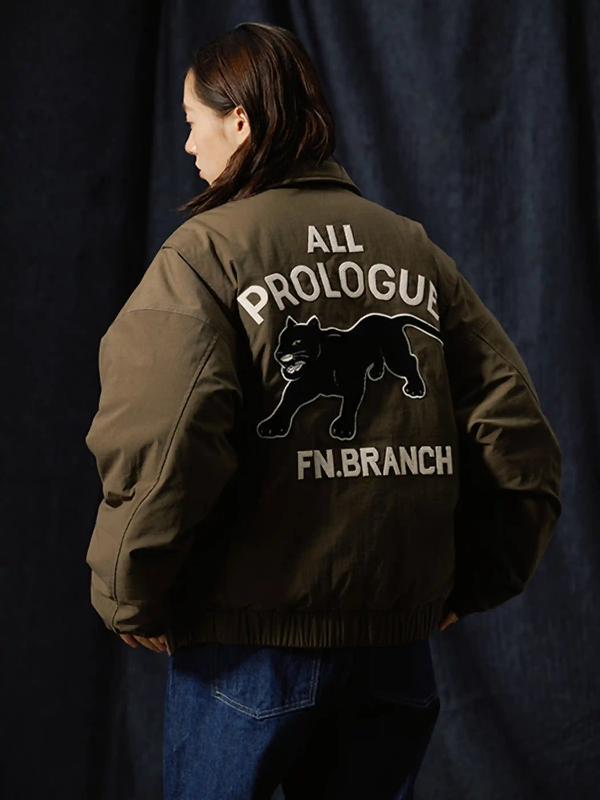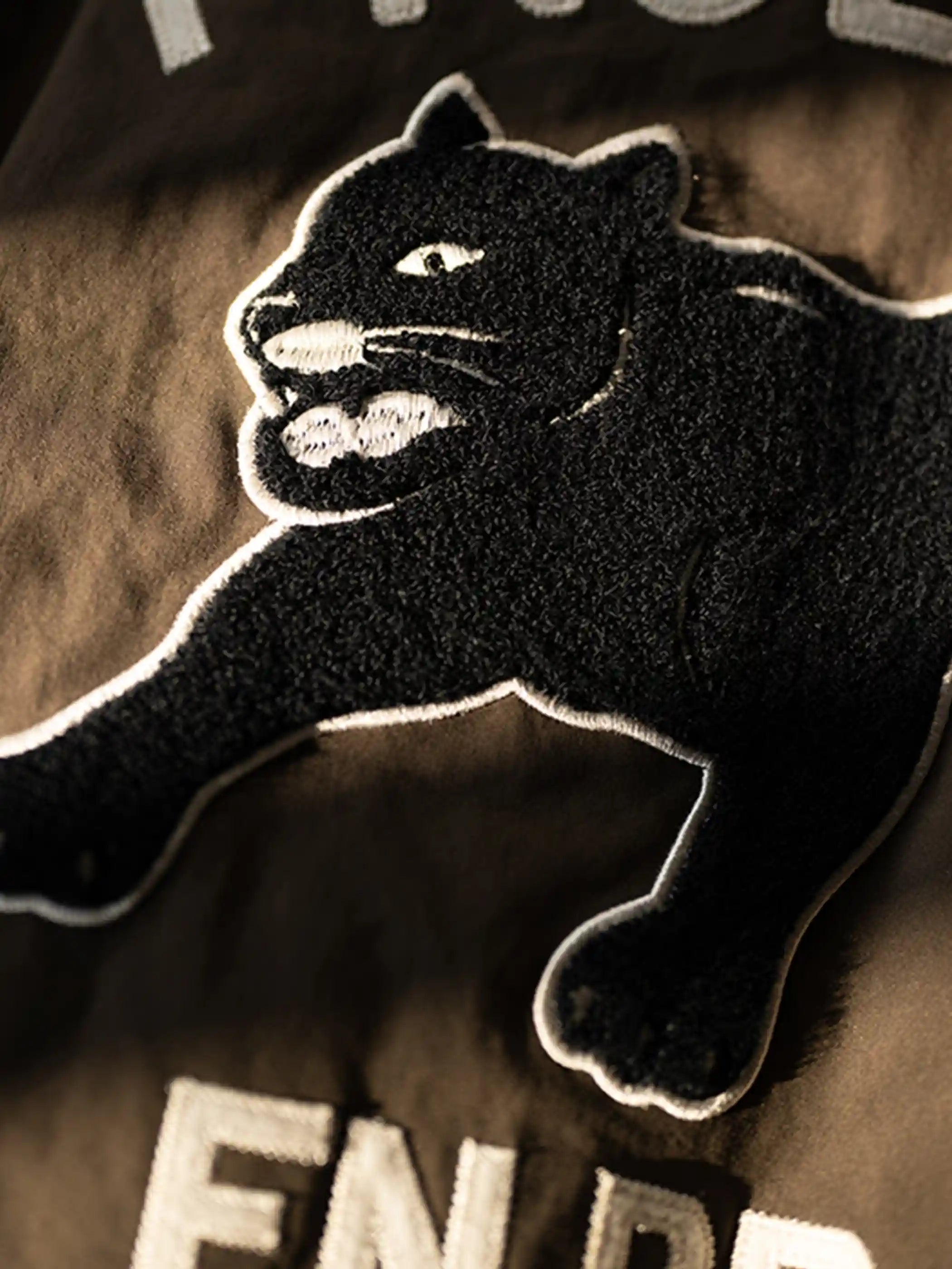 背面のブラックパンサーをはじめとする複数の刺繍ディテールが目を引く一着。表地は230gの皺感あるポリエステル生地を使用し、マットな光沢と独特のテクスチャーを演出。裏地には600gのツイル状フリース(ポリエステル)と200gの新雪丽Thinsulate™中綿を採用し、軽さと高い保温性を両立。短丈でゆったりとしたルーズフィットが特徴で、ヴィンテージ感漂う硬派な雰囲気と現代的なストリートスタイルを融合させたアイテム。秋冬シーズンのカジュアルからデイリーユースまで幅広く活躍。