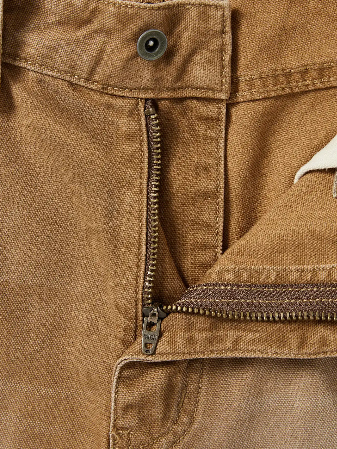 ミリタリーのヘリテージをベースに、耐久性に優れる280g/m²純綿帆布と経年変化を楽しめるタンレザーを組み合わせ、ヴィンテージウォッシュで奥行きのある表情を実現しました。脇に配したロープネットポケットはギア収納の実用性を確保しつつ、アウトドアとストリートの狭間で際立つデザインアイコンに。TALONジッパーと真鍮製ハードウェアが硬派なムードを高め、タックインしたシャツやミリタリーブーツとのコーディネートも自在。膝上丈のルックスが夏のアクティブスタイルに最適です。