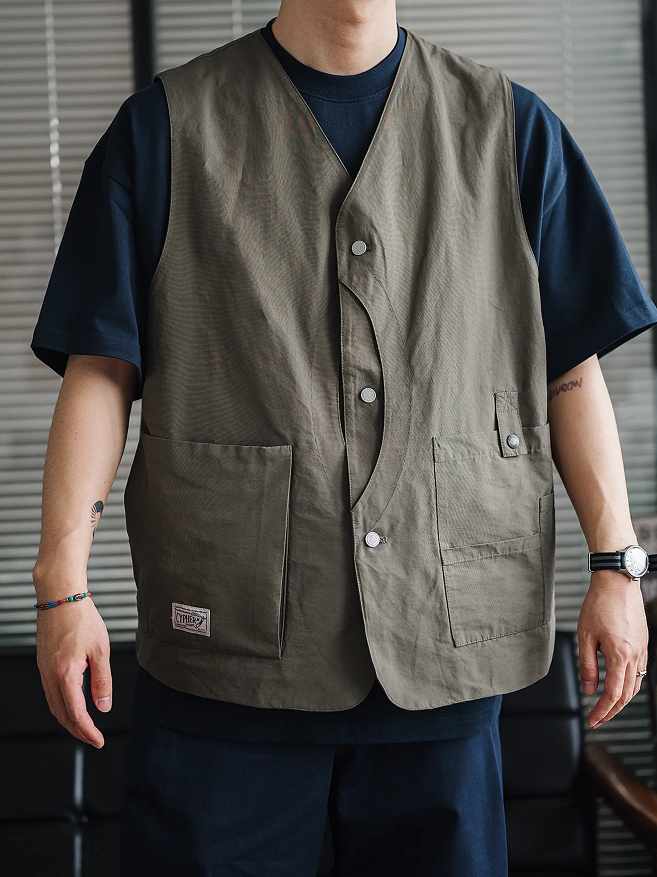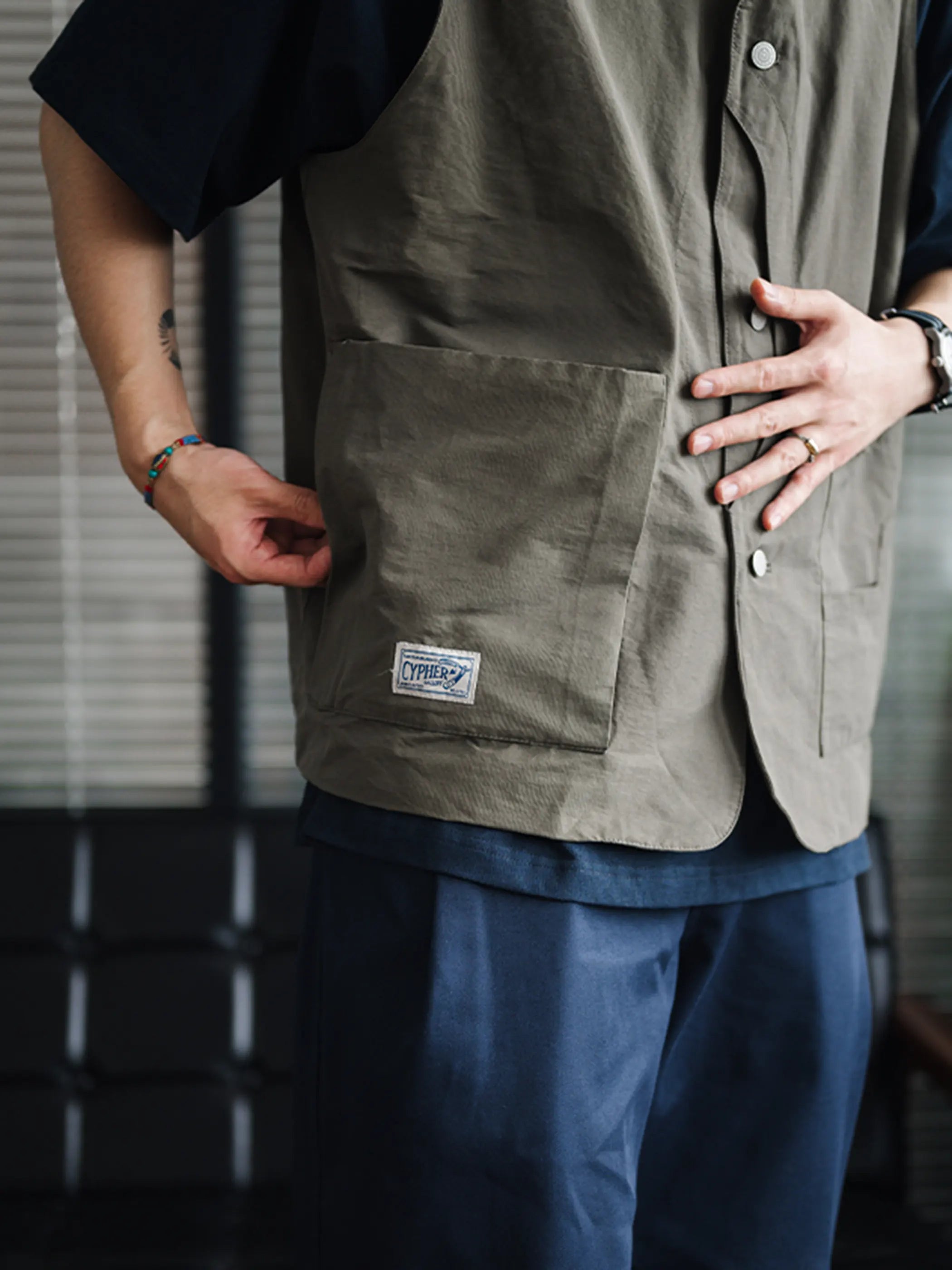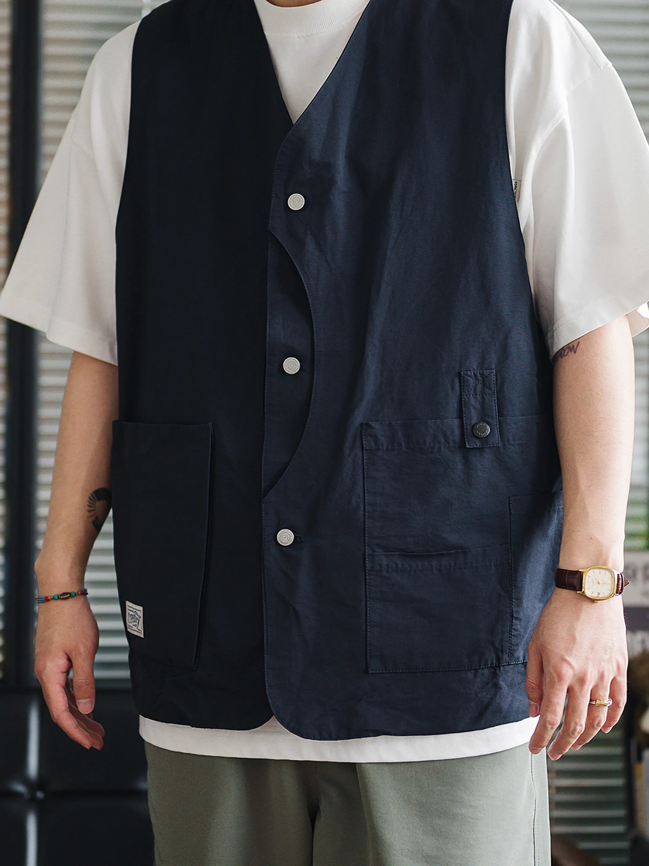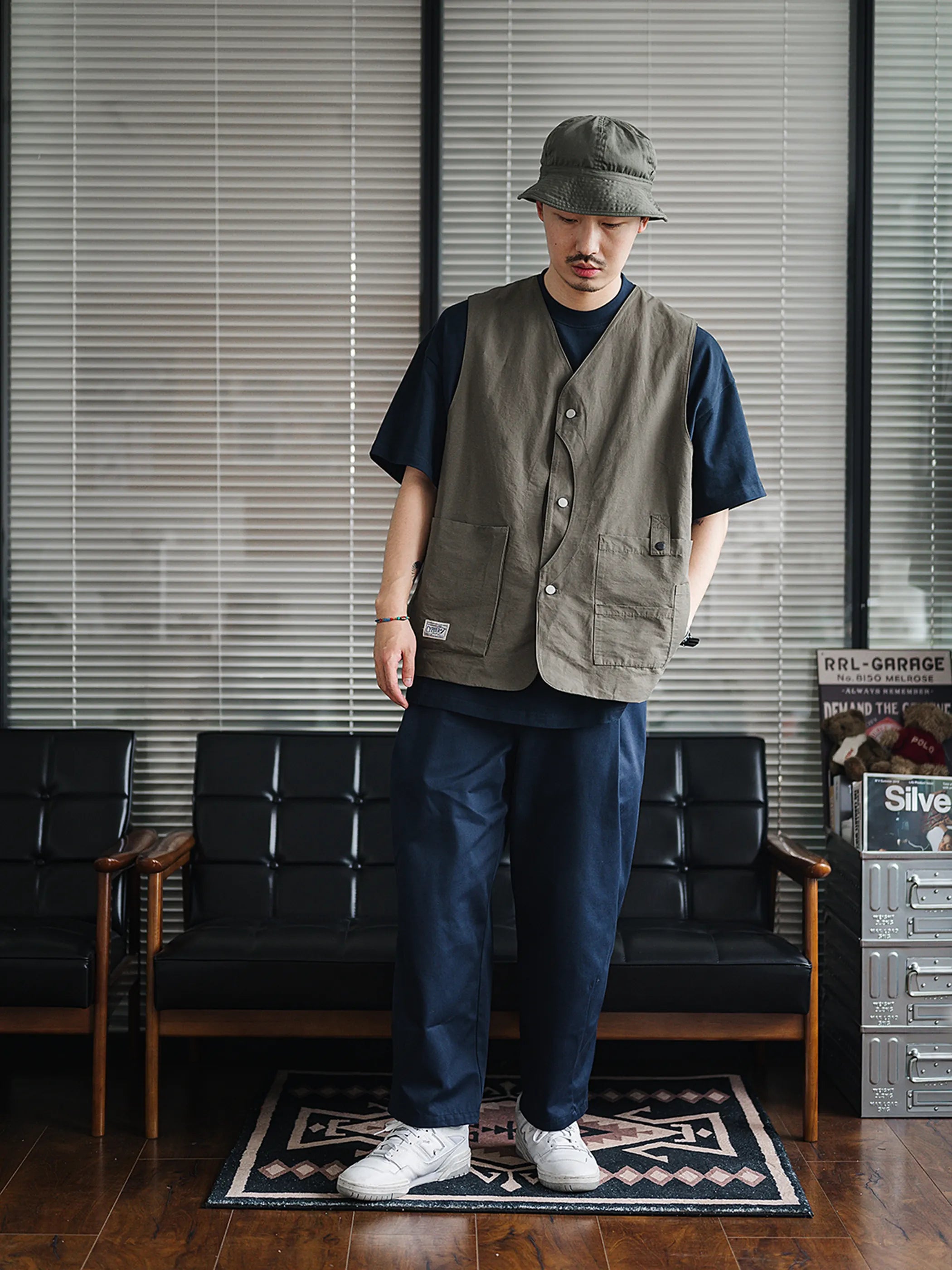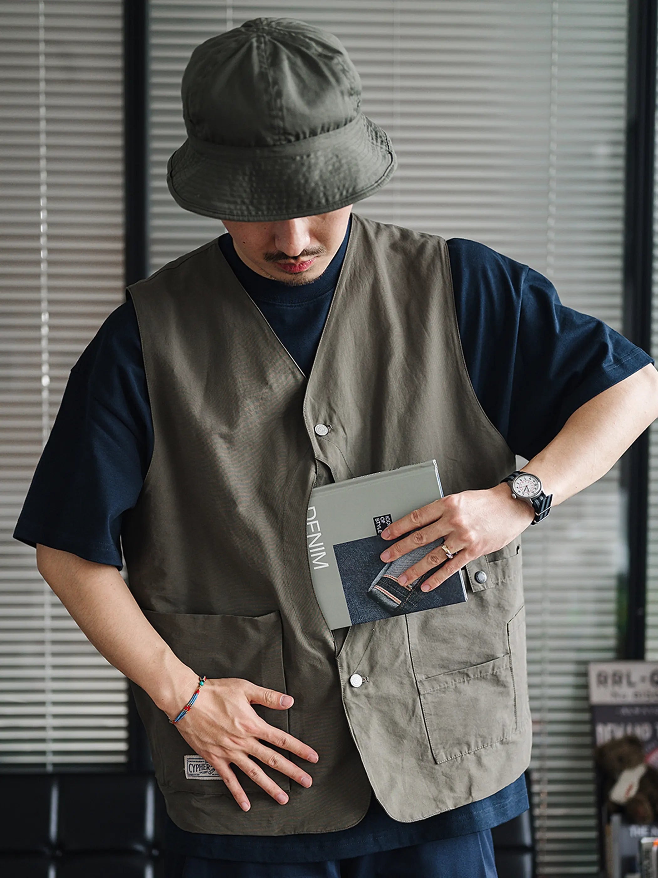 1930年代のCanvas Hunting Vestを原型に、モダンなルーズフィットと多機能ポケットデザインを融合した改良ハンティングベスト。