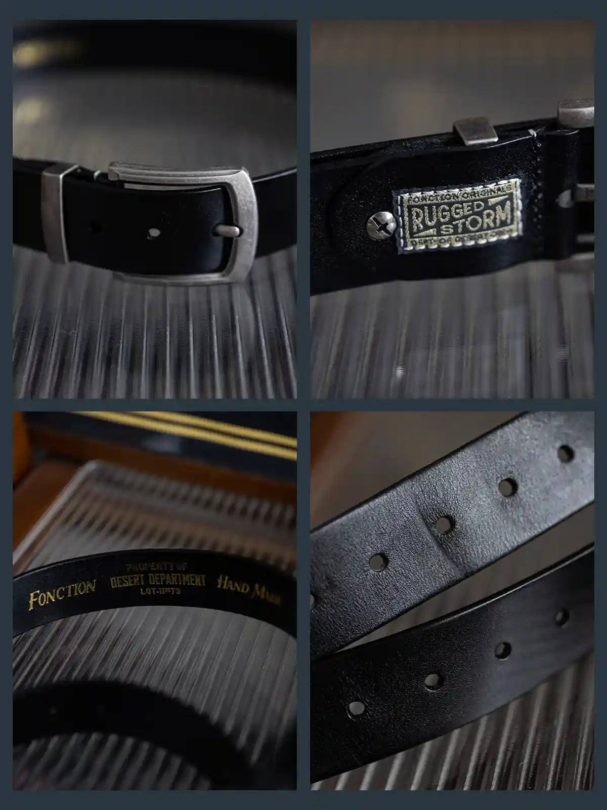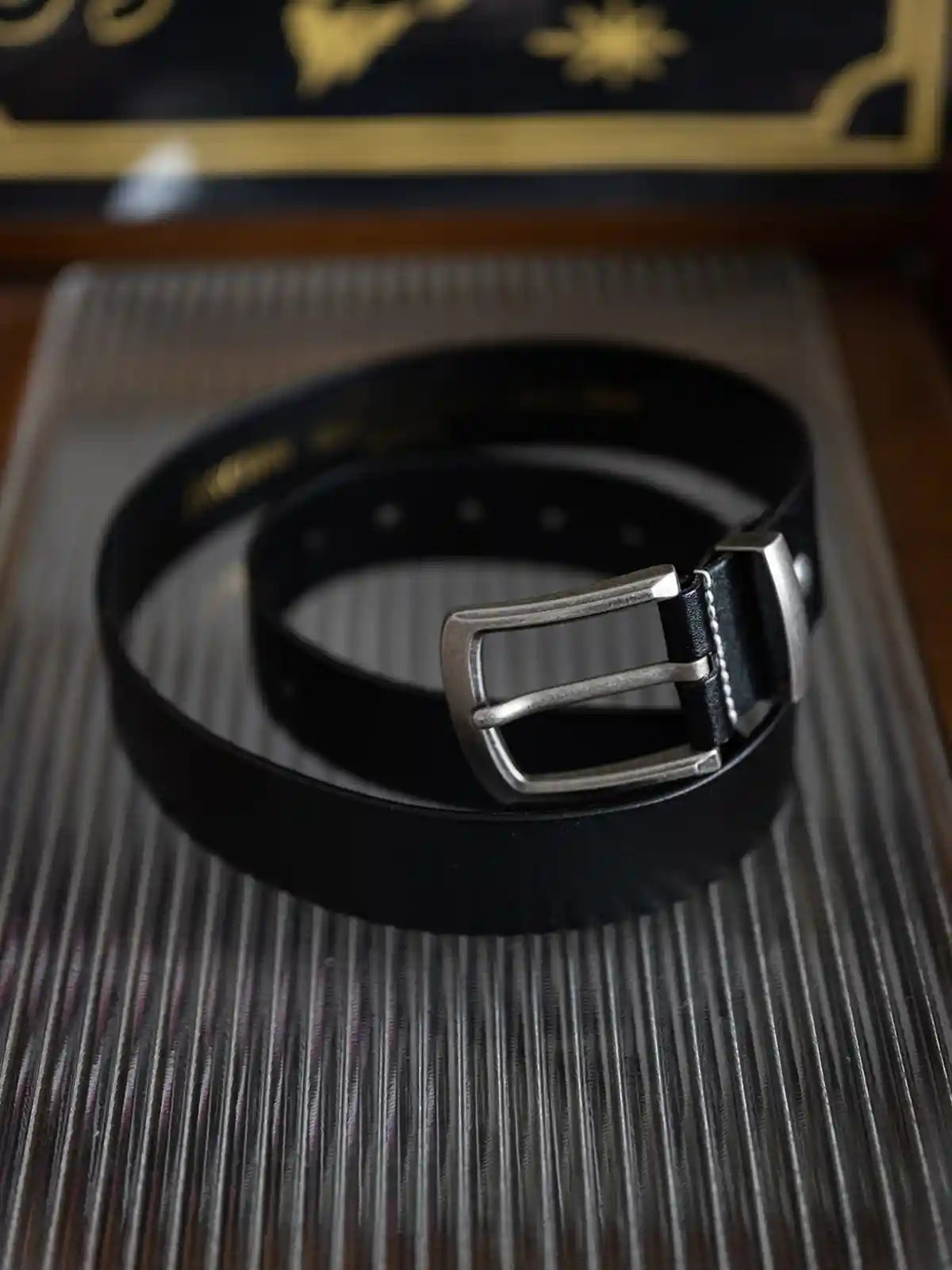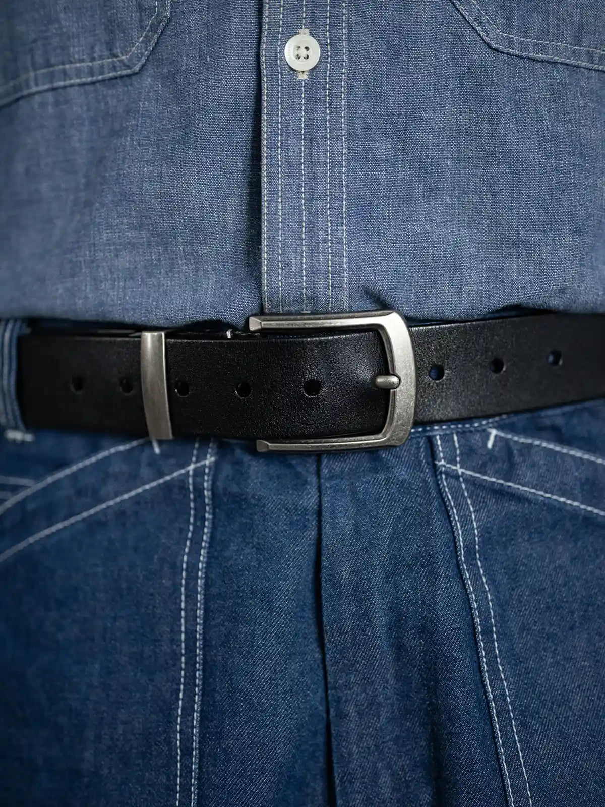 1930年代のワークプラングベルトをベースに、厚み3.6〜3.8mmの植物タンニンなめし牛革を採用。使い込むほどに自然なエイジングを楽しめ、マットな質感と自然な経年変化が魅力です。バックルと調整金具はヴィンテージ調のアンティークシルバーニッケル仕上げで、クラシックな趣を強調。ジーンズやワークパンツとの相性が抜群で、日常使いから個性的なスタイリングまで幅広く対応します。