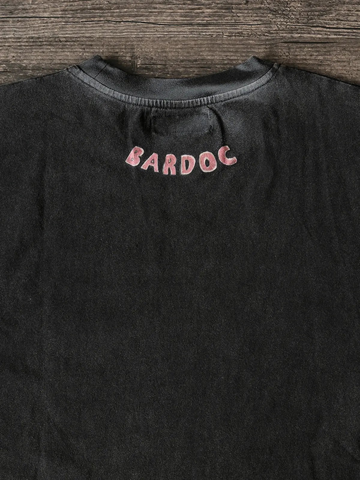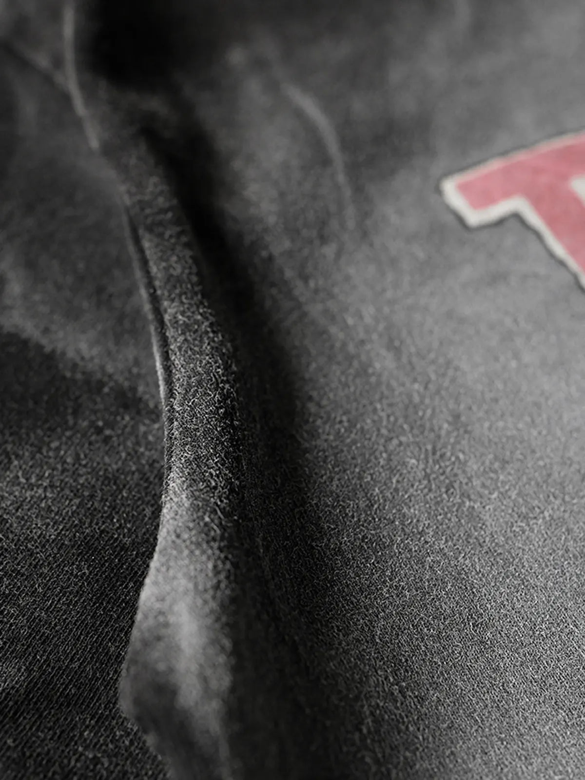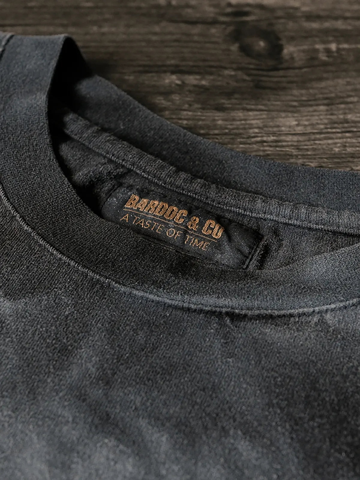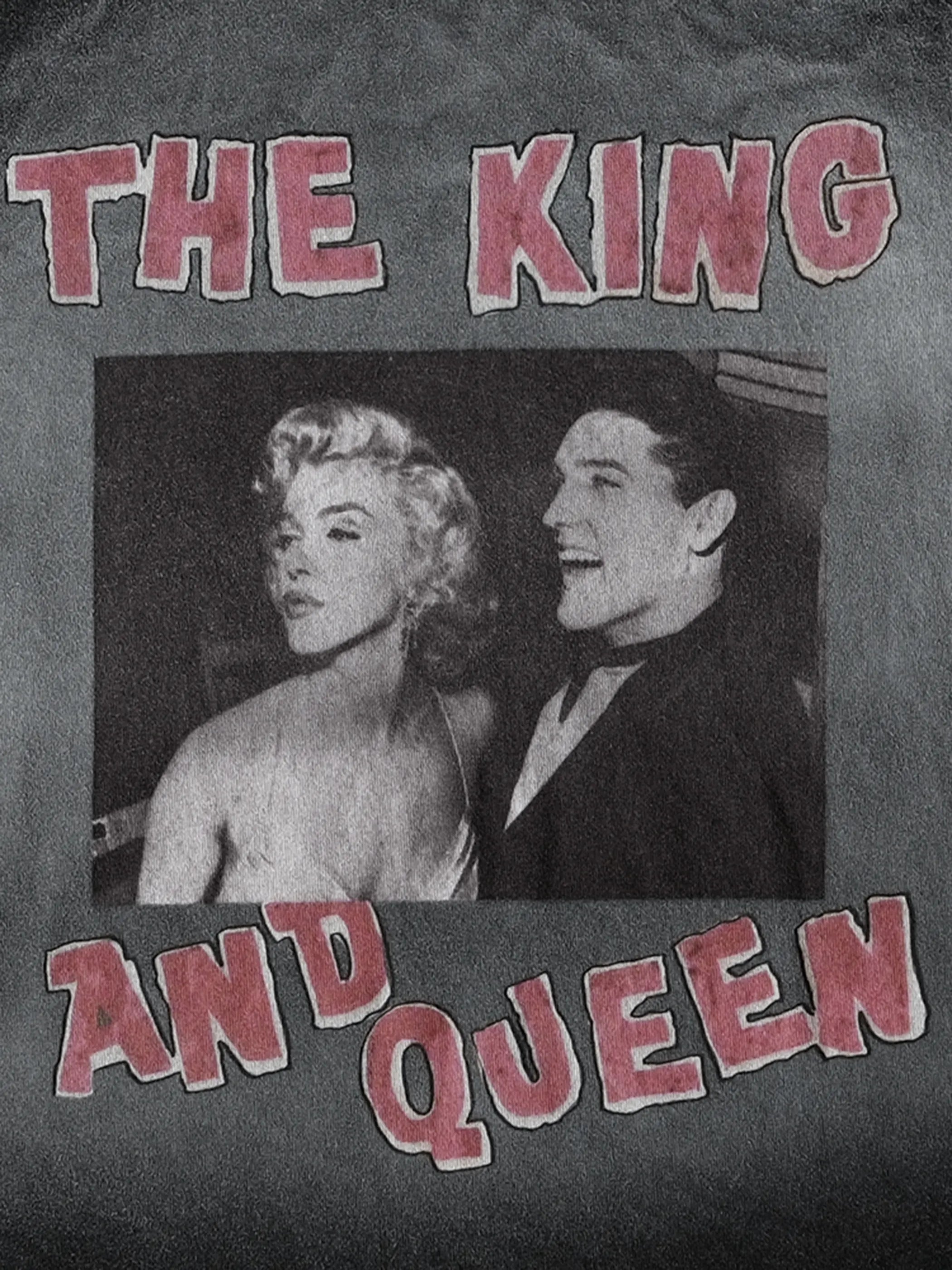 伝記作家ロバート・ゴットリーブの「ガルボの次に魅力的なのはモンローとエルヴィスだ」という言葉に着想を得て、夢の共演ショットを直喷プリントとウォッシュド加工で仕上げました。中肉厚のコットン素材は着込むほどに味わい深くなり、黒からグレーへの自然なグラデーションが1970年代ヴィンテージTを彷彿とさせます。ステッチや縫製も堅牢で、細部にまでこだわった作りが日常のカジュアルスタイルに重厚感をプラスします。