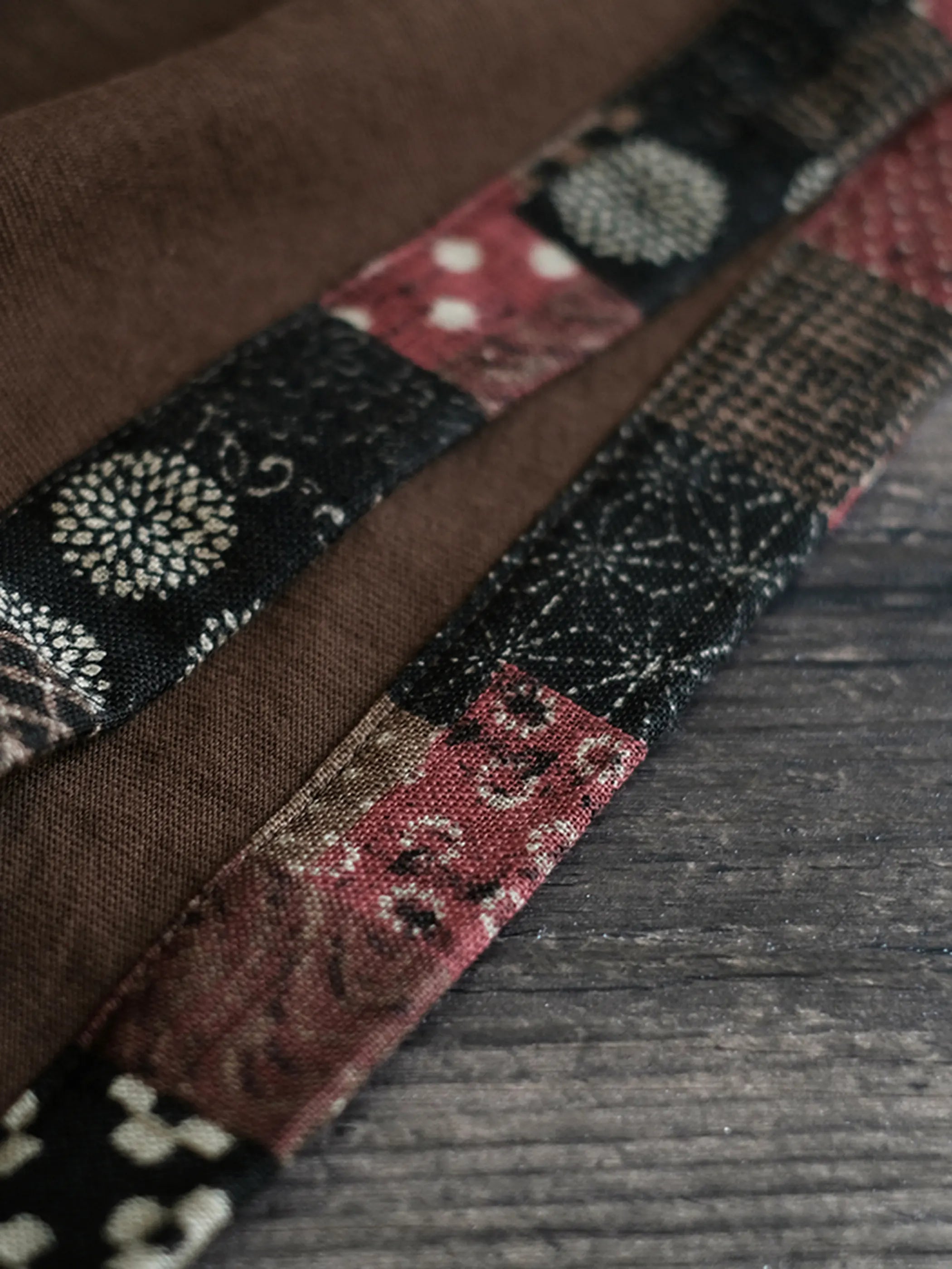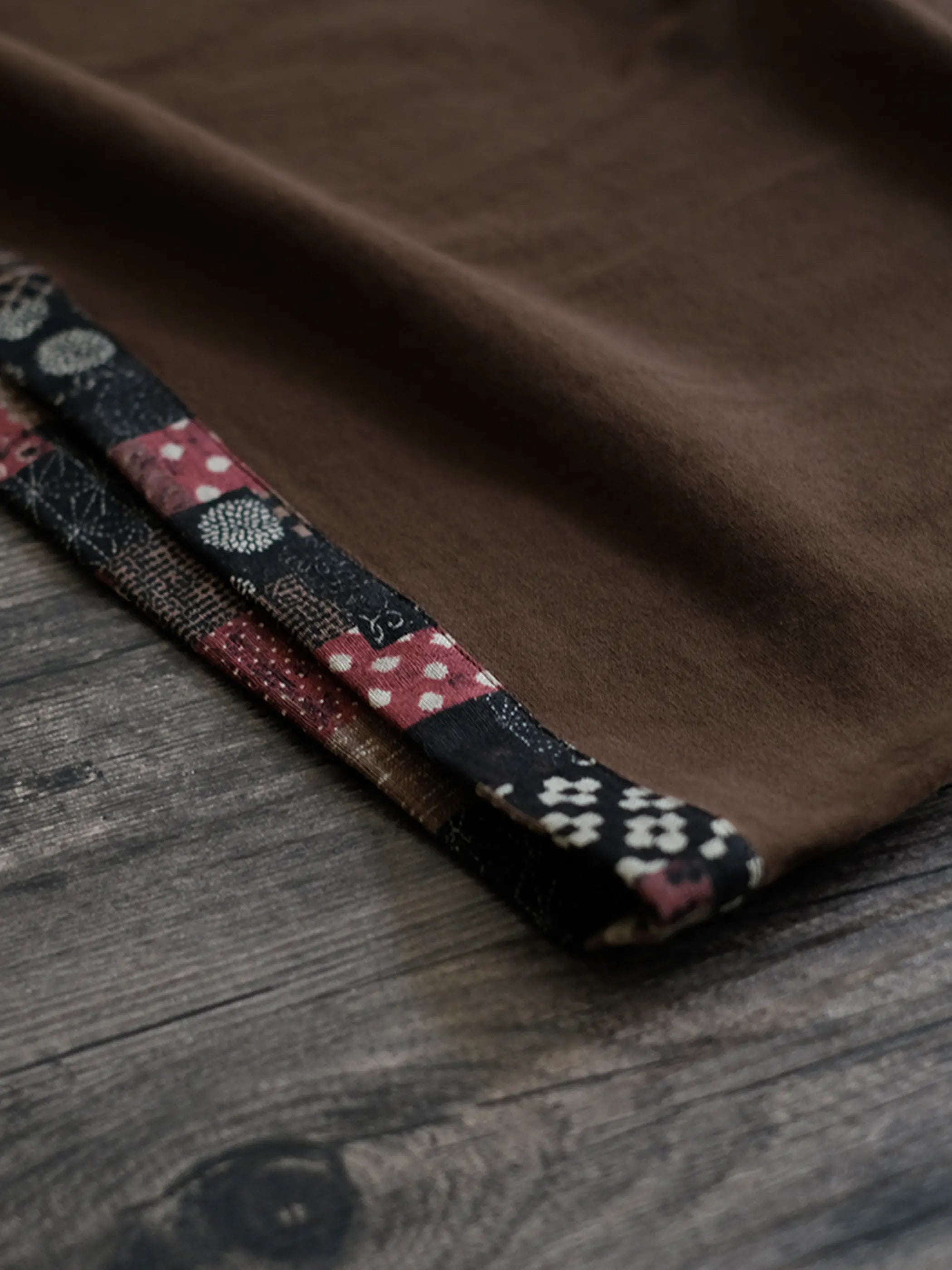 古董丸胴織機で編み上げた240g/m²の重厚コットン生地は、泥土色の織り染めによる深みのある風合いを実現しつつ、裾に日本製の伝統和柄パッチをランダムに配することで一枚ごとに異なる表情を生み出しています。合身シルエットは1980年代のフレンチクルーネックTを踏襲し、上下左右シームレスな丸胴構造が着心地と耐久性を高め、デニムやチノとの相性も抜群です。