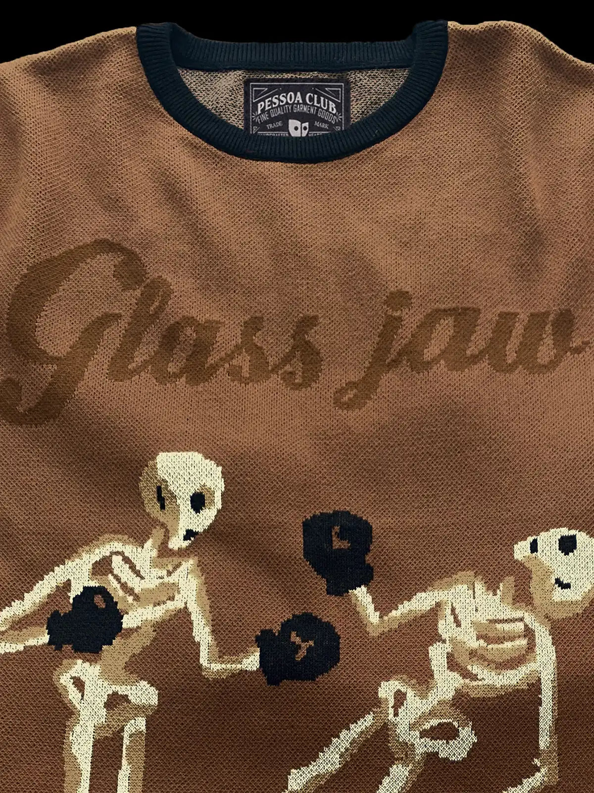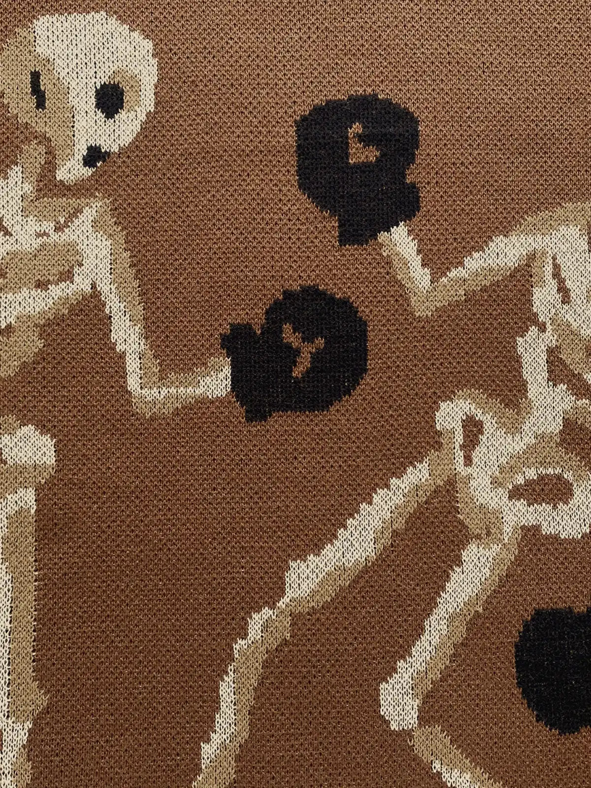 往年のアメリカンボクシングポスターを彷彿とさせるスケルトンファイター柄を、表情豊かなジャカード編みで表現。中薄手のニット素材は軽やかで通気性が高く、リブカラーの配色切り替えが絶妙なアクセントに。ほどよいフィット感とゆとりあるシルエットで、単体でもレイヤードでもレトロワーク×ストリートのミックススタイルが完成します。