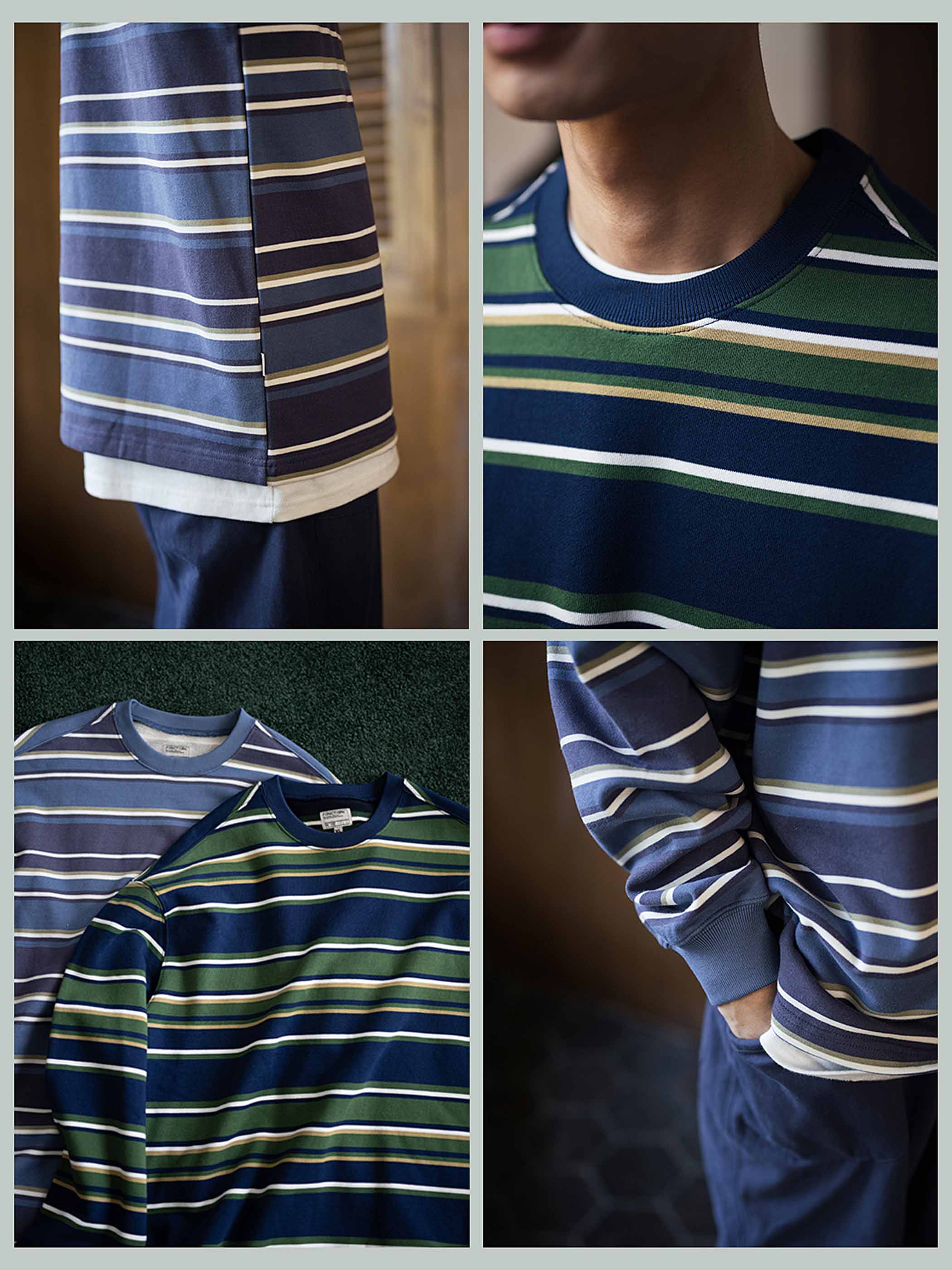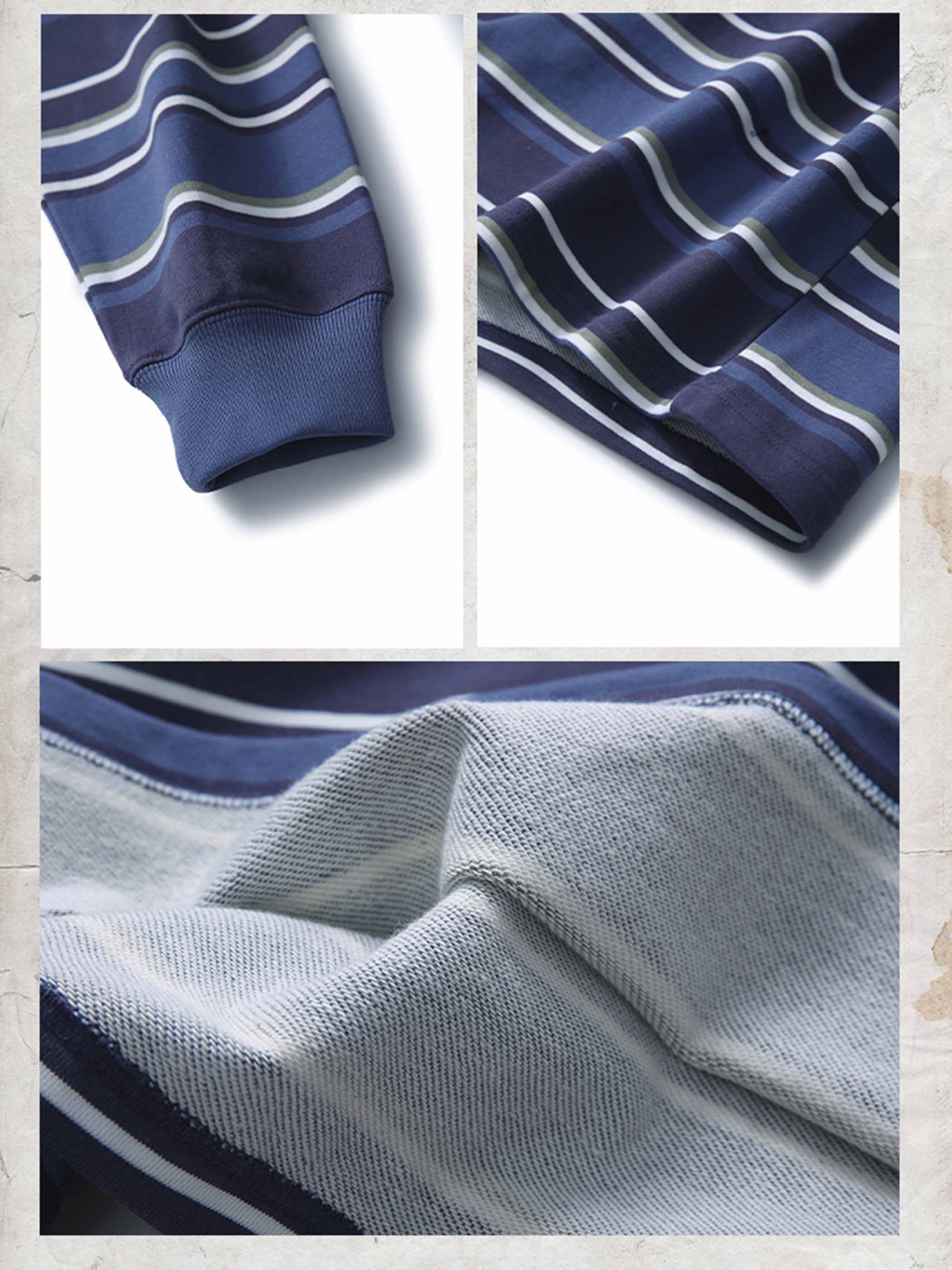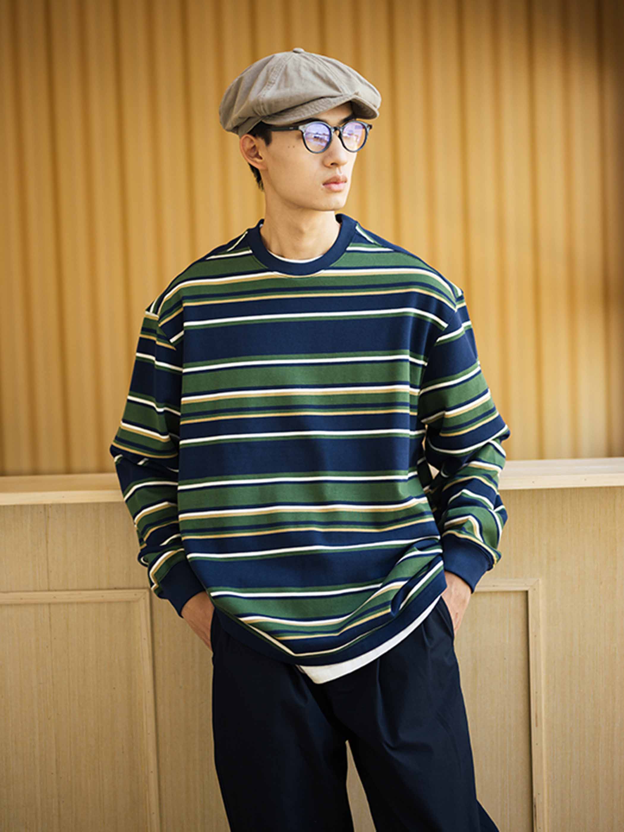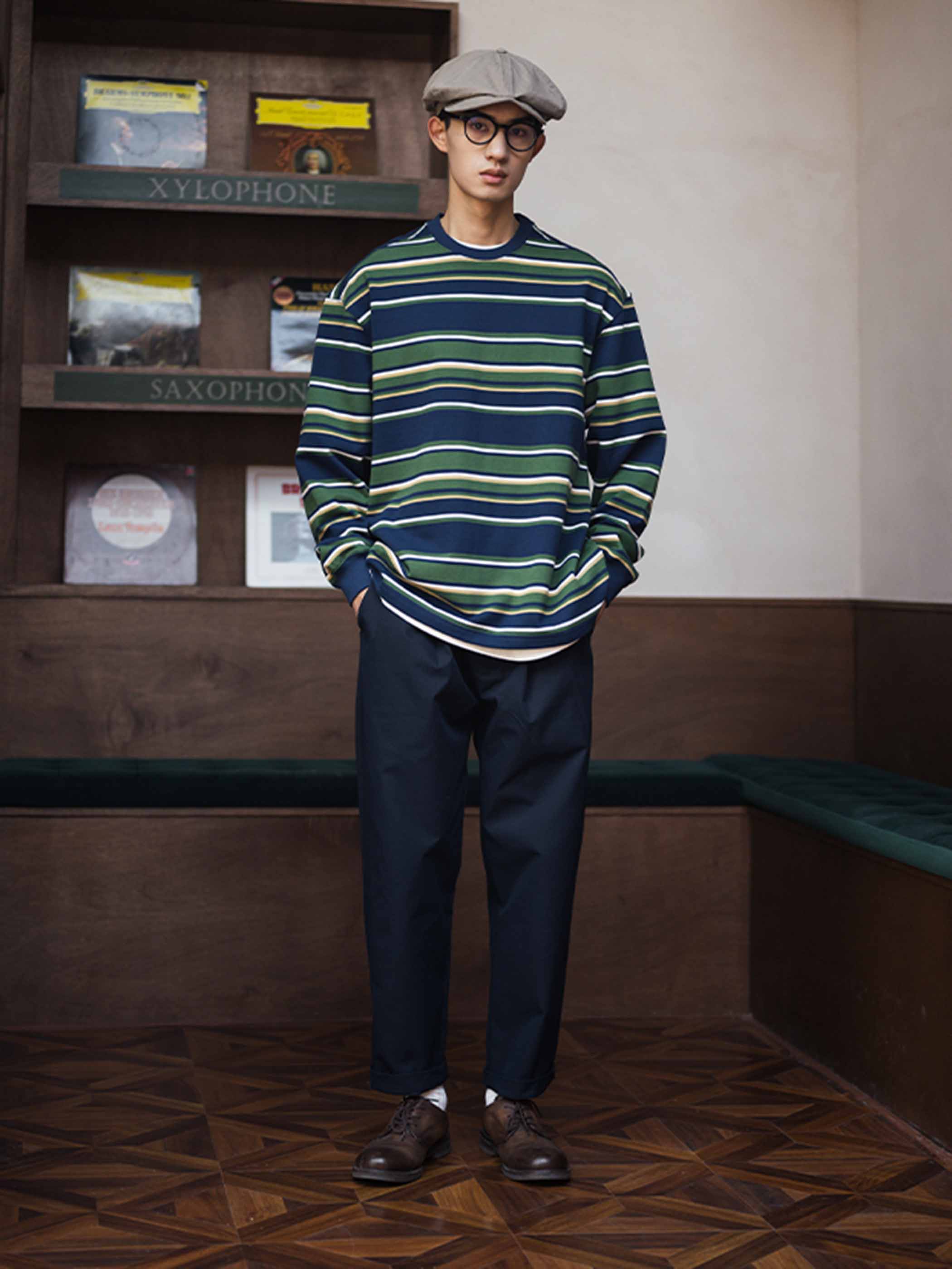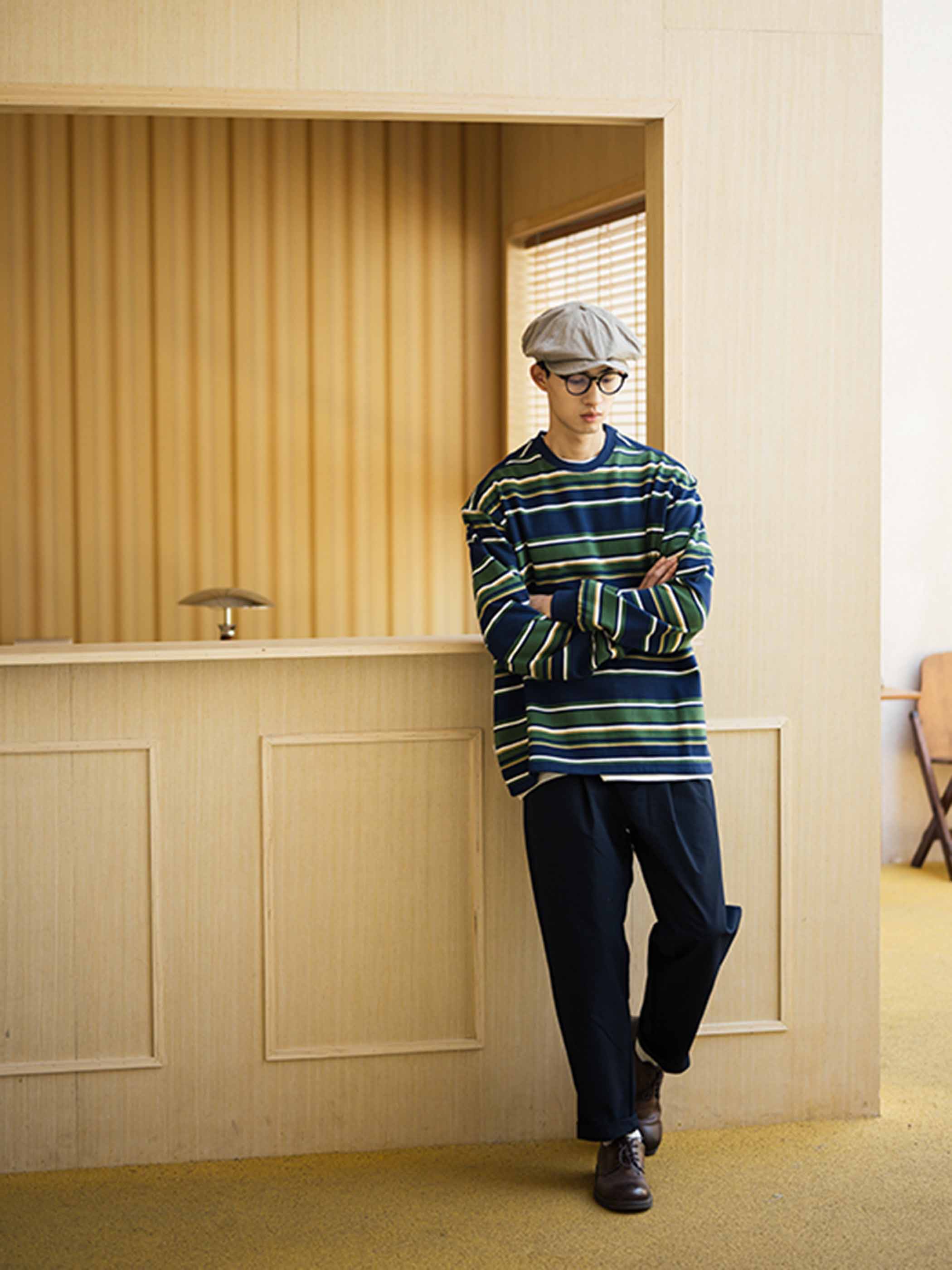 高克重の定織ストライプ生地を使用し、しっかりとした硬さと復古感を実現し、快適さと秋冬の保温性を兼ね備えた一着です。