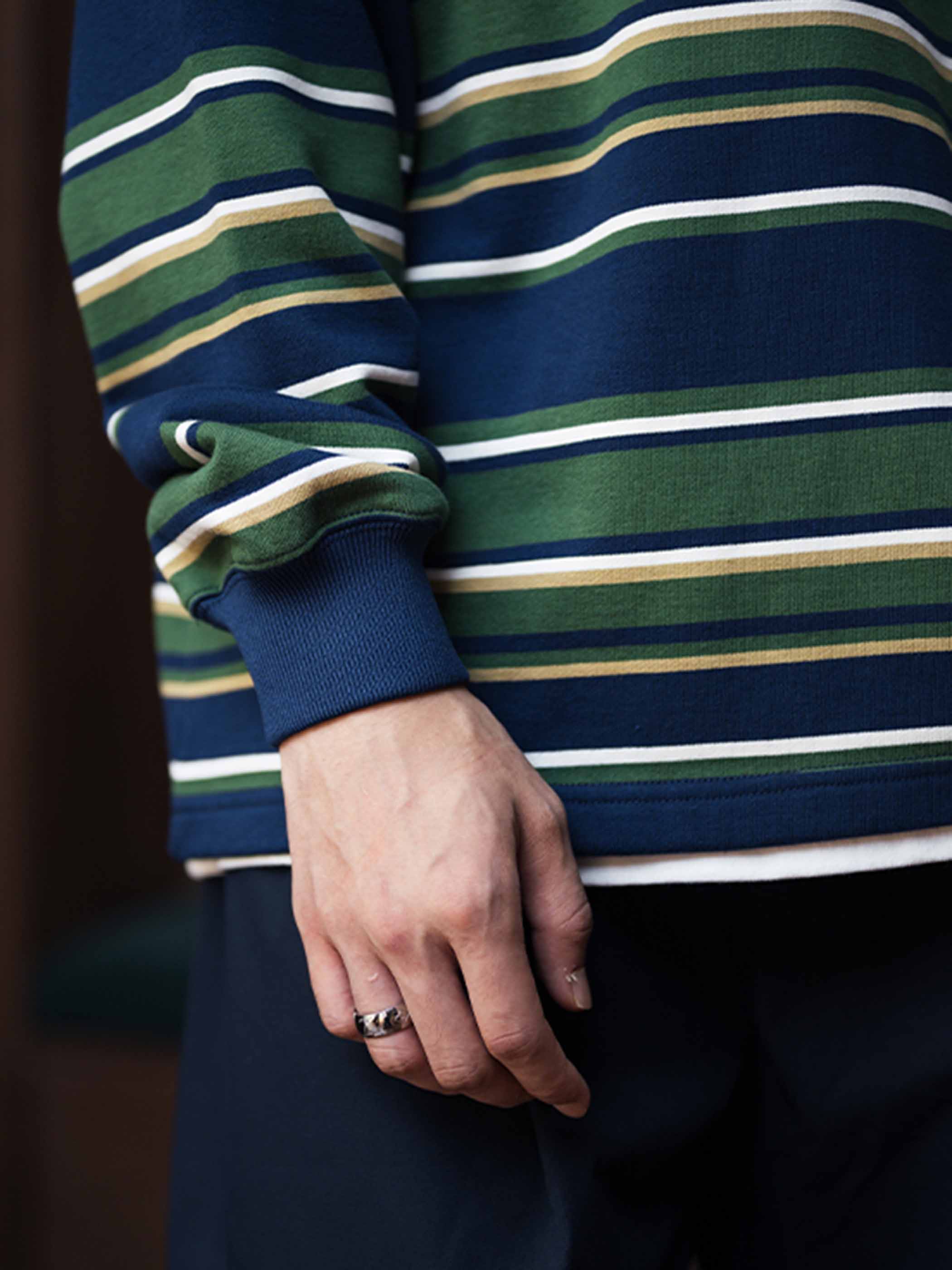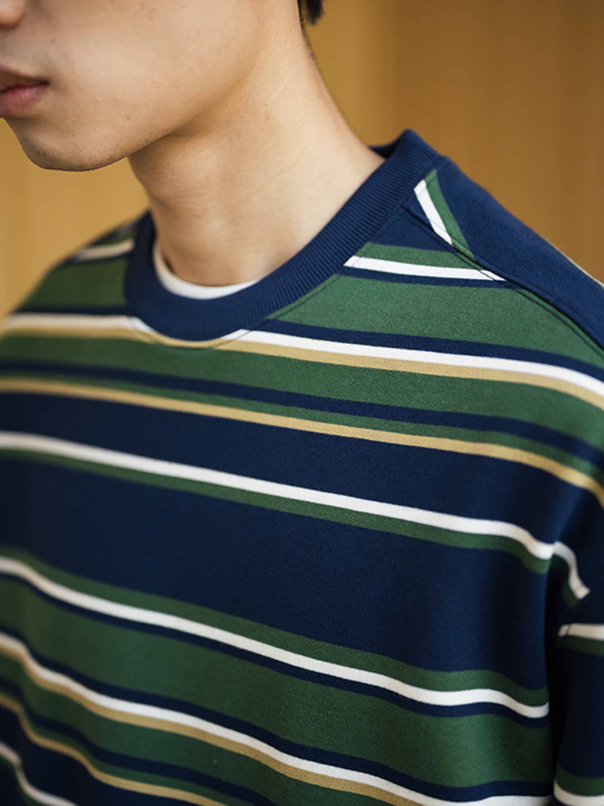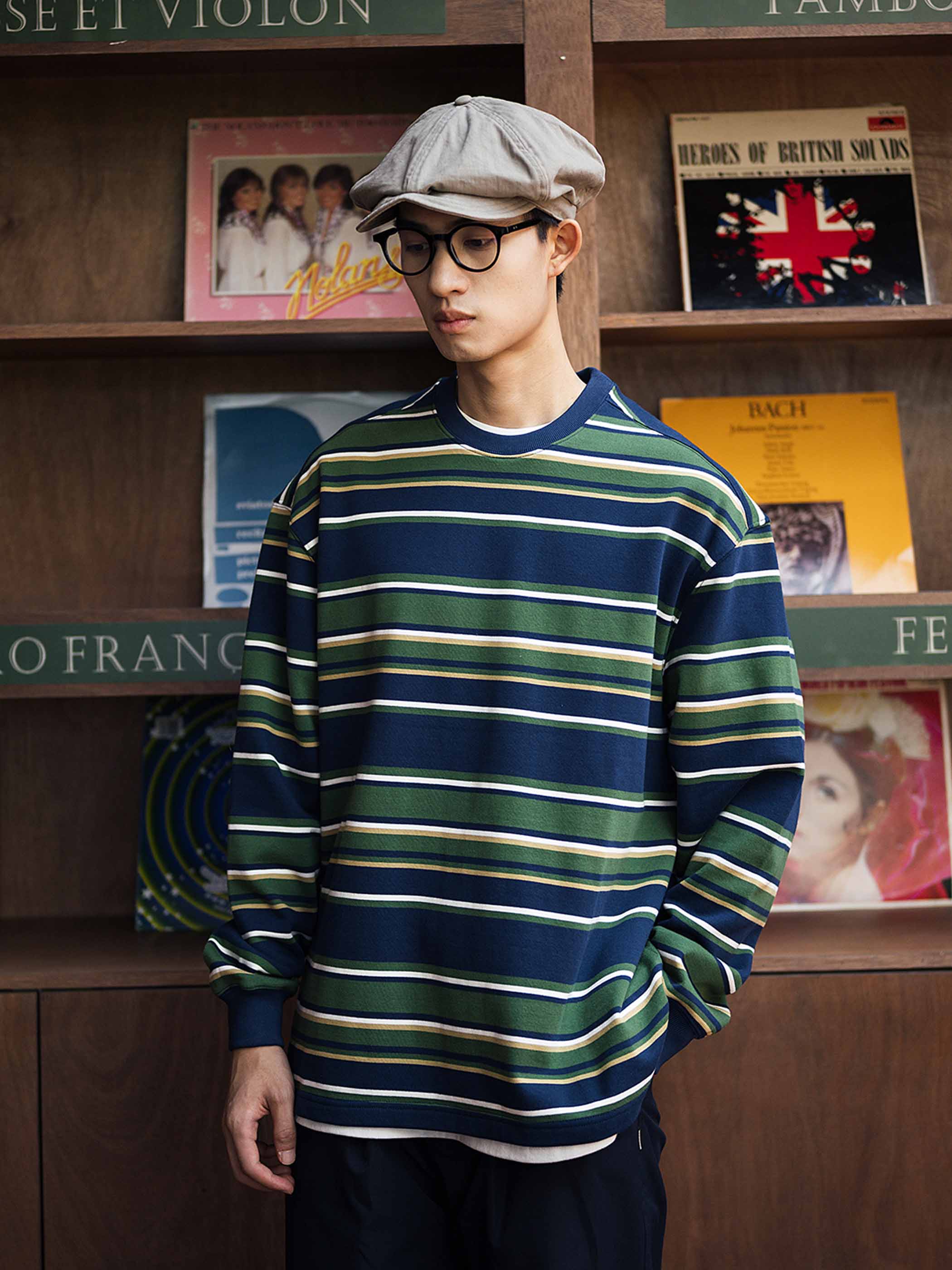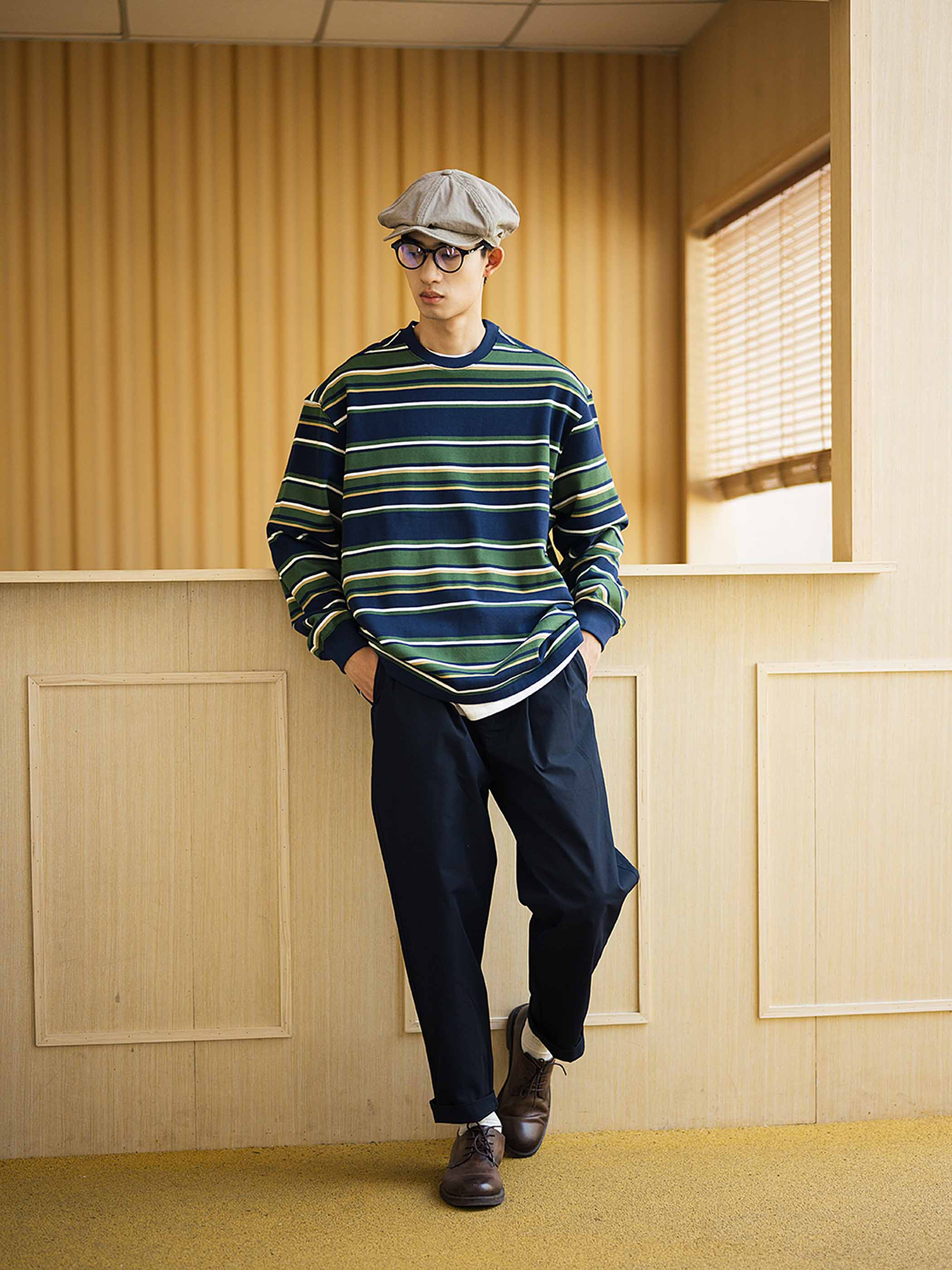 高克重の定織ストライプ生地を使用し、しっかりとした硬さと復古感を実現し、快適さと秋冬の保温性を兼ね備えた一着です。