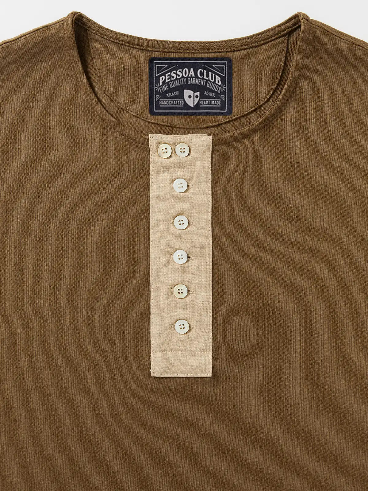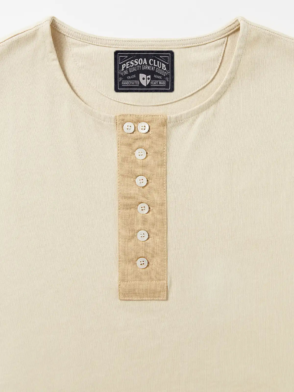 100%ヘビーウェイトコットンを使用し、ヴィンテージ風ウォッシュ加工を施した夏向けのヘンリーネックショートスリーブTシャツ。