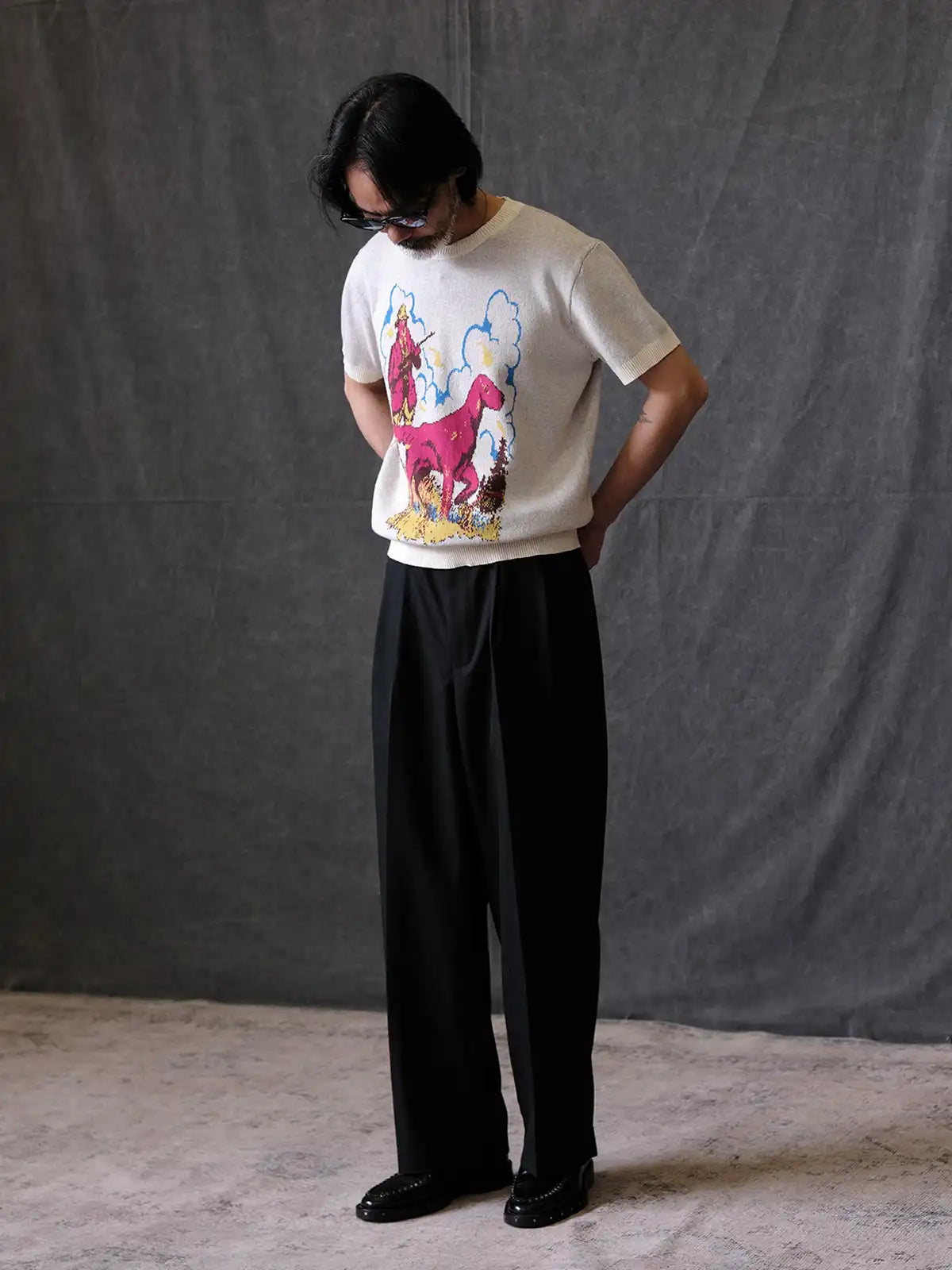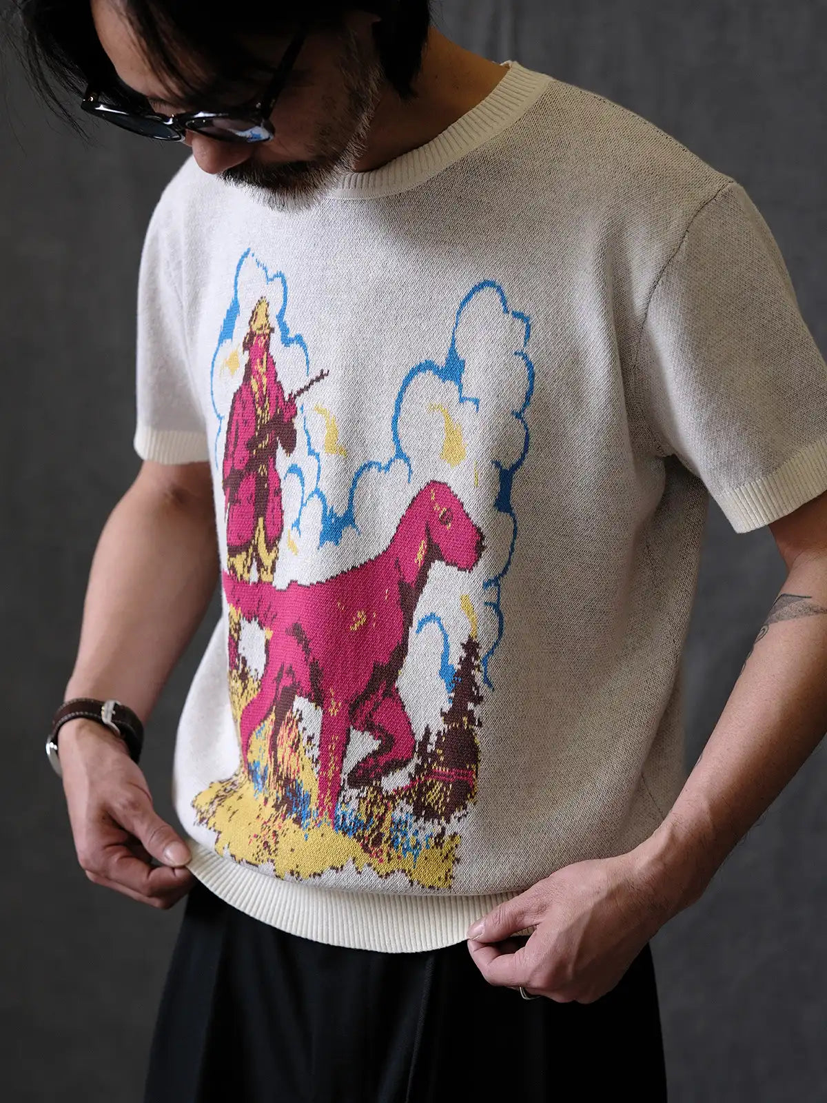スポーツウェアとして人気を博した1940年代のアメリカ製ニットTシャツに着想を得て、カウボーイと猟犬のジャカード柄をフロントに大胆に配したデザイン。従来より細番手の32番手コットン糸を使用し、厚手感を保ちつつ通気性と吸汗性を大幅に向上。リブ編みの衿と裾が安定したフィット感を生み、モダンなタウンユースはもちろん、リゾートやライトスポーツのスタイリングにも映える一着です。