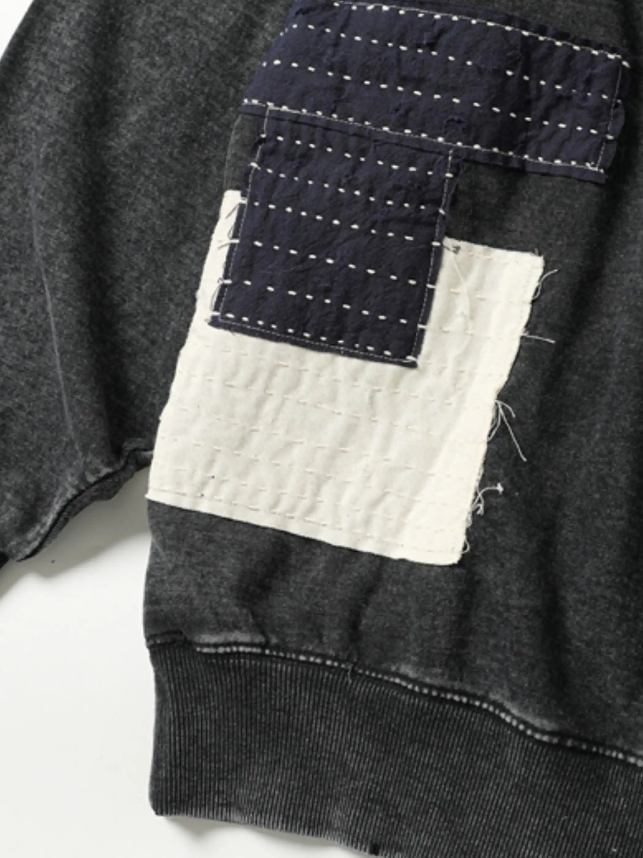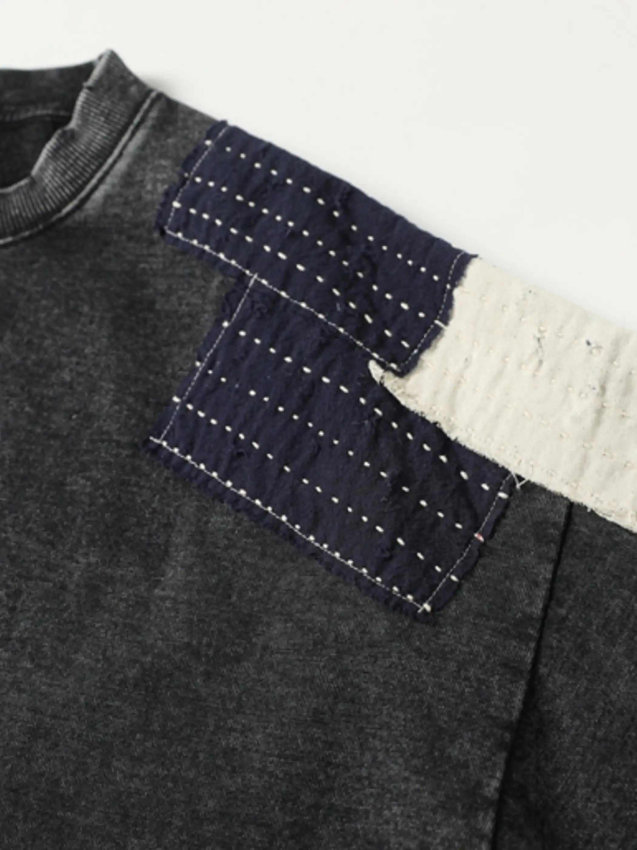 ウォッシュ加工を施したスウェット生地に、刺し子パッチとキルト調パッチを組み合わせることで、アートピースのような個性を演出。ゆとりのあるルーズフィットがリラックスした着心地を実現し、カジュアルからストリートまで幅広いスタイルにマッチします。刺し子パッチは日本伝統の手法を取り入れ、洗いざらしの風合いと相まって独特のヴィンテージ感を際立たせます。