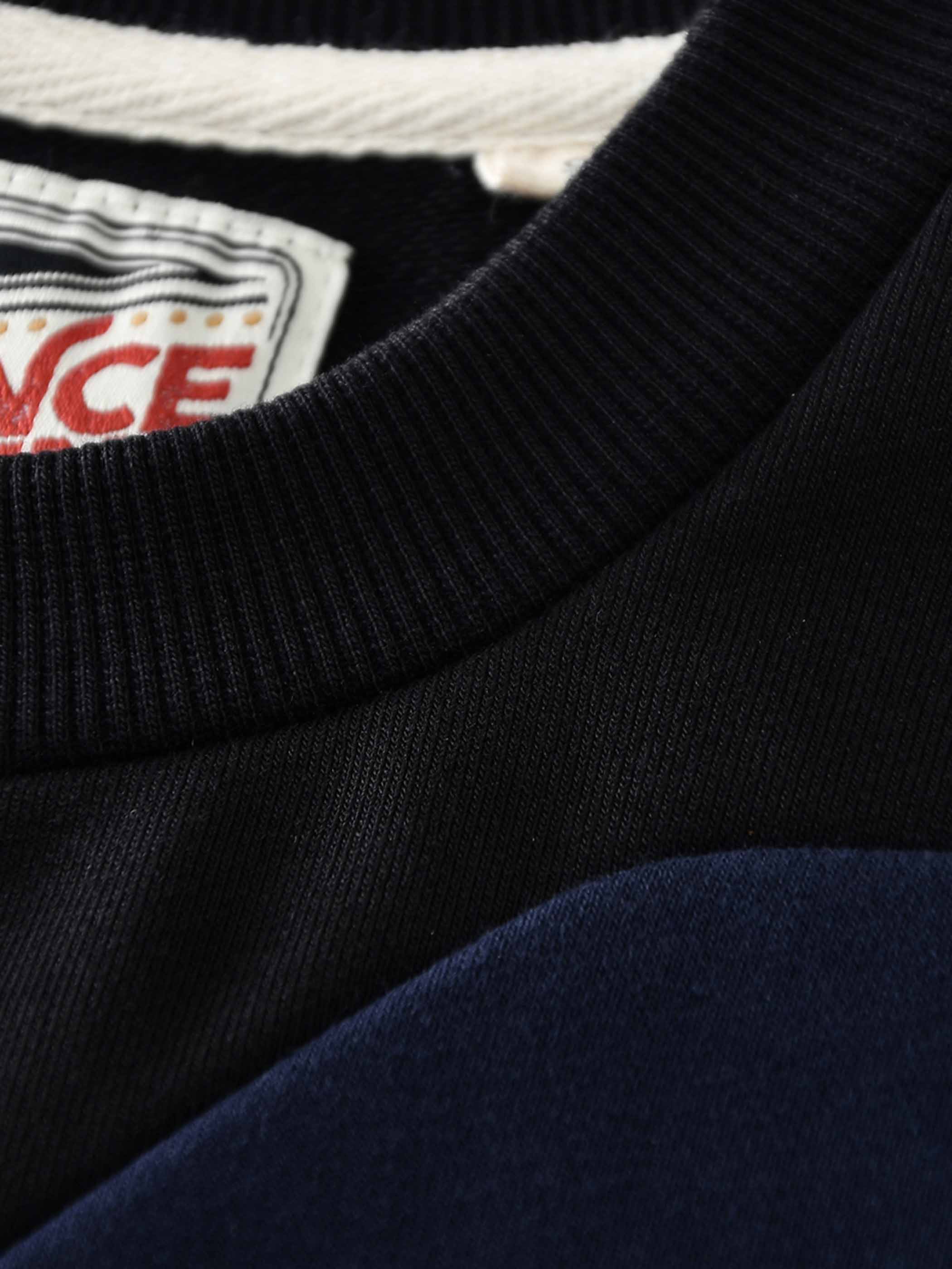 本スウェットは70年代のアメリカンキャンパススポーツ風に着想を得て、毛羽取り加工により布面に繊細なテクスチャと柔らかな手触りを実現し、優れたドレープ感を持ちます。カラーブロックのパッチワークが視覚的インパクトを与え、リブ編みの裾は耐久性を高めた仕上がりとなっています。単独着用でシルエットを際立たせるもよし、アウターとのレイヤードスタイルで重ね着するもよし、青春の活力とヴィンテージな情緒を感じさせる一着です。