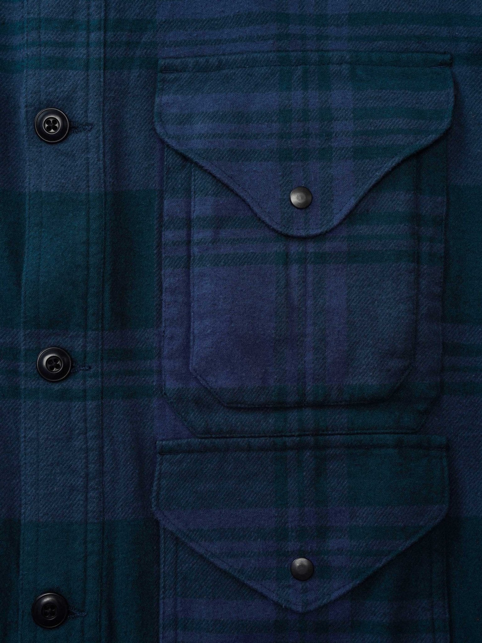 オリジナルのデザインを残しつつ、シャツ風のジャケットとして改良されています。前面の丸いボタン付きフラップポケットは、小物を便利に収納できます。