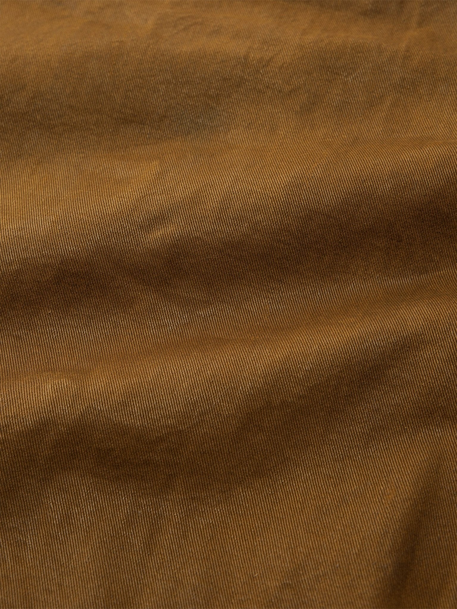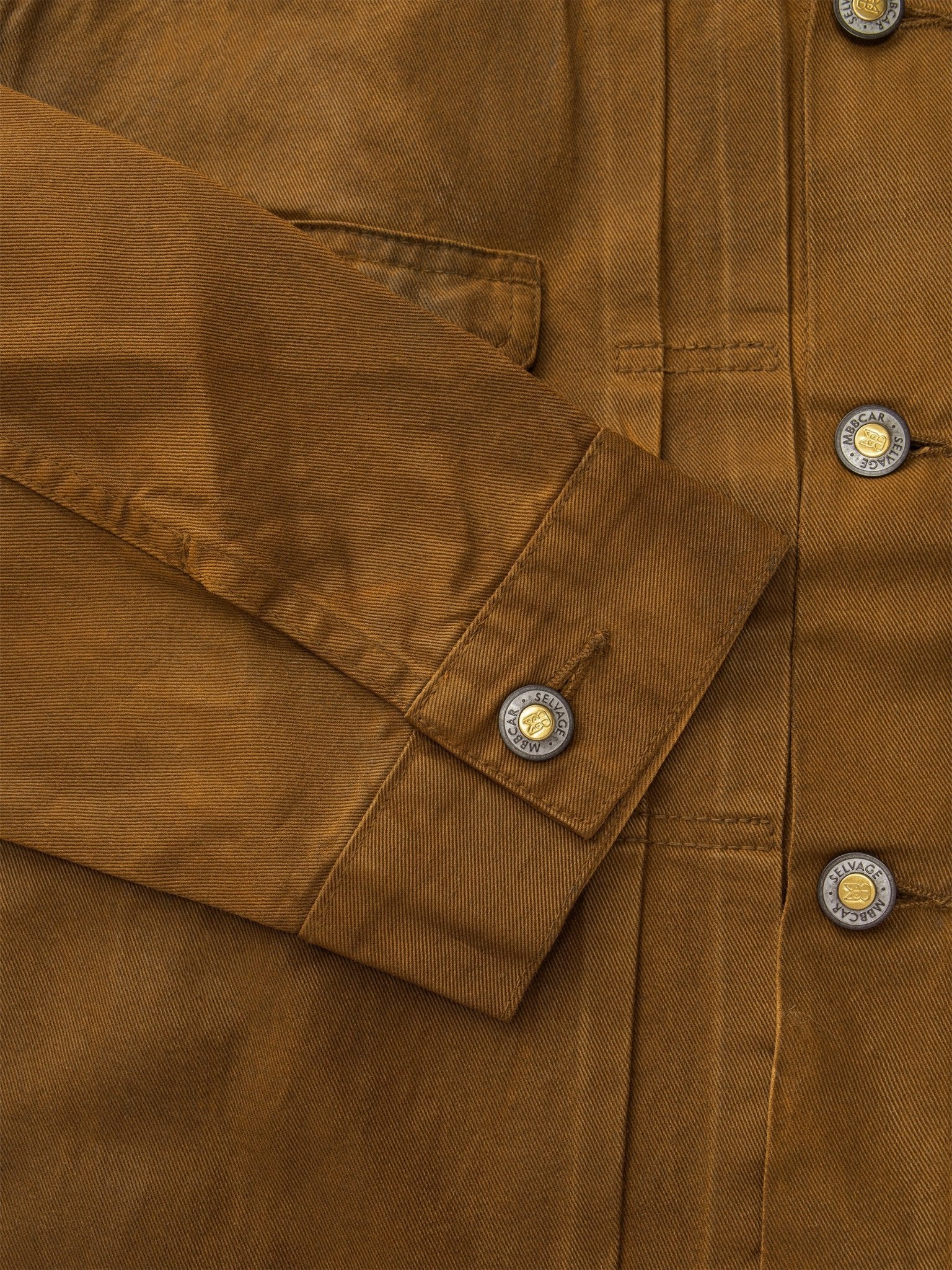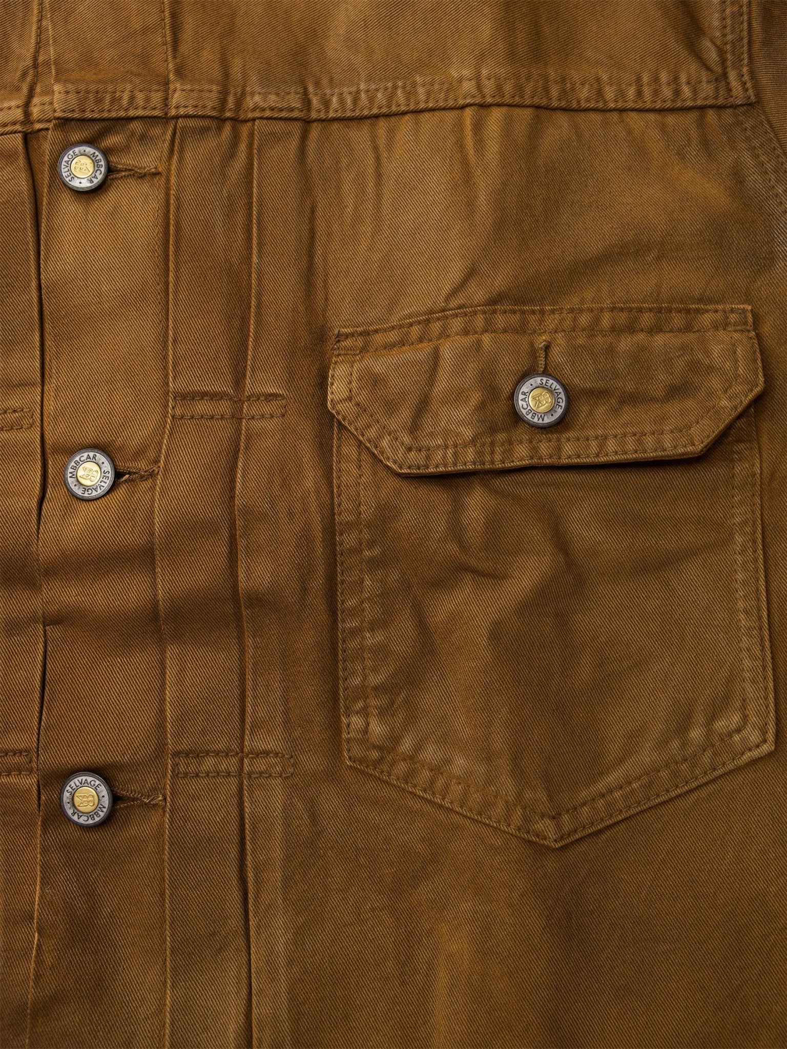 このジャケットの生地は、今年新しく開発された織り糸に斜めに色を織り込んだ生地を使用しています。古い織機で織られ、織密度は102*59に達し、経糸には16本、緯糸には10本の糸を使用し、厚くてしっかりとした生地に仕上げられています。また、赤耳地に特有の赤いラインも加えられ、高品質であると同時に、懐かしい雰囲気と伝統的な手工芸を保っています。