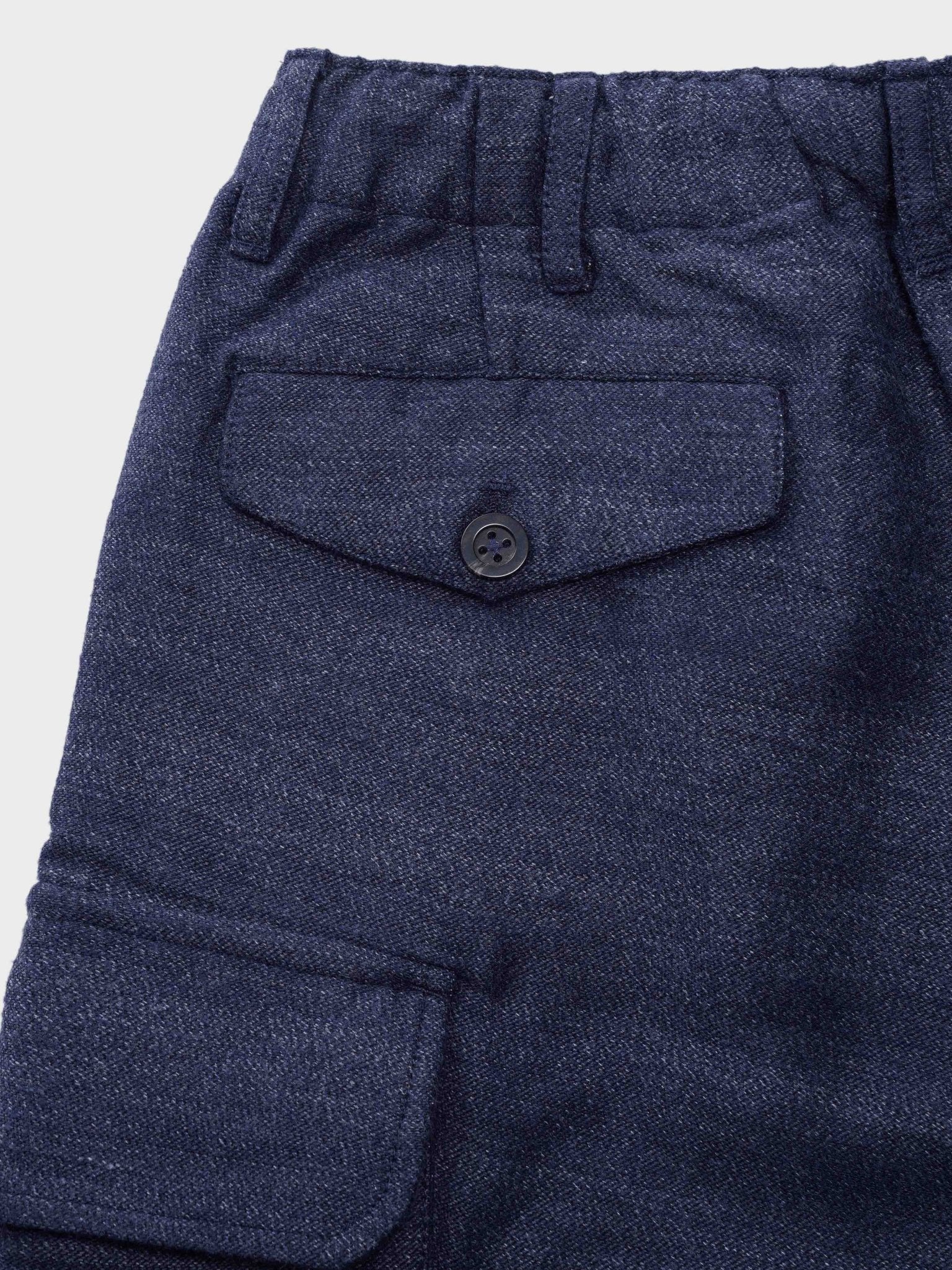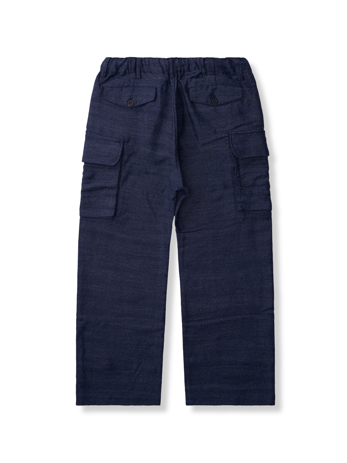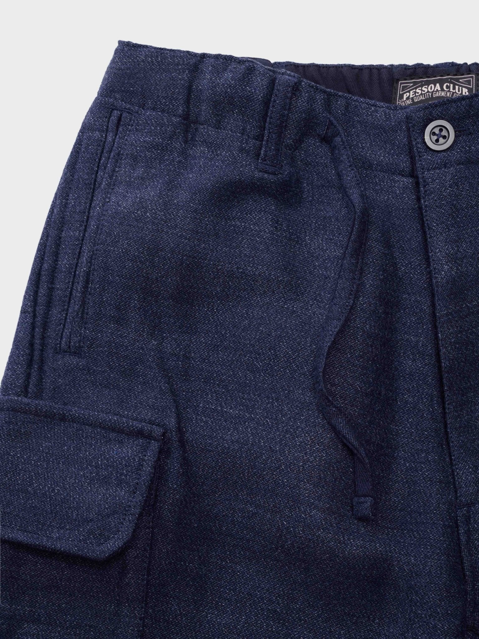 特別に開発されたインディゴ色のドット糸混紡生地が使用され、表面には唐辛子と塩のような白いドットが現れ、独特のスタイルを表現しています。膝部には二重補強、腰部には紐デザインが付いており、両側にはM47の特徴的な大型ポケットが残されています。