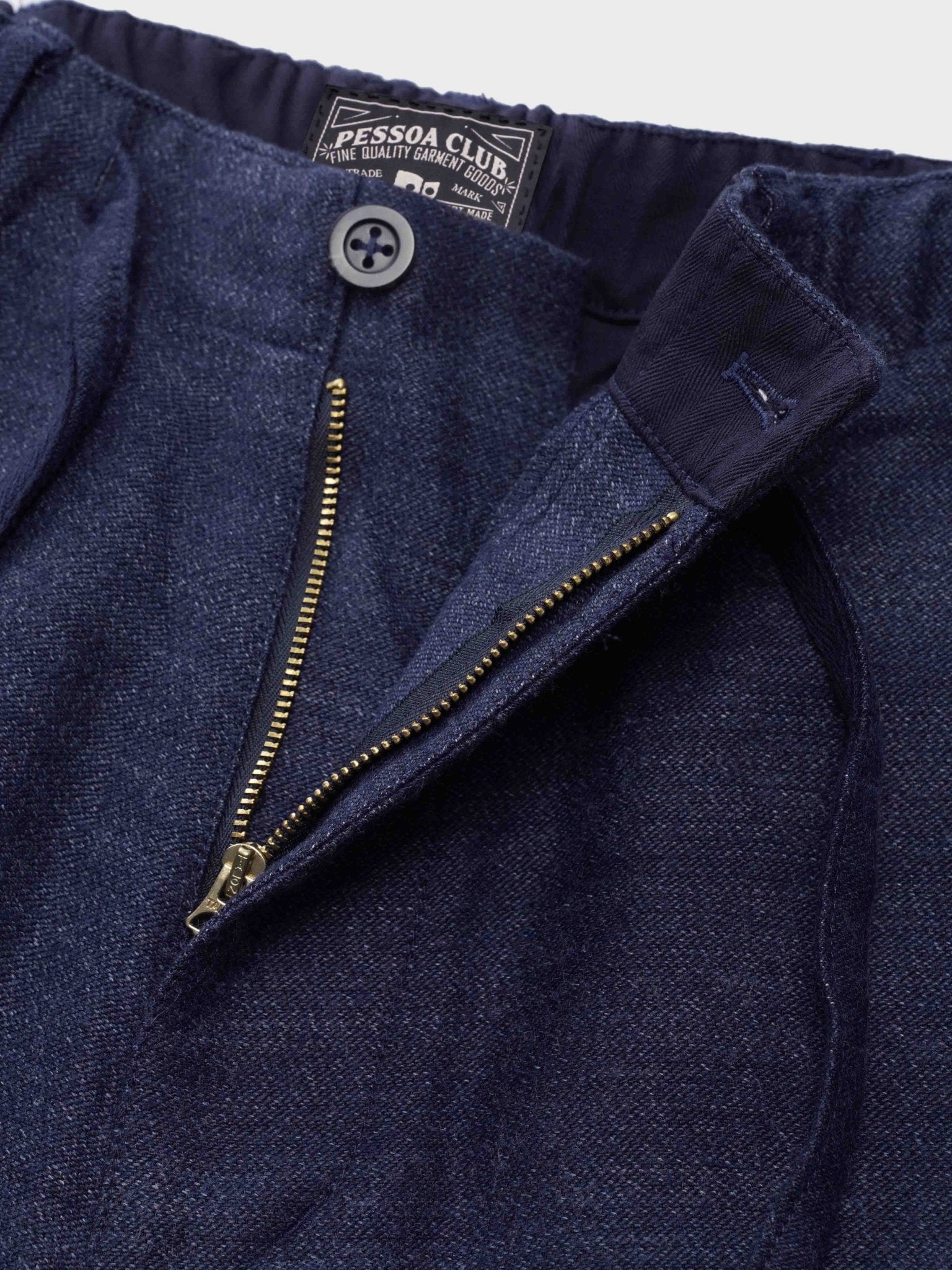 このパンツは、M47軍パンツとスポーツパンツを組み合わせ、快適でおしゃれなスタイルを演出しています。パンツには両側に大きなポケットが付いており、実用性が高いです。生地には特別に開発されたインディゴ色のドット糸混紡生地が使用されており、表面には唐辛子と塩のような白いドットが現れ、独特のスタイルを表現しています。