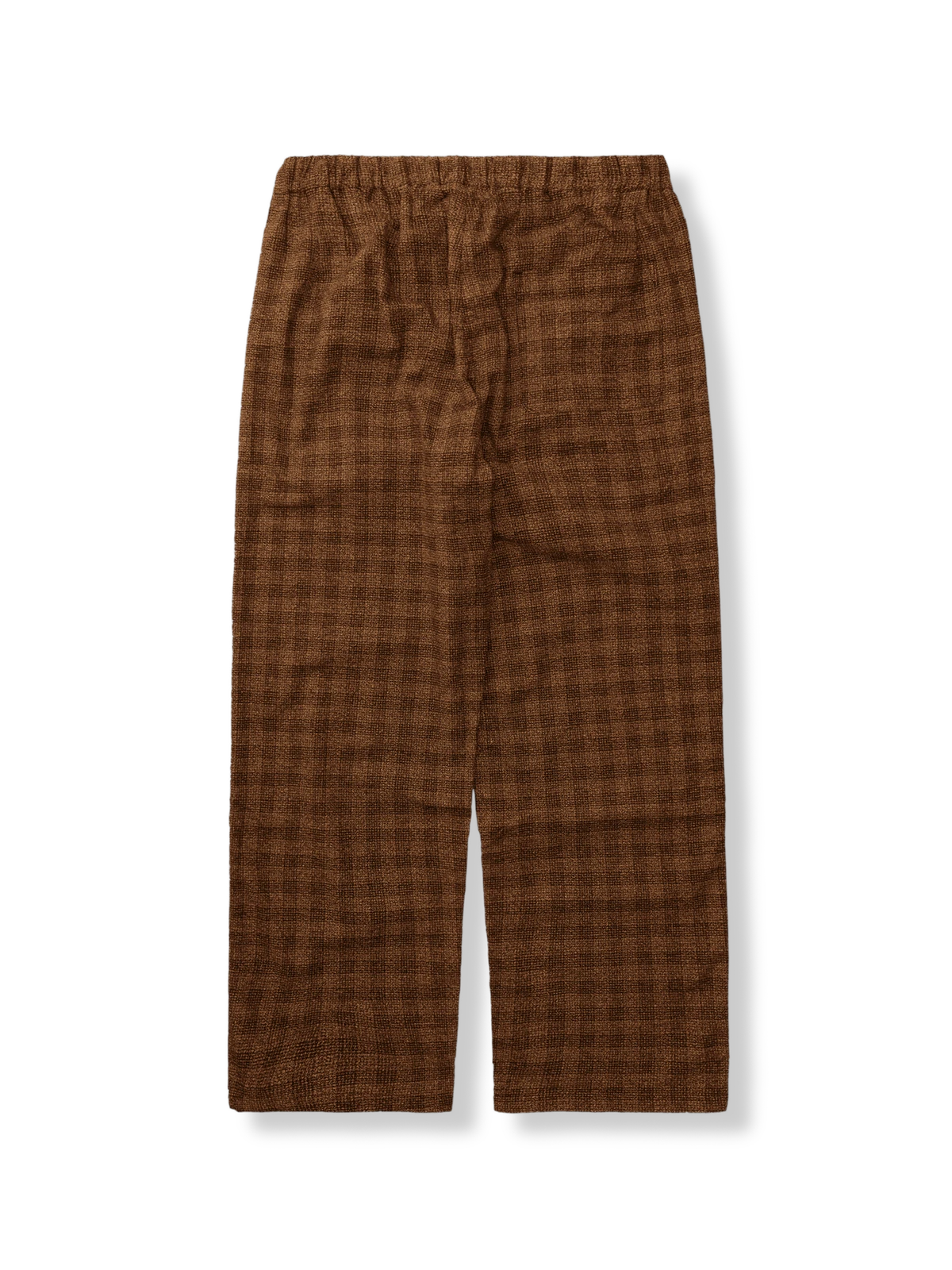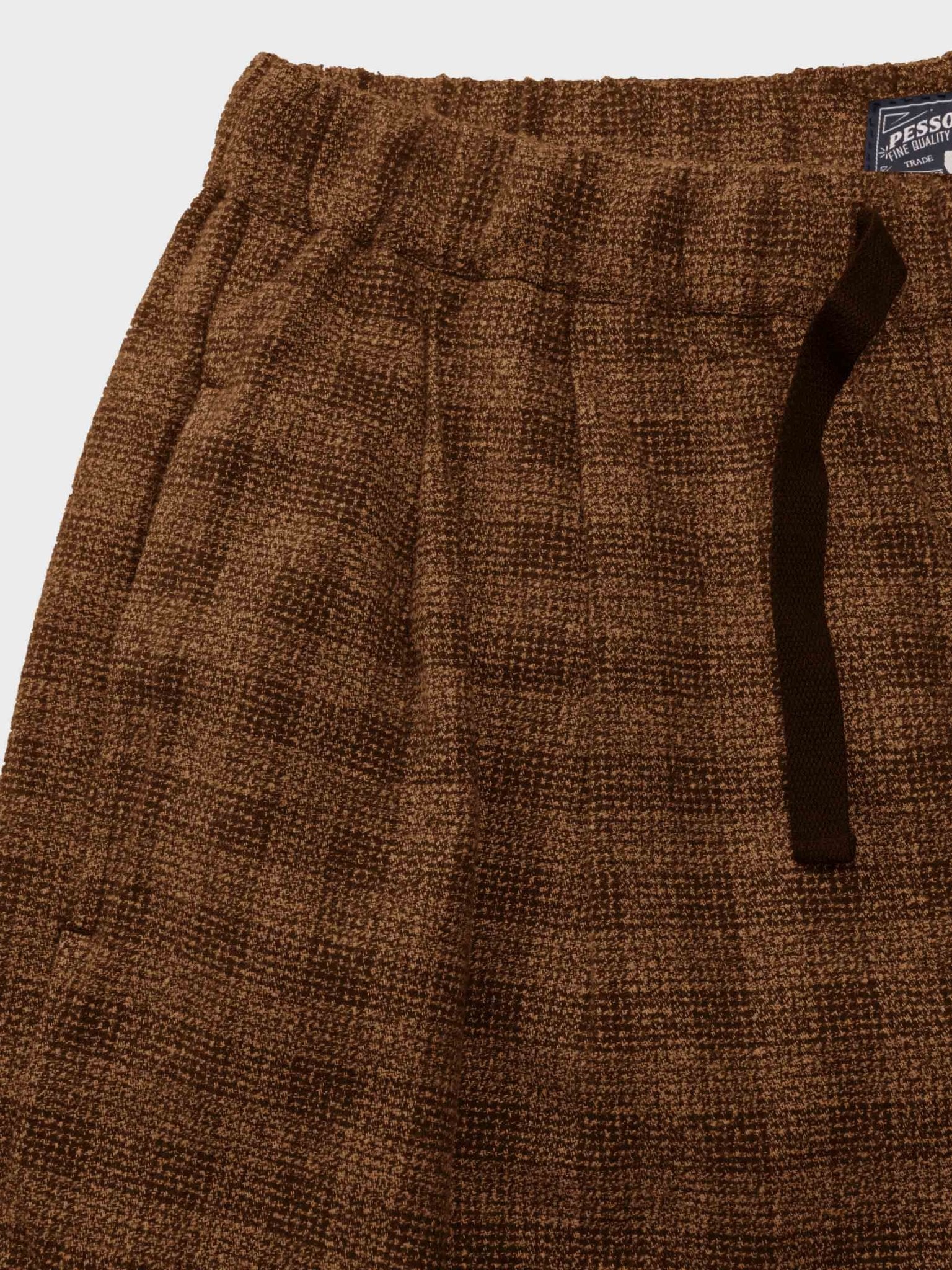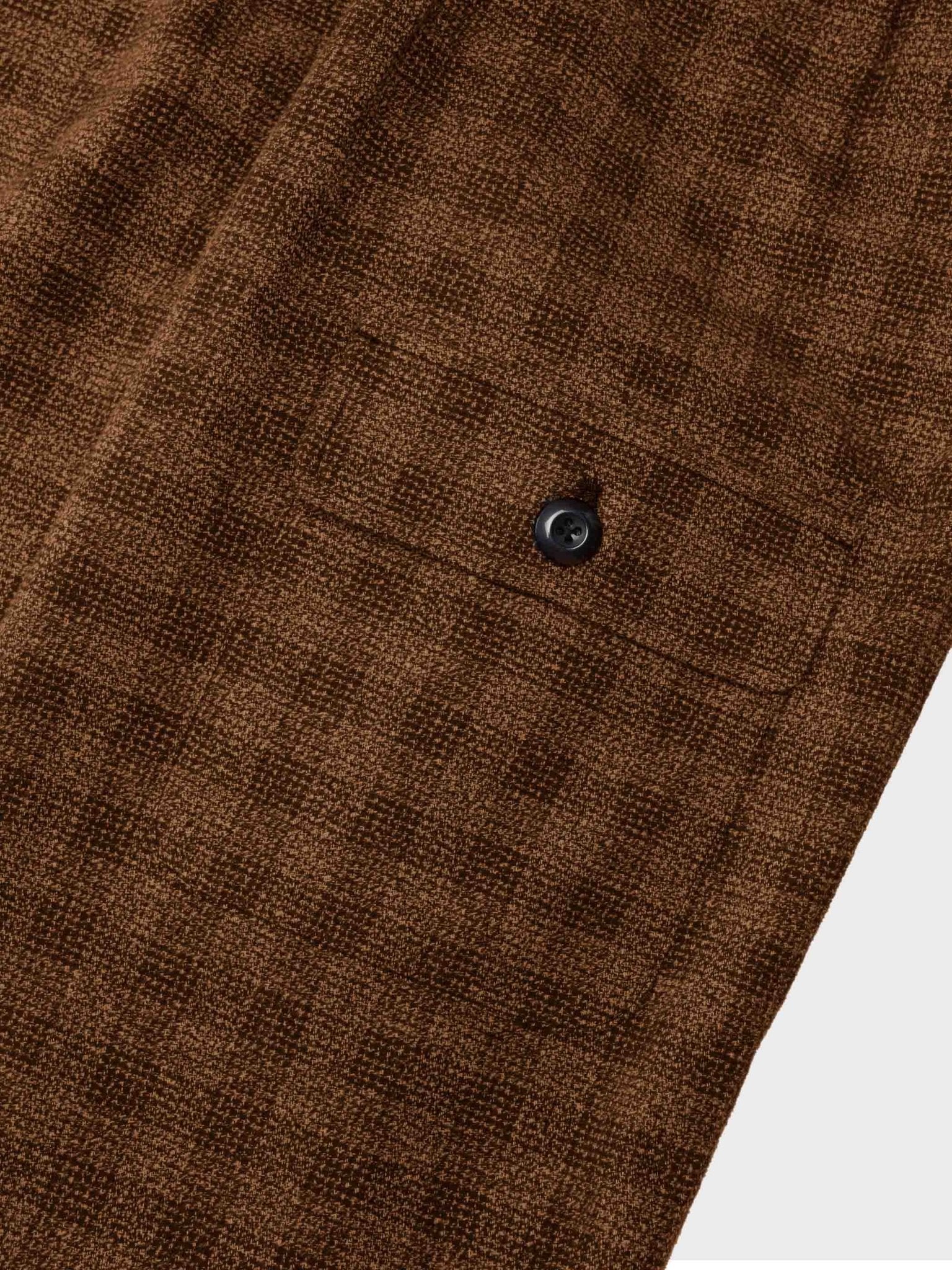 このカジュアルパンツは、千鳥格子のデザインで、グレーとカーキ色の組み合わせが落ち着いて温かみがあります。ゆったりとしたストレートパンツで、ダブルプリーツがあり、ウエスト部分にはレトロ感があるゴムバンドが嵌め込まれています。さらに、パンツの脚にはポケットが付いており、視覚的な遊び心とレトロ感を増しています。