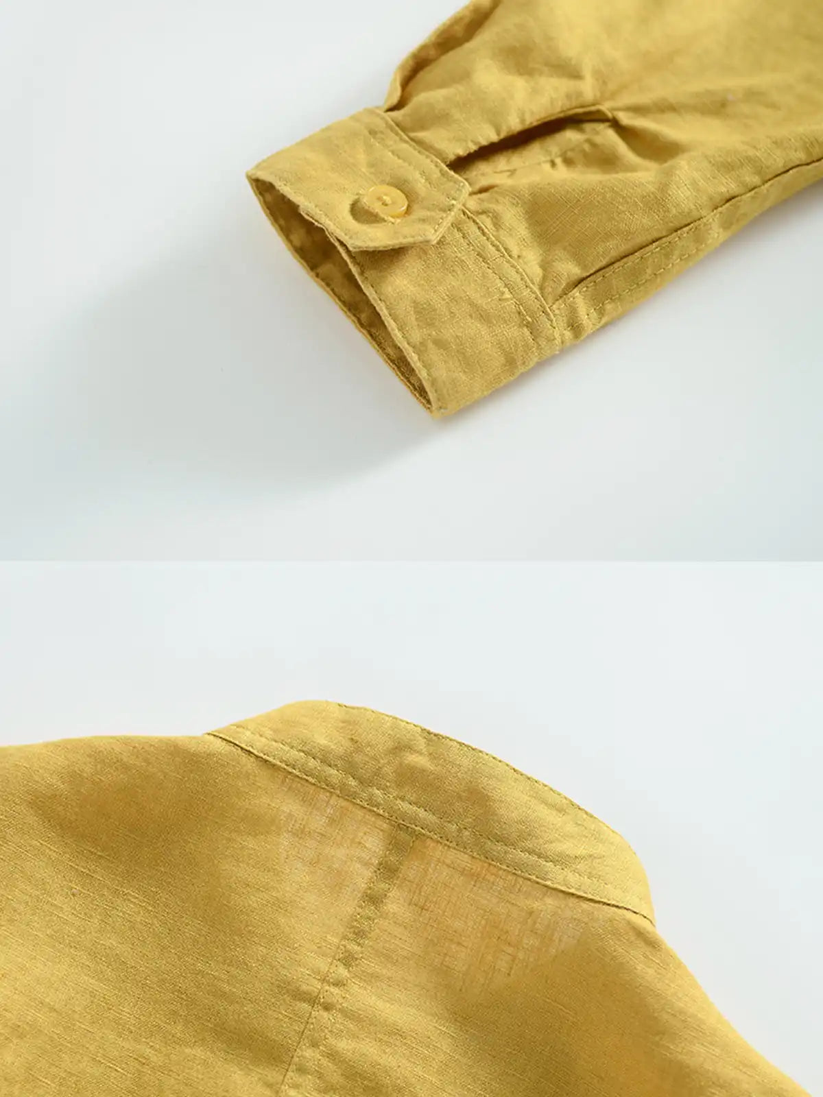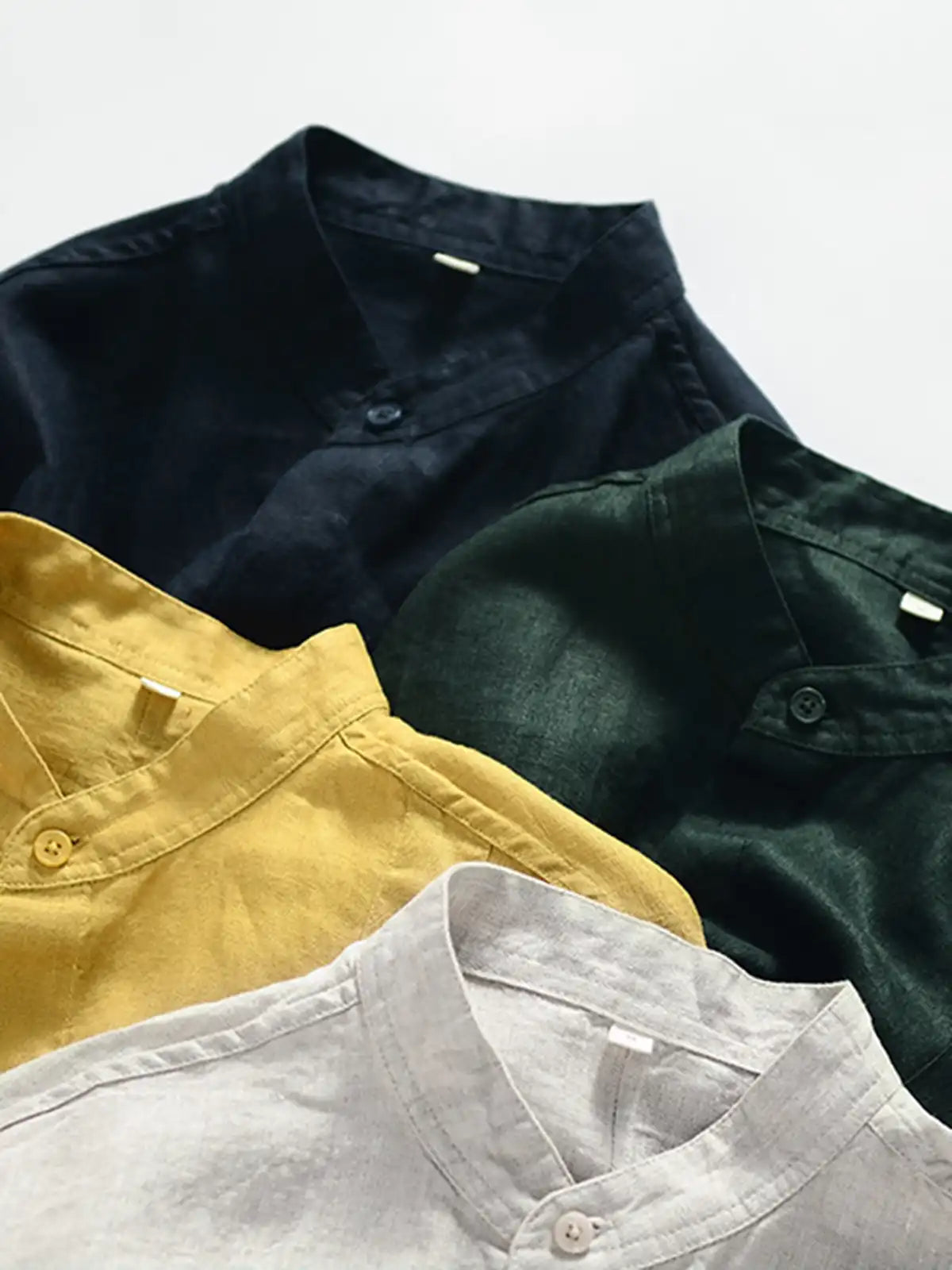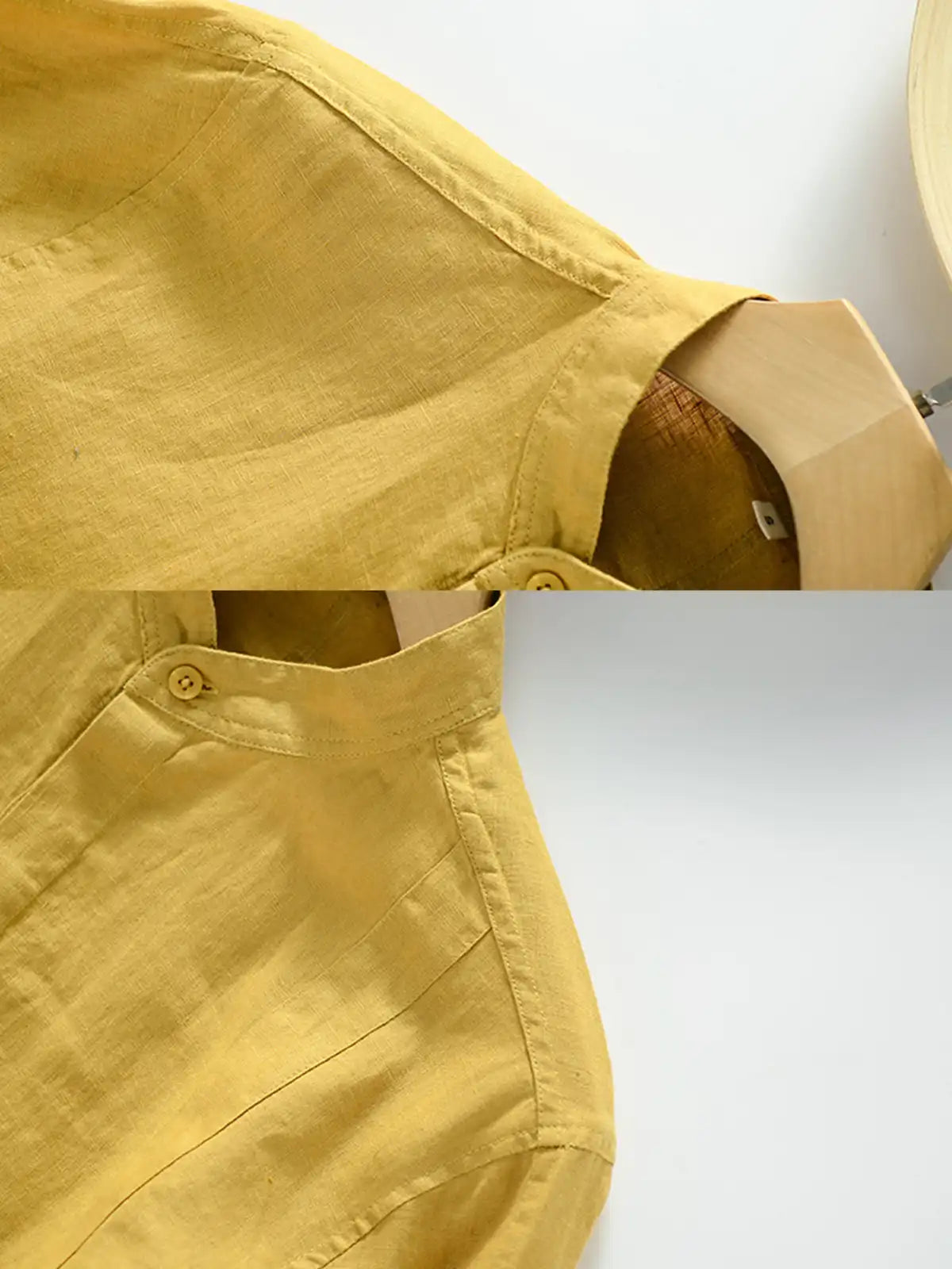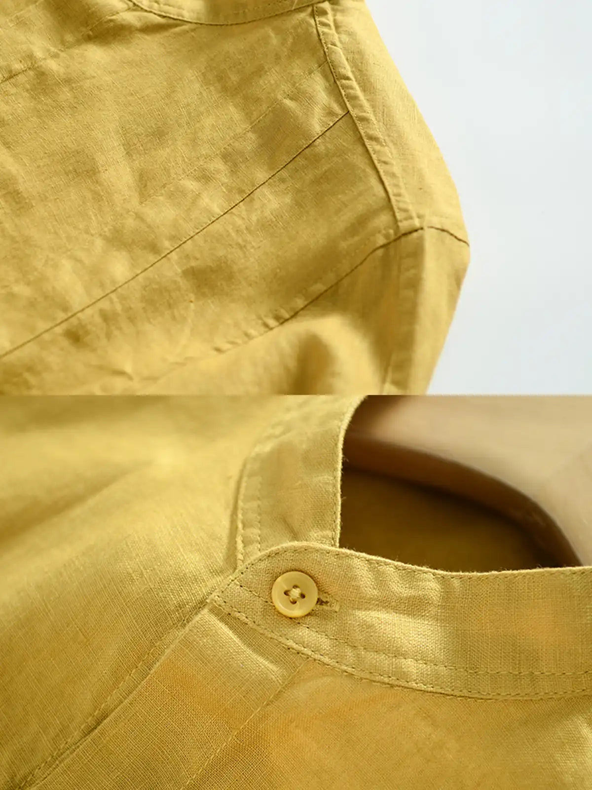 95%以上の高密度リネンを使用し、自然な織り目が醸し出すテクスチャーと優れた通気性で、汗ばむ季節でも肌離れ良くドライをキープ。立ち襟デザインが上品なアクセントとなり、ゆったりシルエットがリラックスムードを演出。耐久性にも優れ、ネイビー・ナチュラル・イエロー・グリーンの4色展開でコーディネートの幅を広げます。