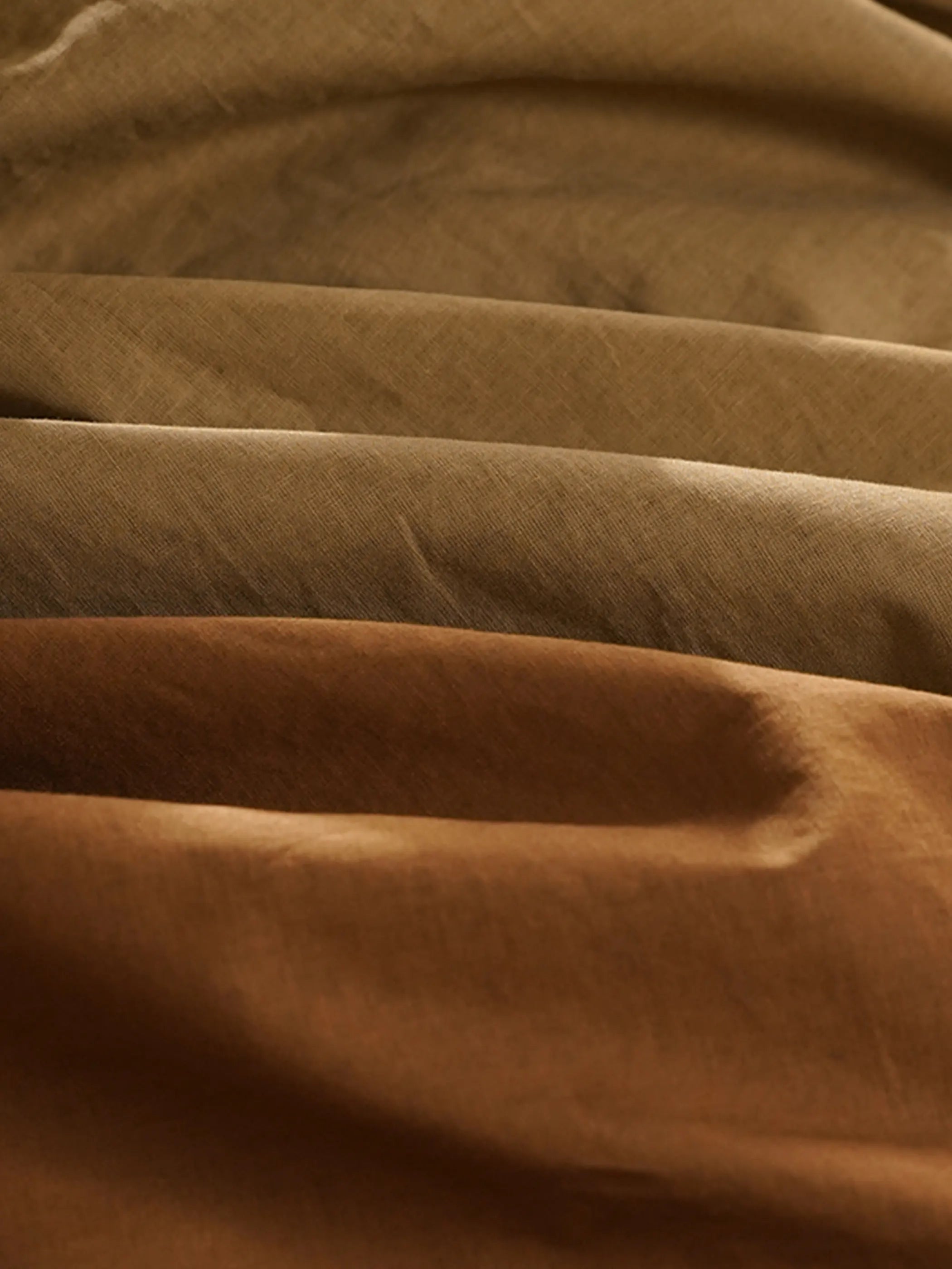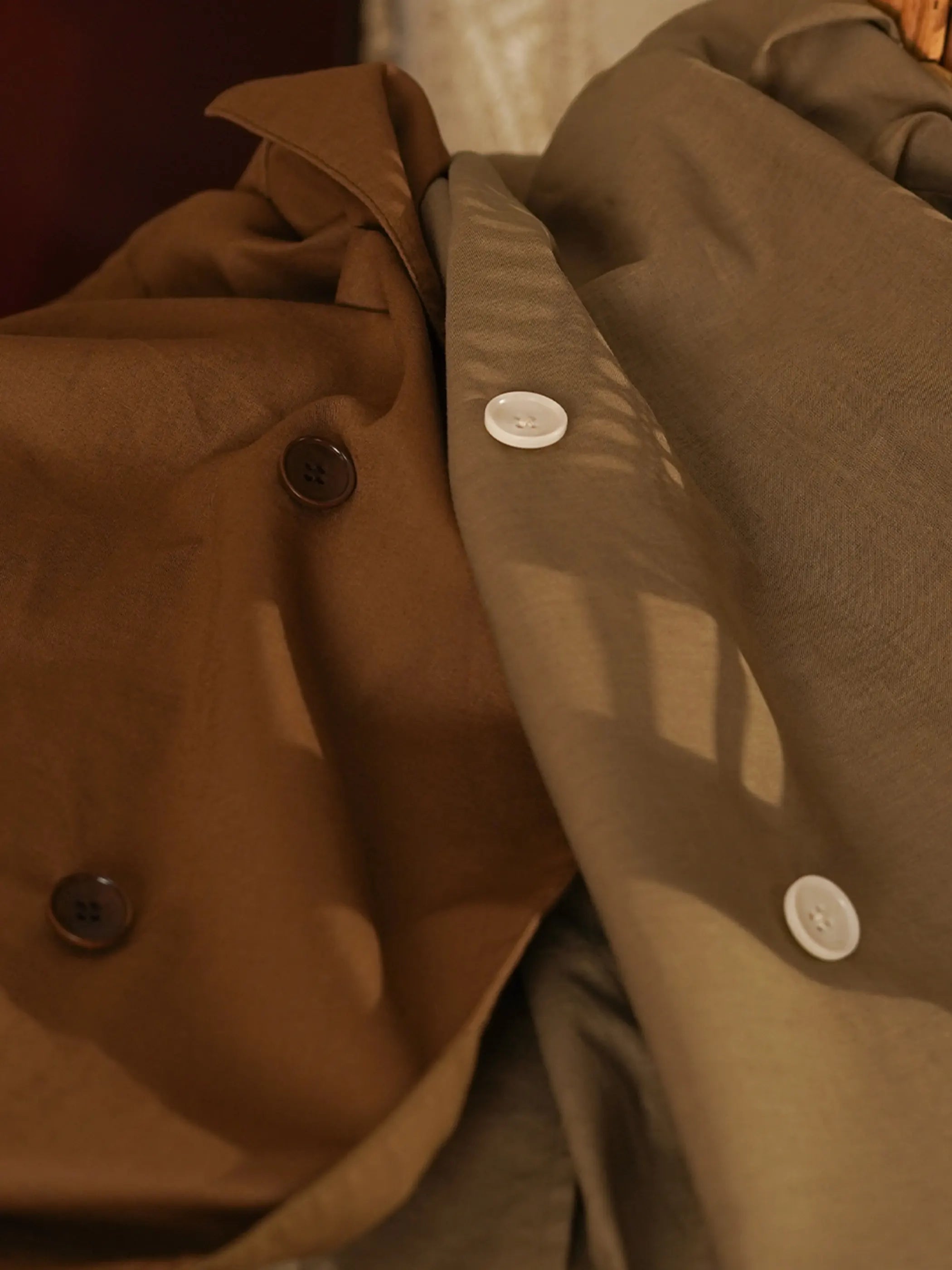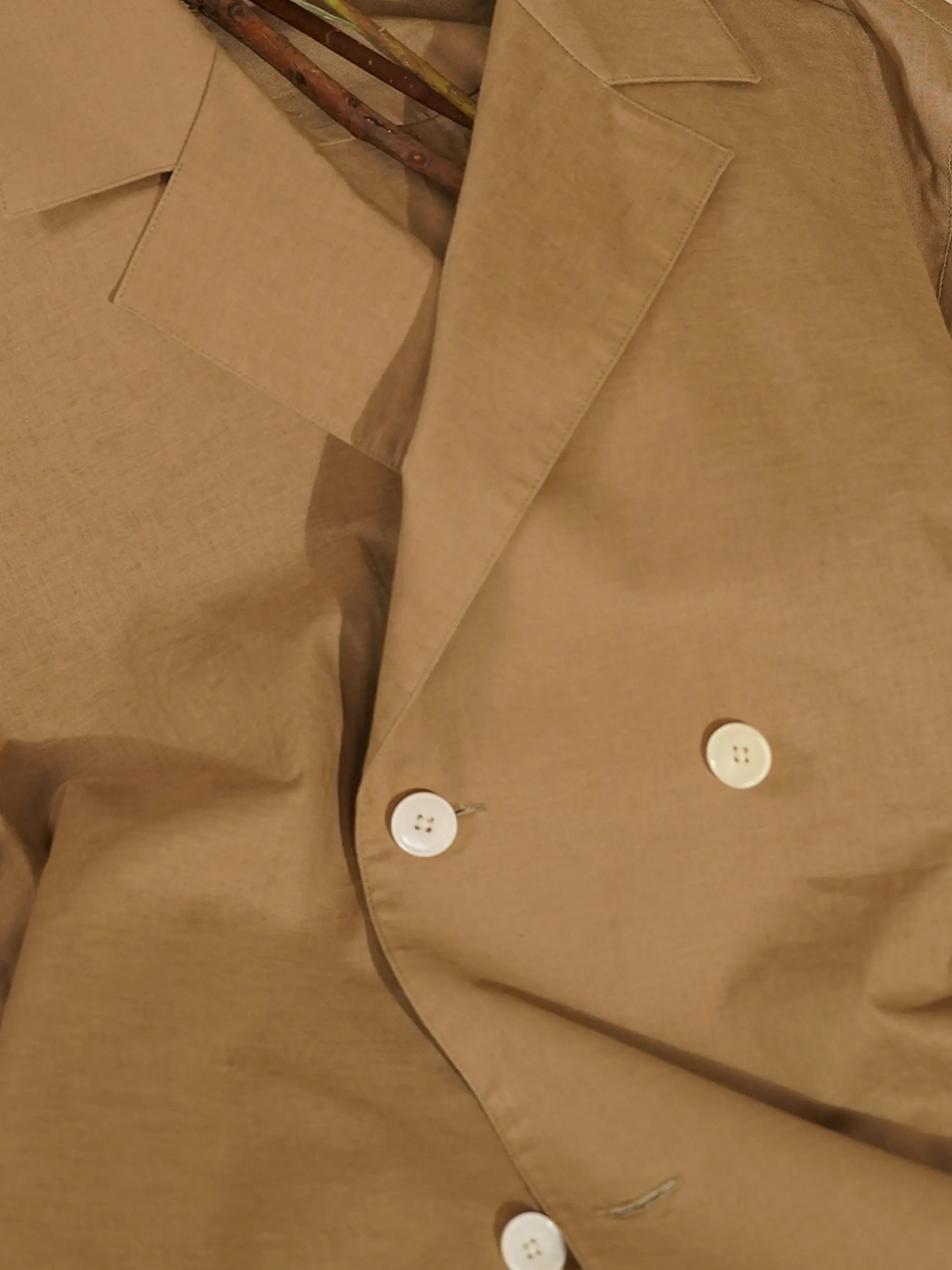 非洲大陸の文化と自然を旅する視点でデザインされた刺繍モチーフが、開襟のWブレストに華やかなアクセントを添えます。50番手の高密度コットンリネン混紡生地は118g/m²と軽量ながら適度なハリ感があり、ダブルブレストの平驳(フラットラペル)と微ドロップショルダーがリラックスしたオーラを放ちつつ、端正な立ち姿をキープ。象牙や大地色のカラーパレットが旅先の風景を思わせ、タックインでもアウトでも着映えする一着です。チノやリネンパンツと合わせて、夏のリゾートから都会のテラスまで幅広く活躍します。