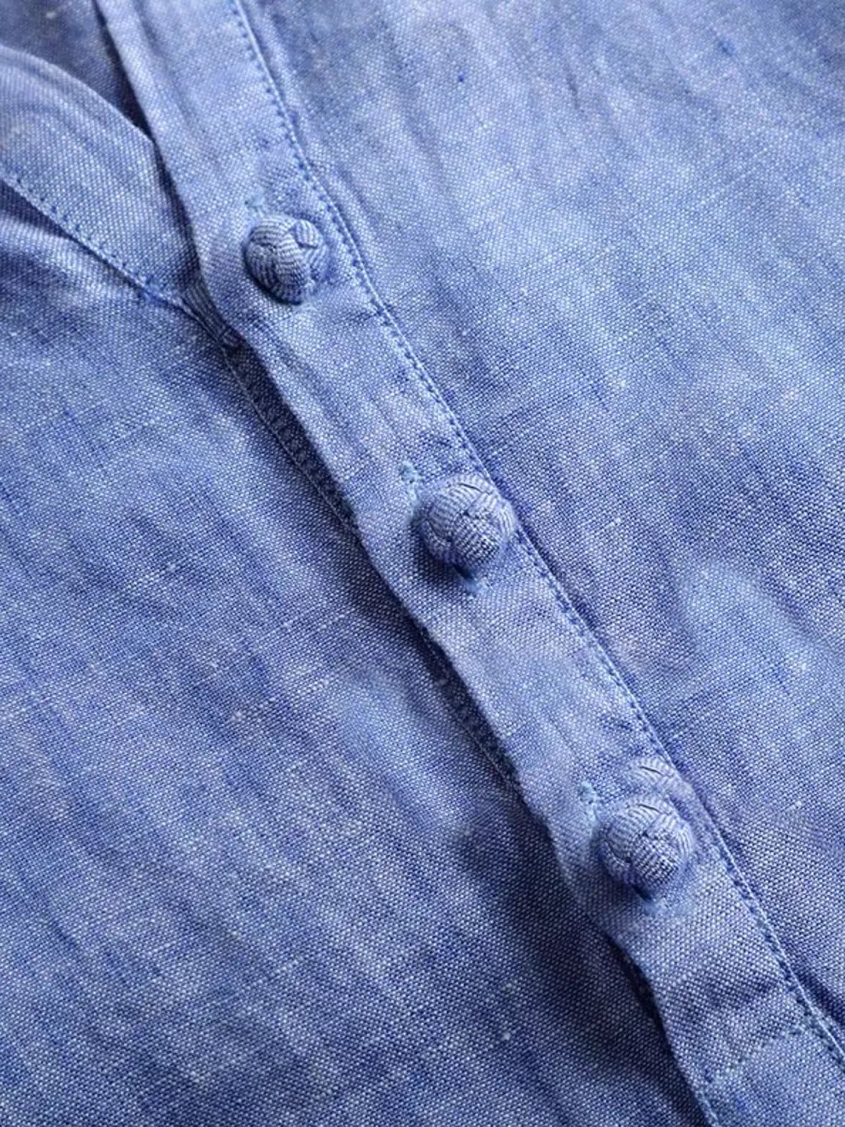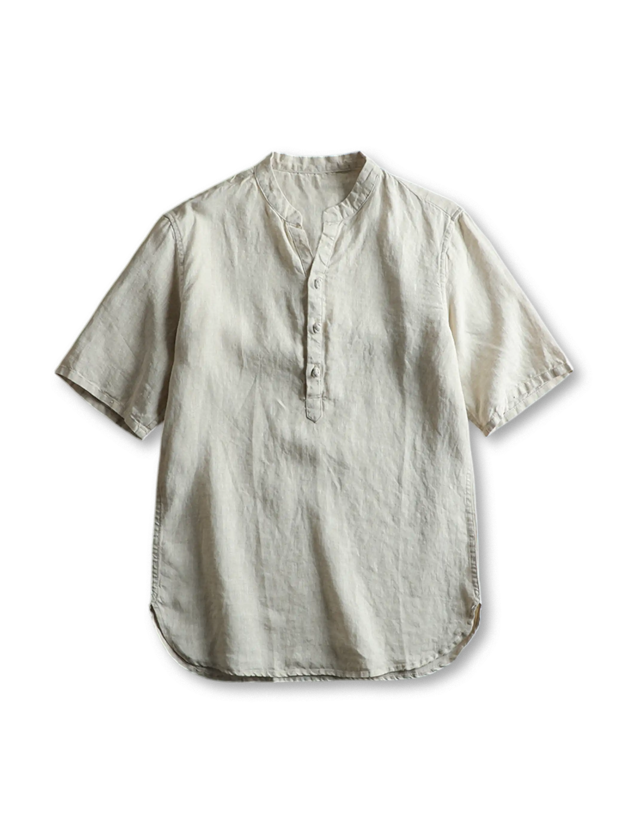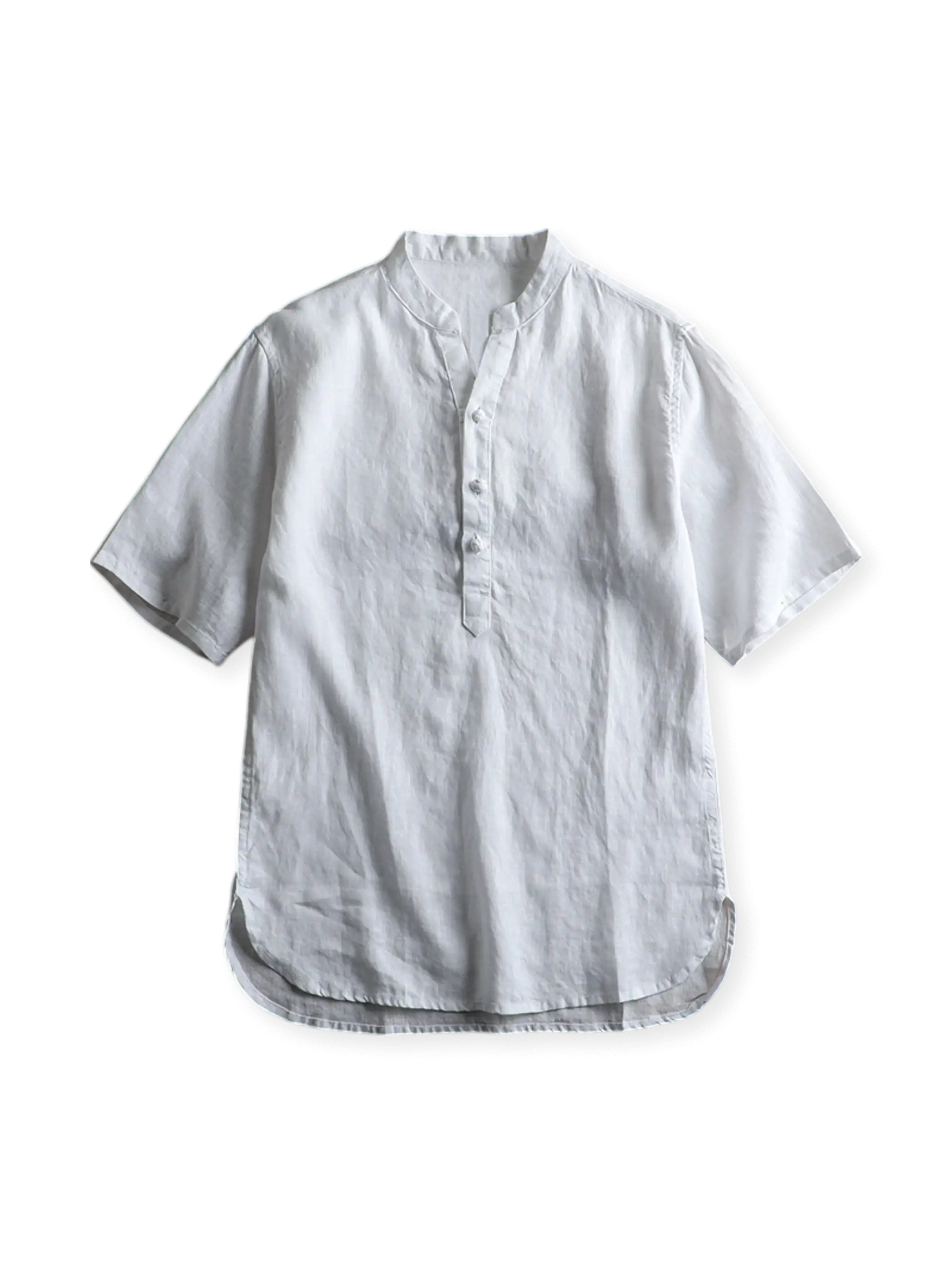 古代エジプトにルーツを持つリネンを米国西海岸の夏の風土に合わせて再解釈した、衿元の盤扣がアクセントの半開襟シャツ。