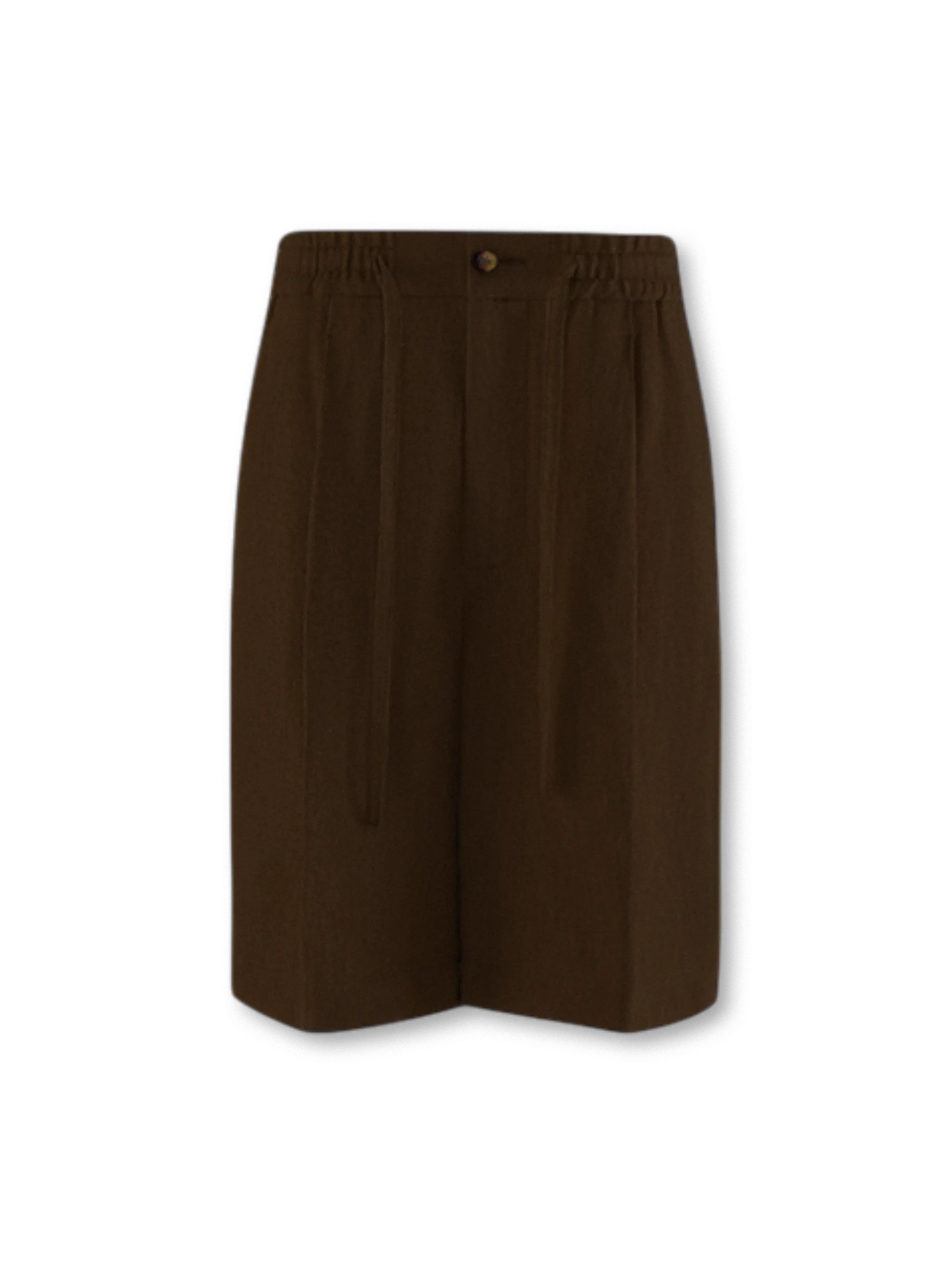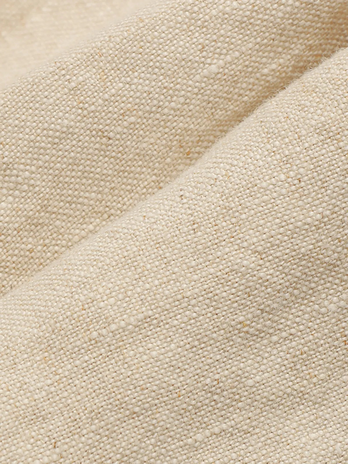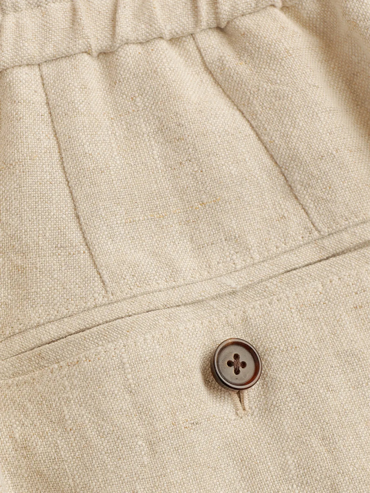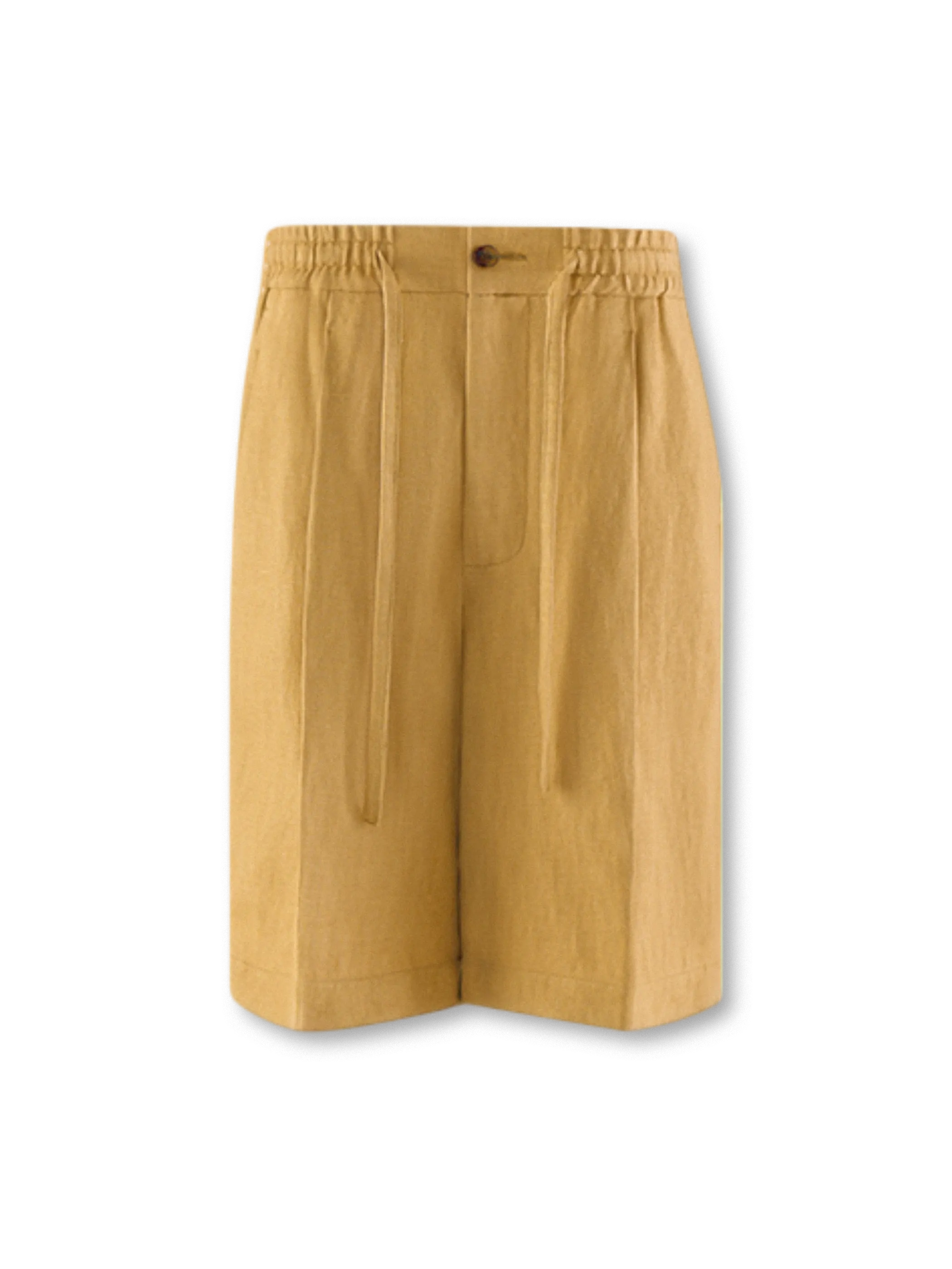 18世紀のヨーロッパ貴族が夏の庭園で愛用したリネンの涼感を再現するため、362g/m²のヘビーウェイトノルマンディーリネンで仕立てた単プリーツショーツは、ウエストにドローコードとゴムを内蔵し、膝上丈のバランスで視覚的に脚を長く見せながら快適なフィット感を実現。片プリーツのセンタープレスがほどよいフォーマル感を添え、サファリジャケットやリネンシャツとの相性も抜群。旅先でも自宅でも、上質なリネンがもたらす上品なリラックススタイルを楽しめます。
