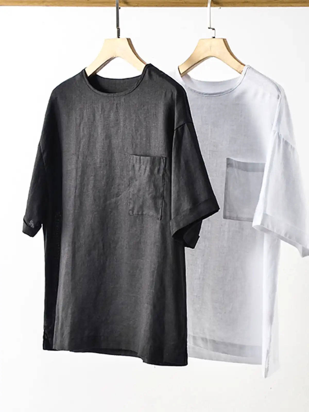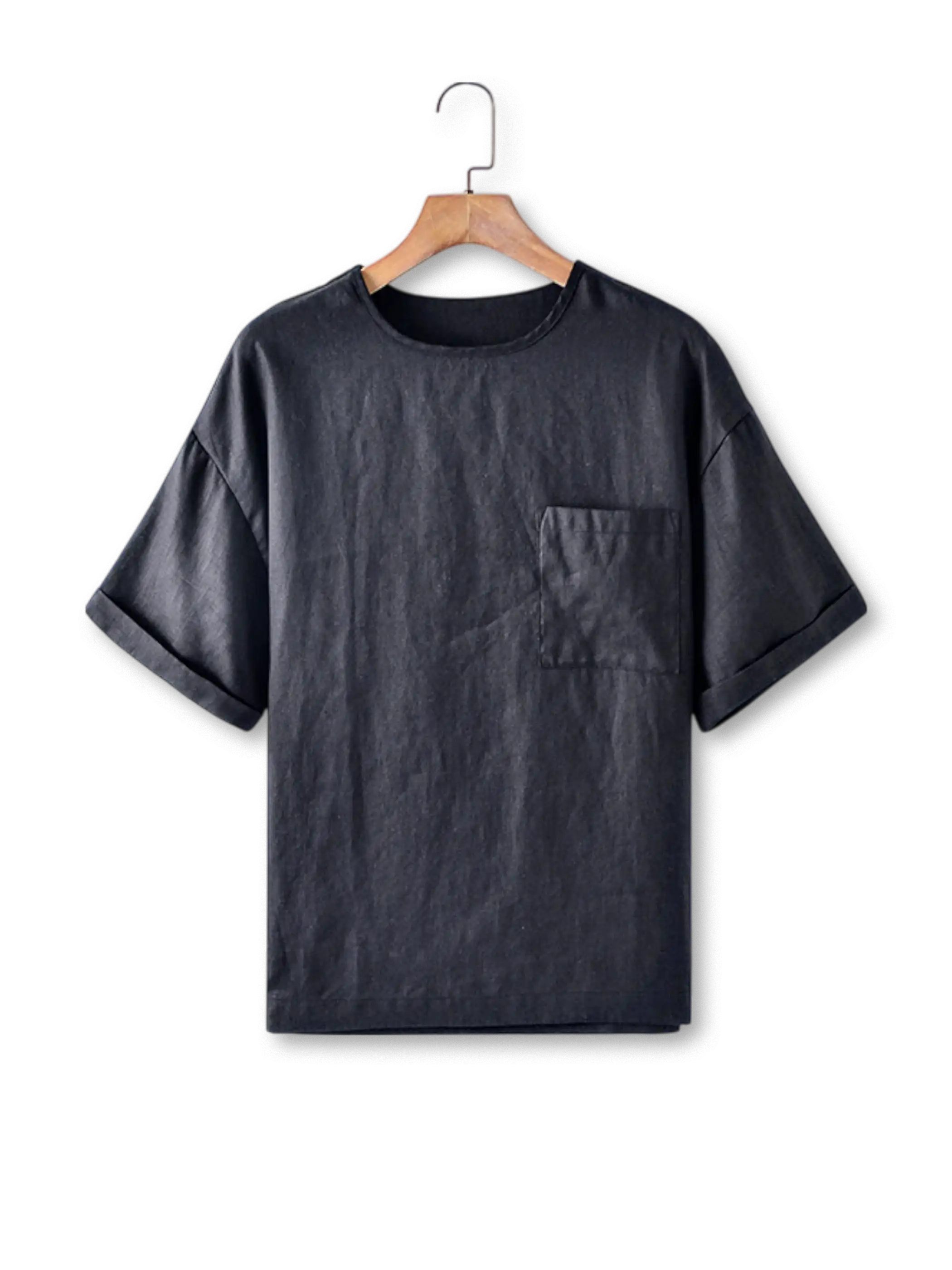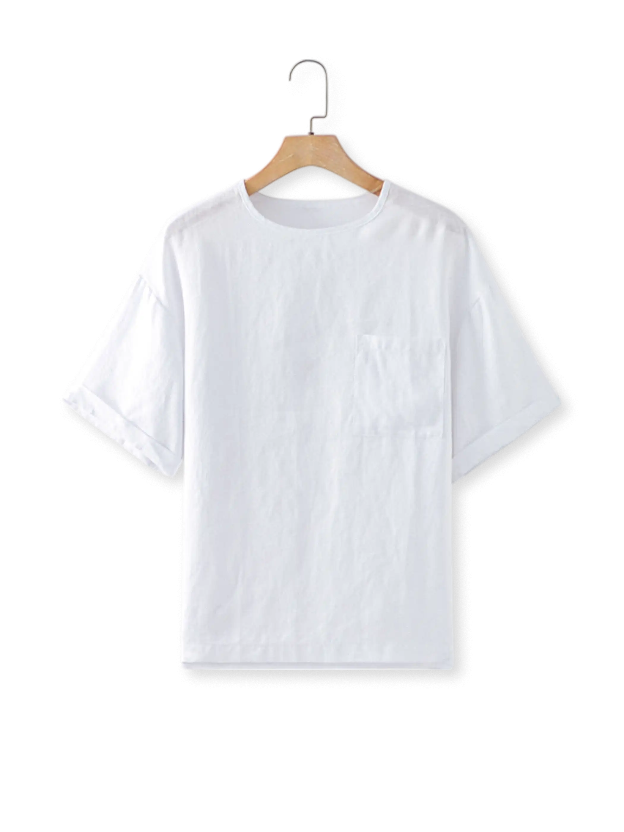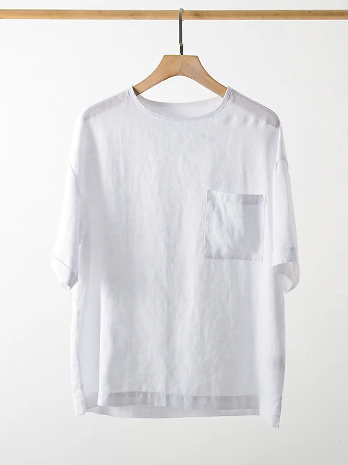 天然リネンの織り目が生む立体的な肌触りと優れた吸湿放湿性が特徴で、汗をしっかり逃がしてドライな着心地をキープ。胸元のパッチポケットがアクセントを添え、袖口はロールアップできる仕様でリラックスムードを演出。シンプルなクルーネックとゆったりシルエットは、デザイナーがリネン素材の風合いを活かすために極限まで無駄を削ぎ落とした結果で、デニムからショーツまで幅広いコーディネートに対応します。
