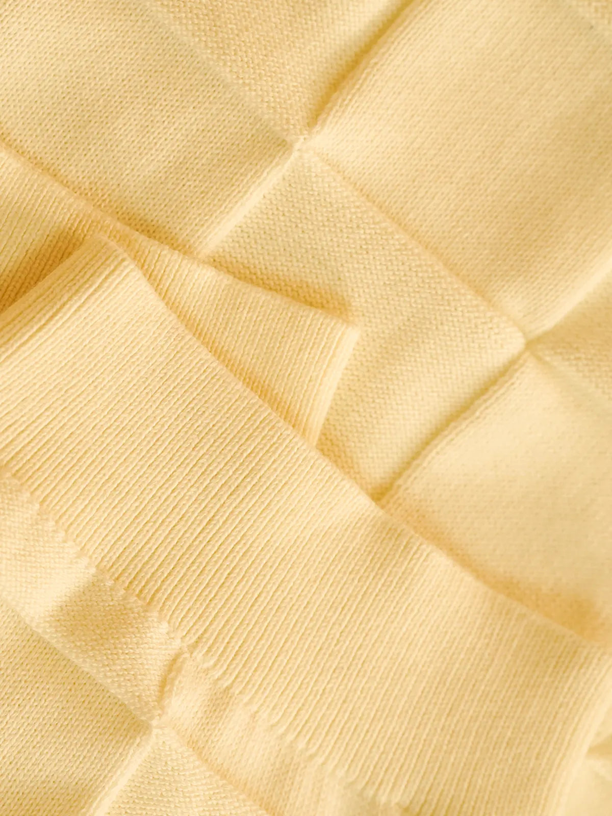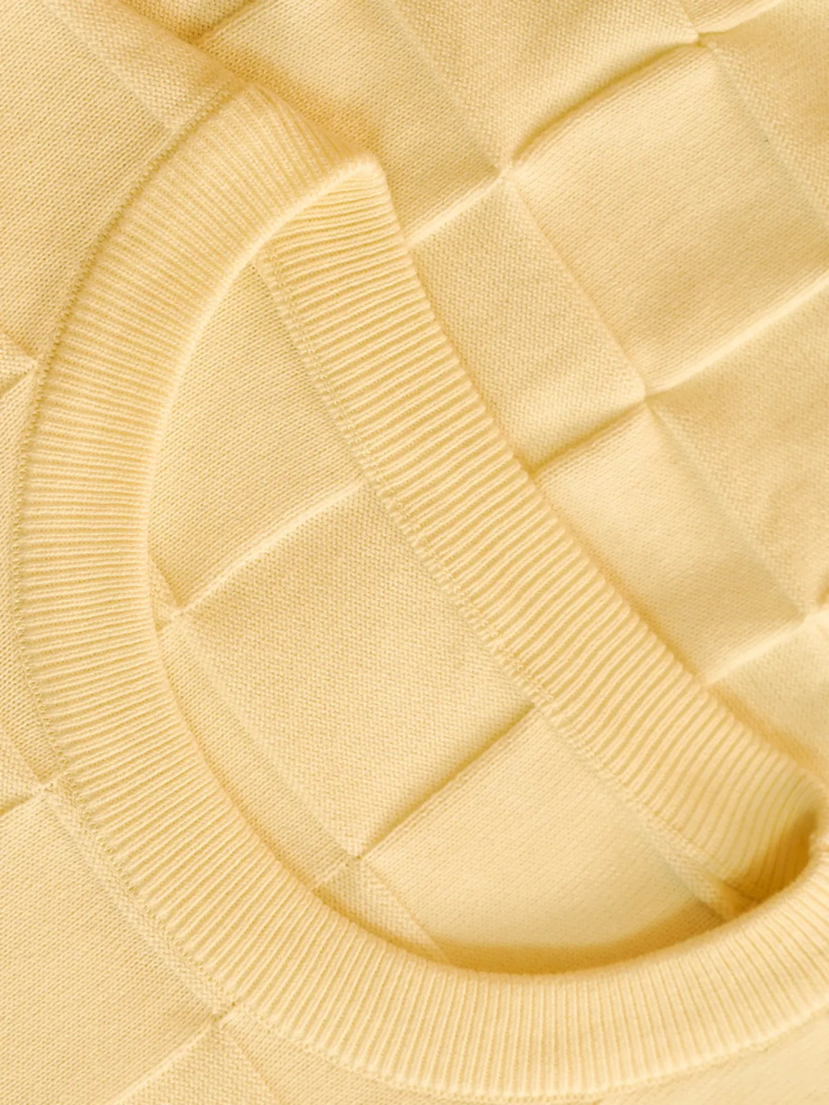 100%長繊維綿を使用した240g/m²の軽量ニットは、上質なタッチで肌に心地よく寄り添い、独自の格子ジャカード編みが立体的な陰影を生み出します。ジャズ黄金期のシェット・ベイカーが愛したプレーンなTシャツスタイルを彷彿とさせるクラシックなクルーネックと幅広リブ裾&袖口が、どこか懐かしくも洗練された表情を演出。インでもアウトでも美しくきまるすっきりとしたシルエットが、デニムからリネンパンツまで多彩な夏コーデに溶け込みます。