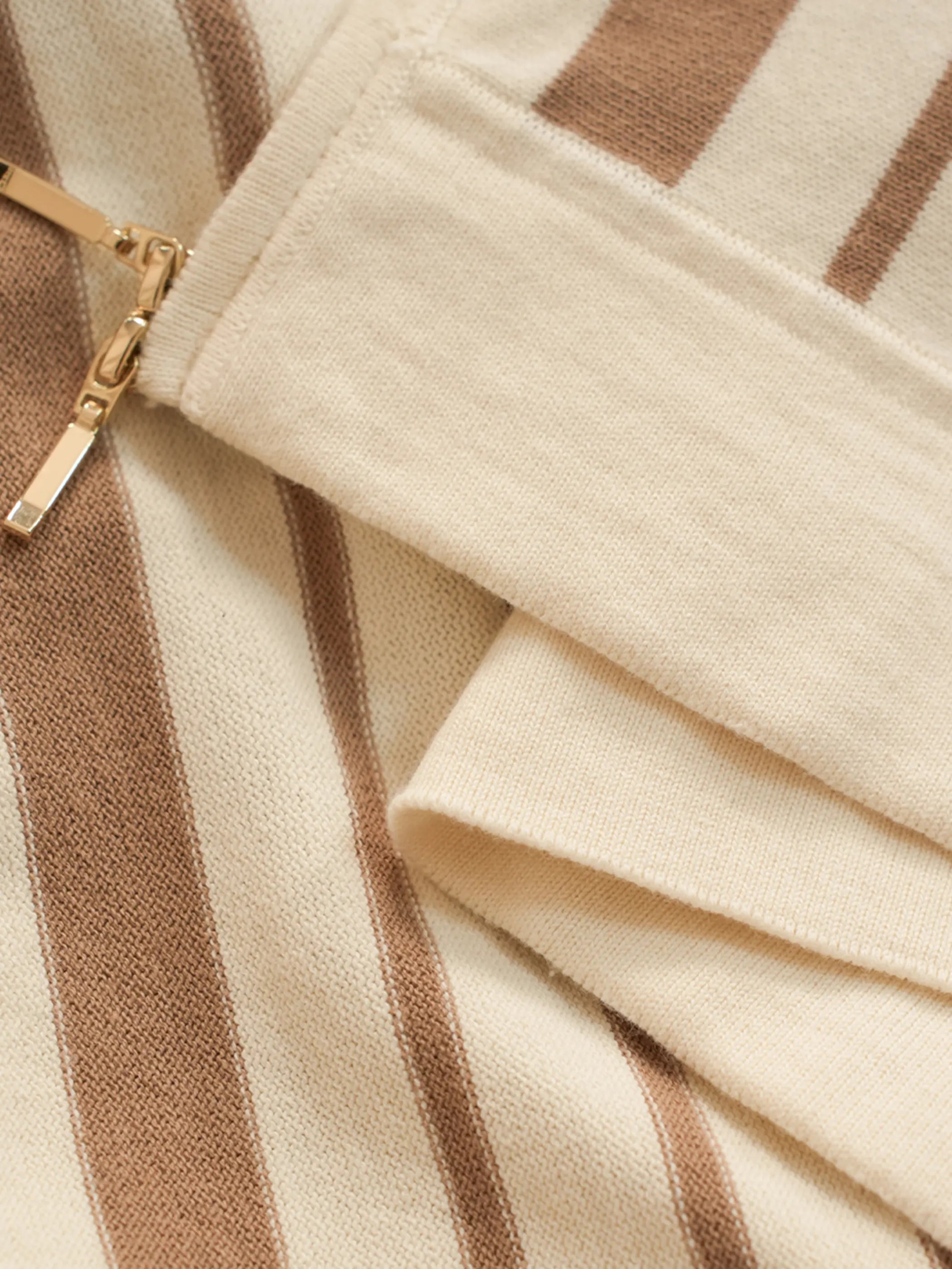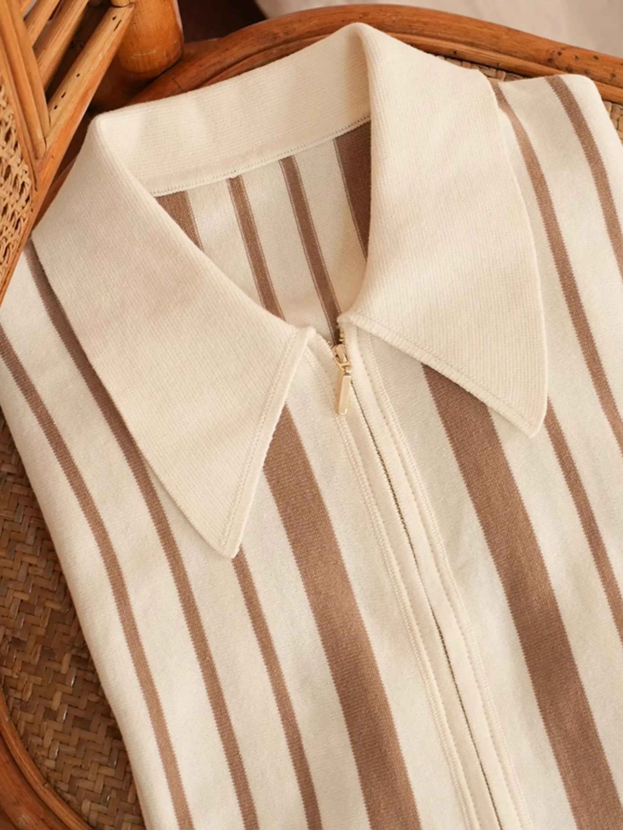 サイドに入ったブラウンのストライプがヴィンテージムードを深めるこのニットポロは、280g/m²の12GGコットン糸を用い、しなやかな肌触りと優れた吸湿性を実現。ドレスアップからカジュアルダウンまで自在に応え、特製のフルジップで着脱もスマートに完結。大きめの襟元が顔周りをすっきりと演出し、季節を問わず上品なアクセントを添えます。