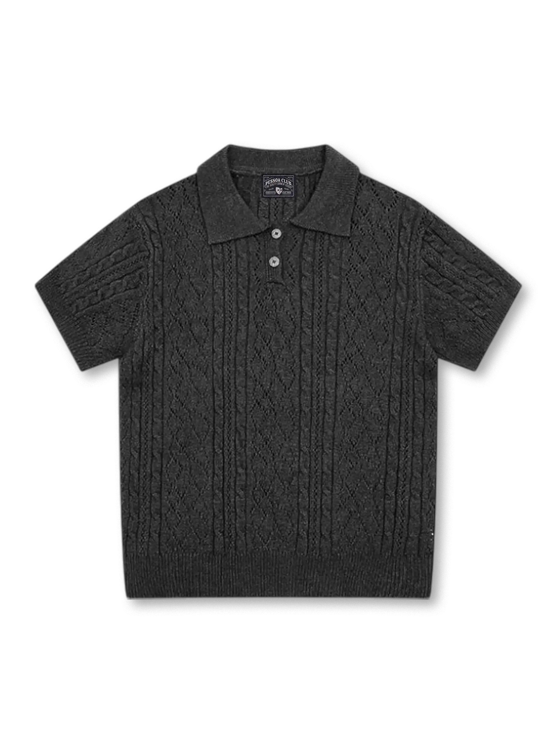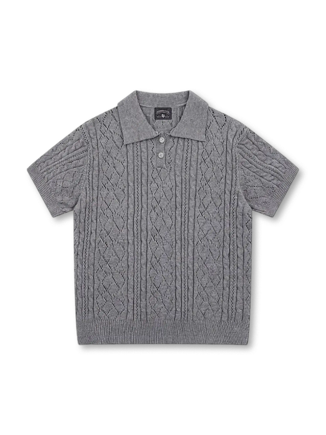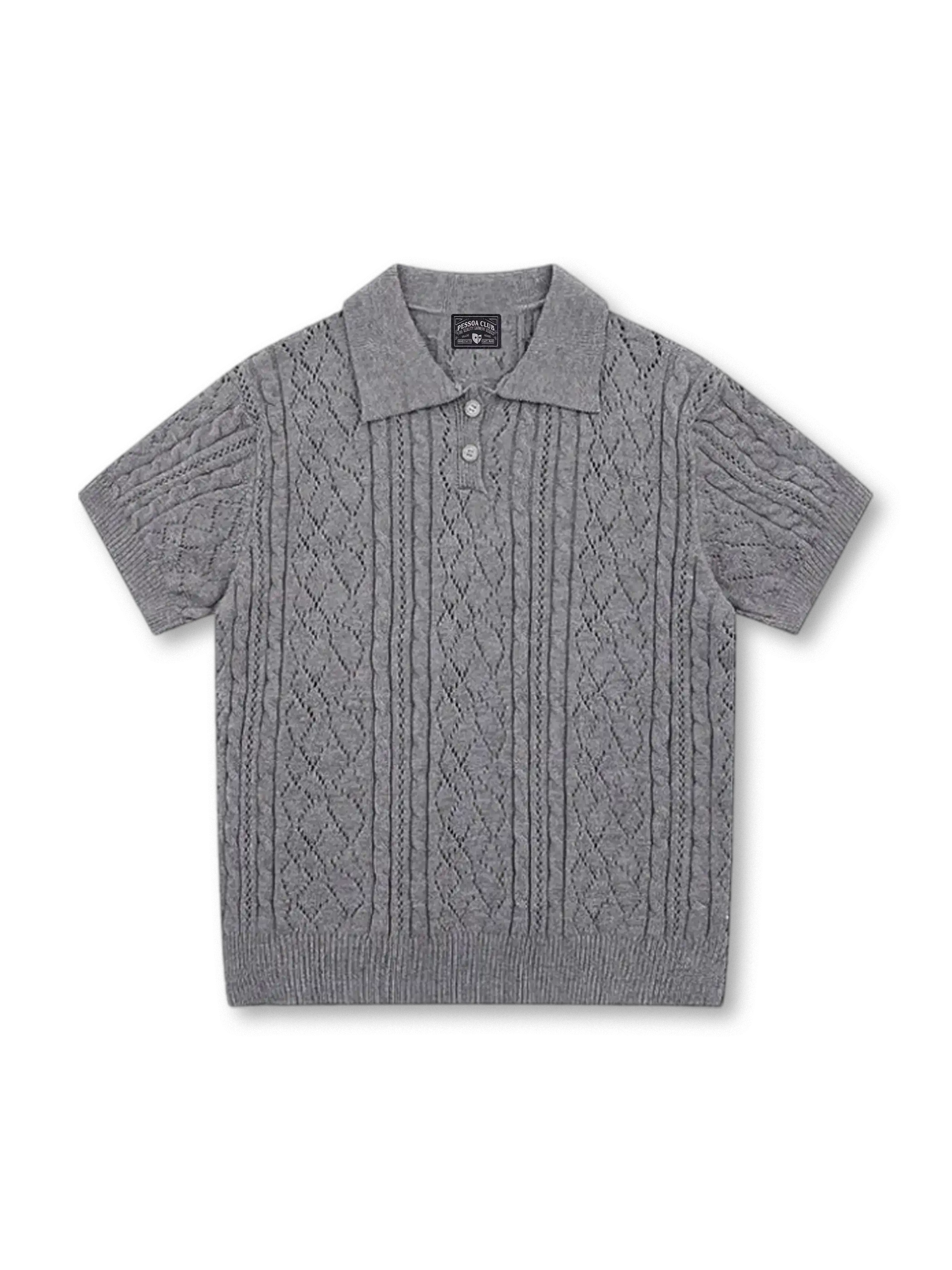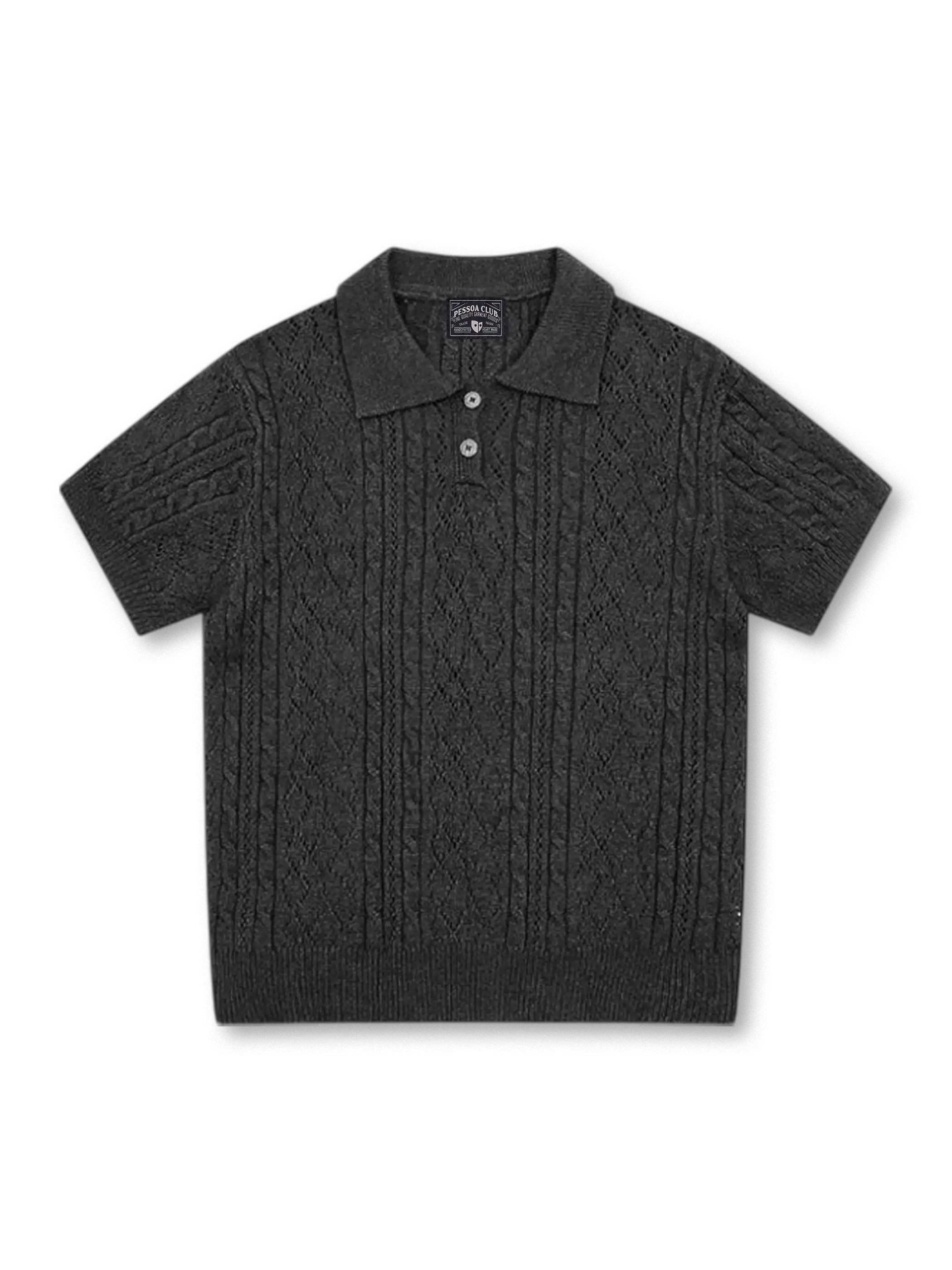 クラシカルなケーブル&アラン風の透かし柄が映える、上品な肌触りのショートスリーブニットポロ。