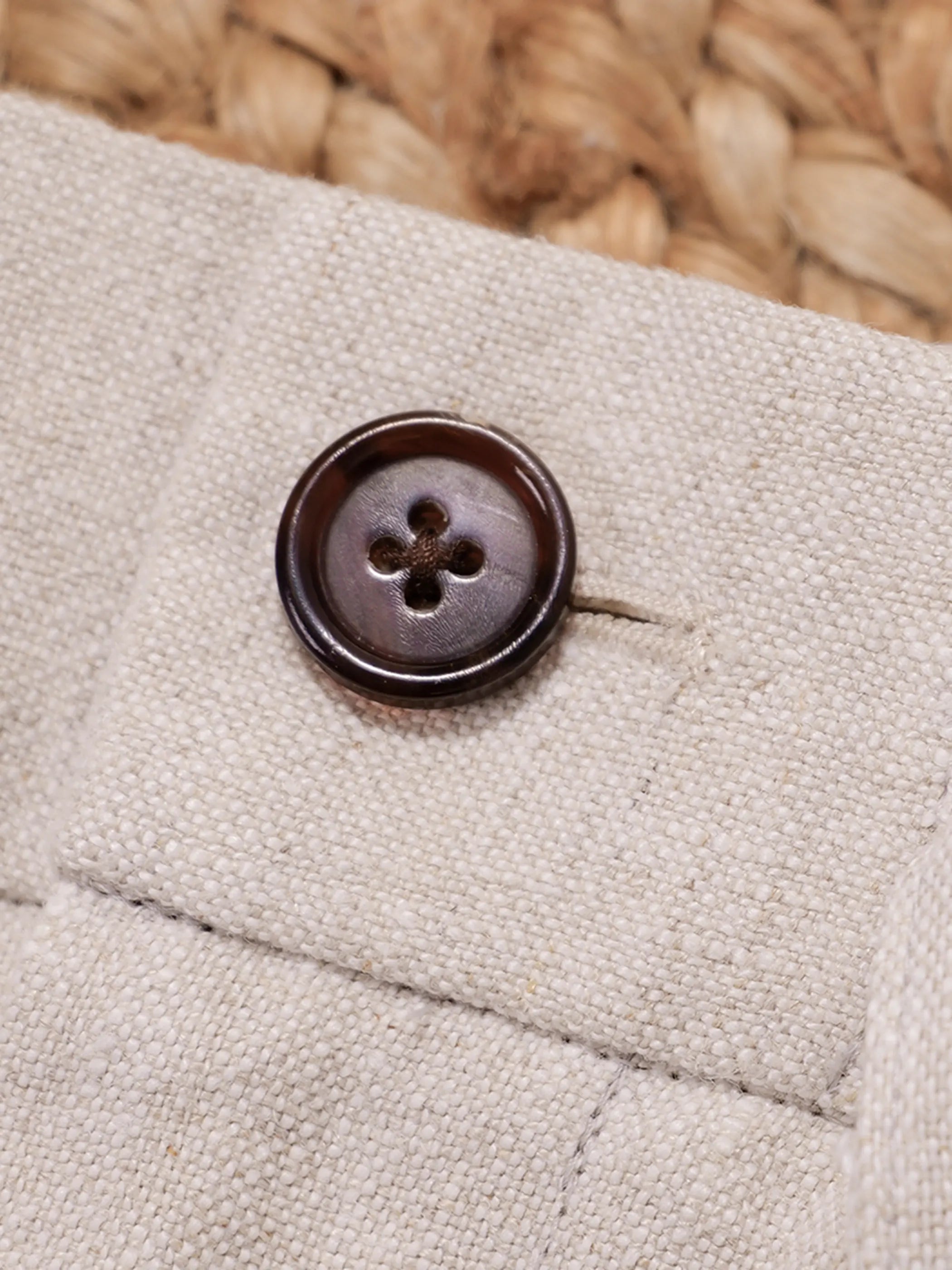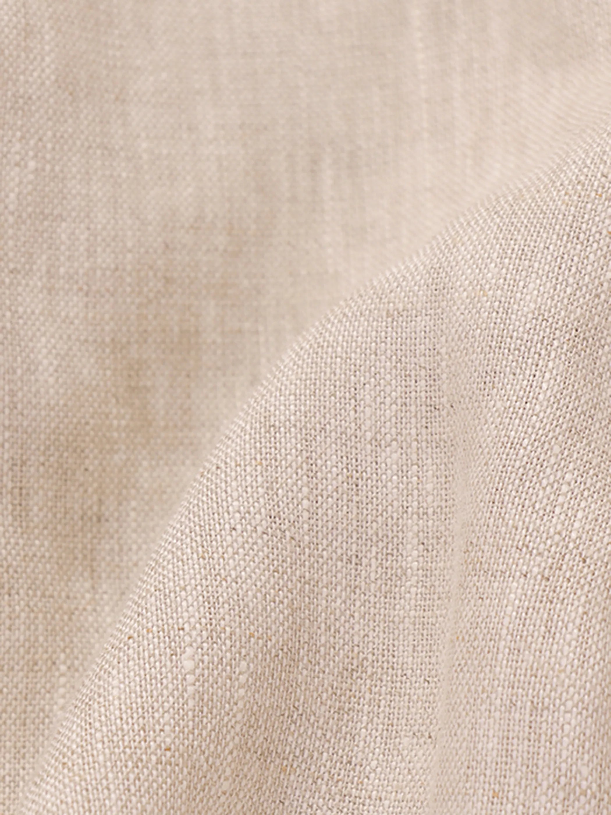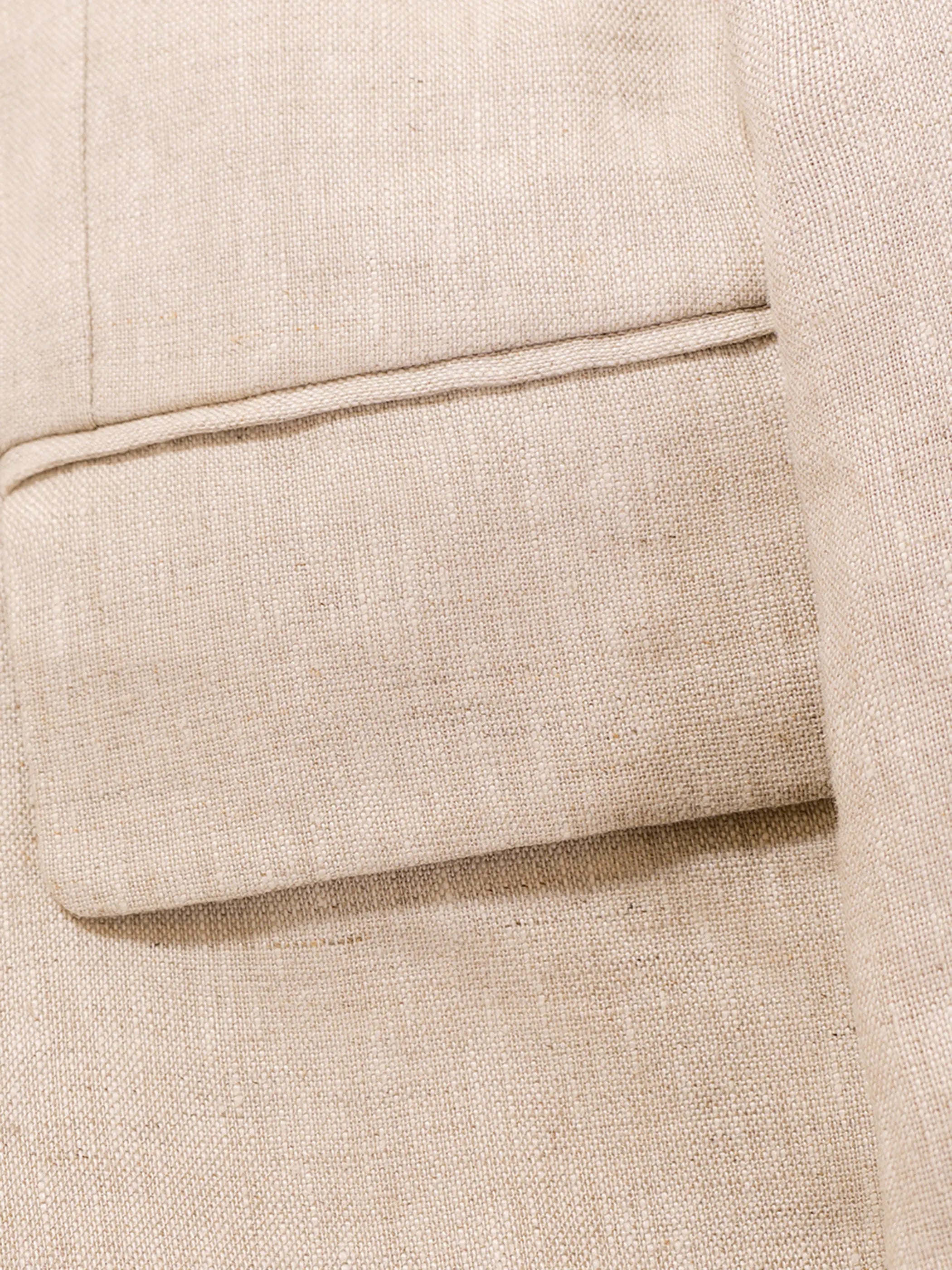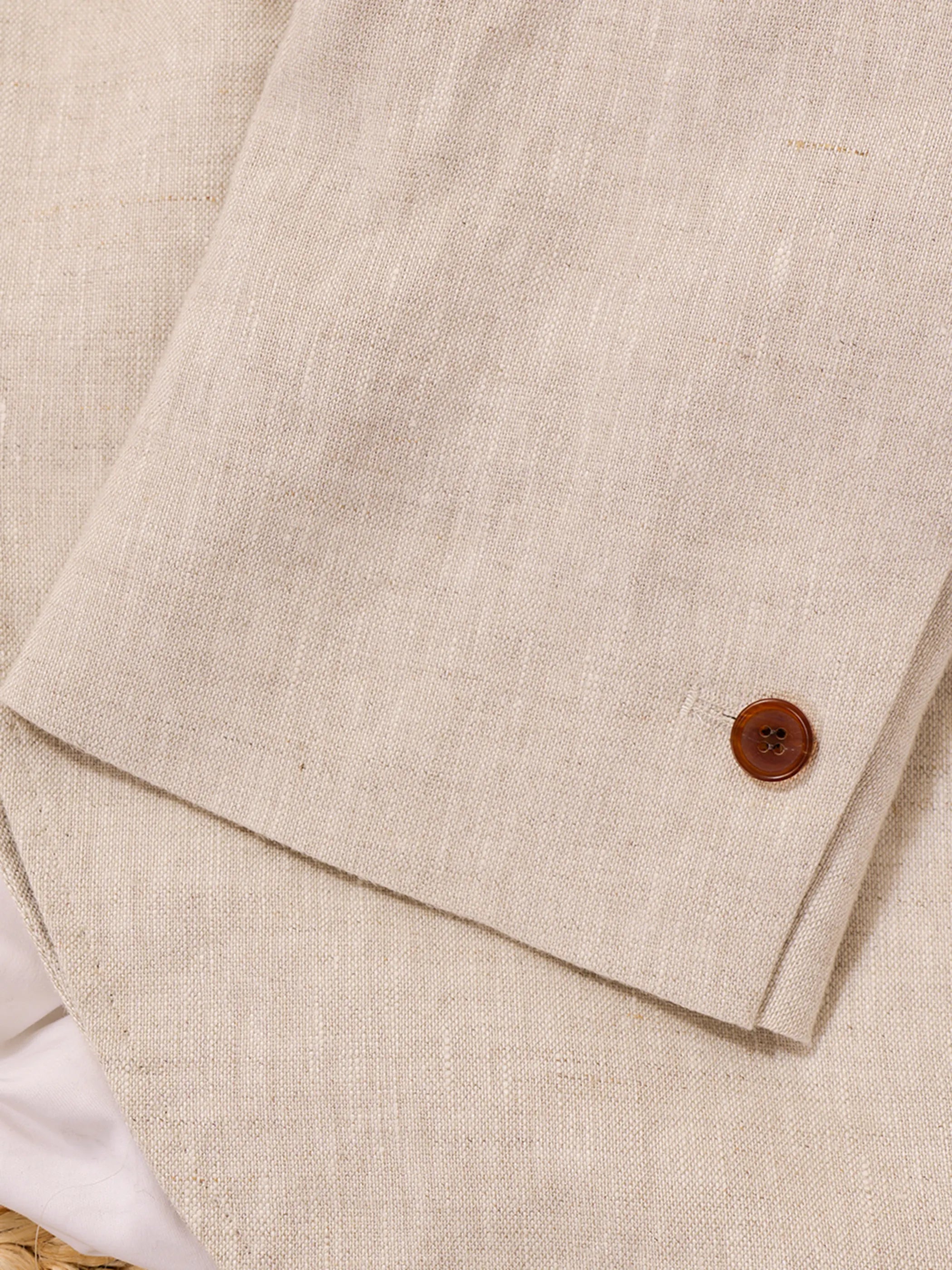 フランス・ノルマンディ産リネン100%を362g/m²の高密度6×6平織で仕立て、自然な陰影と軽やかなドレープを両立。ジャケットは襟を排したノーラペルデザインが肩頸ラインをすっきり見せ、シンプルな一粒ボタンが抜け感を添えます。パンツはハイウエスト&抽繩ウエストで視覚的に脚長効果を生み、わずかに広がるストレートラインがリラックスシルエットを演出。いずれも裏地なしの軽快仕様で、夏の通勤からリゾートまで幅広く活躍します。
