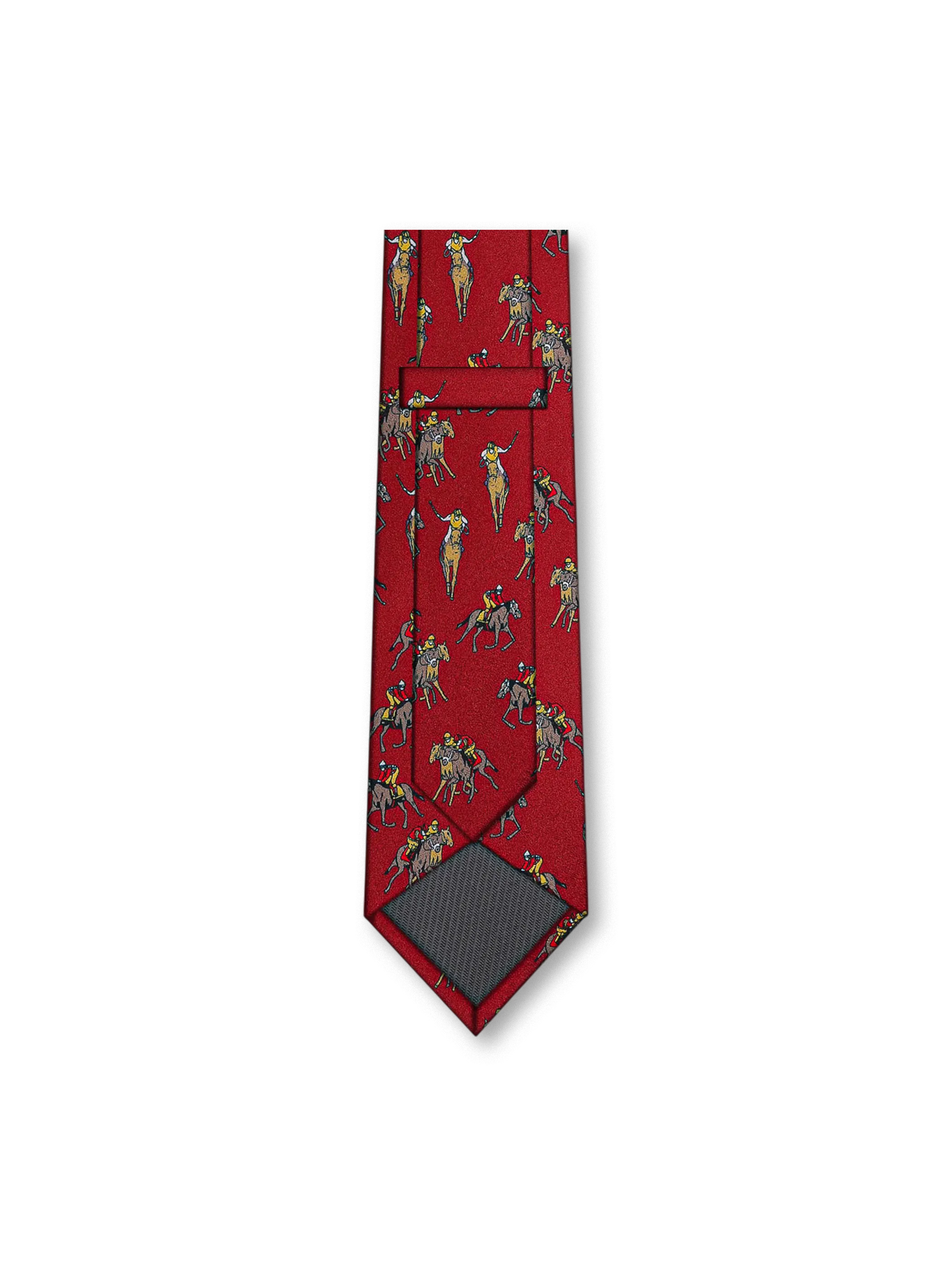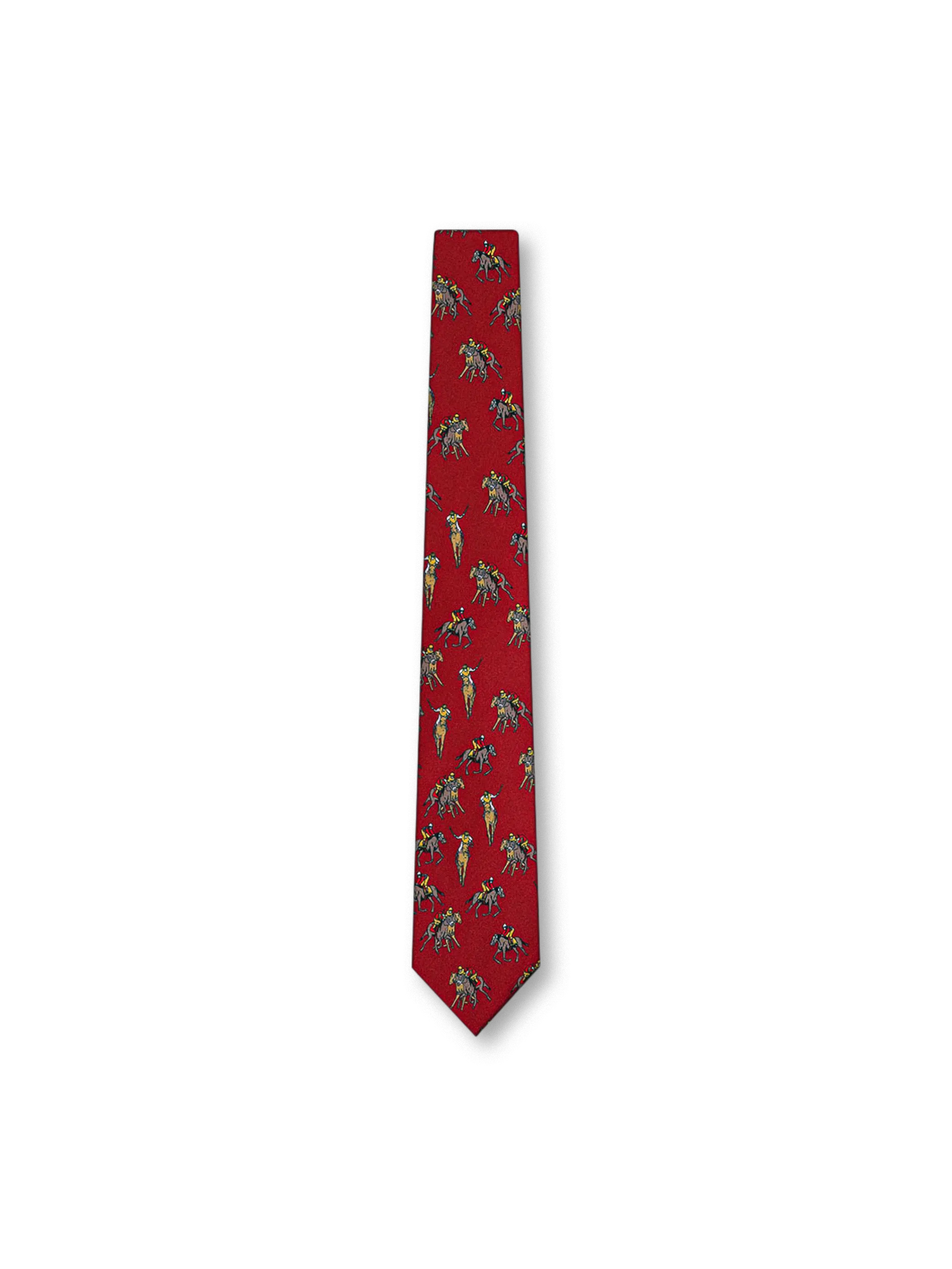 赤地に馬術モチーフを配し、スーツスタイルに遊び心と品格を添える幅9cmのヴィンテージ風ネクタイ。