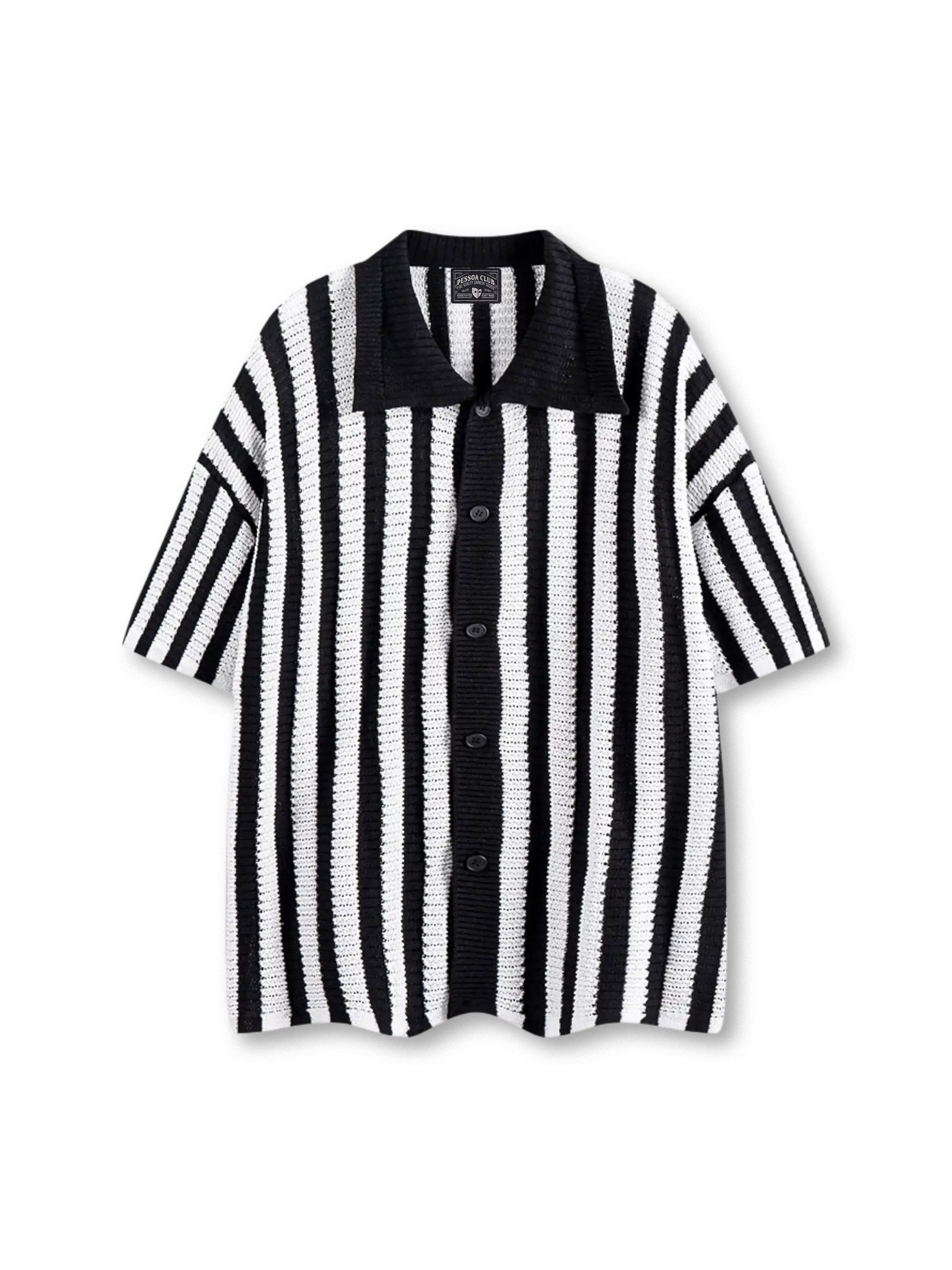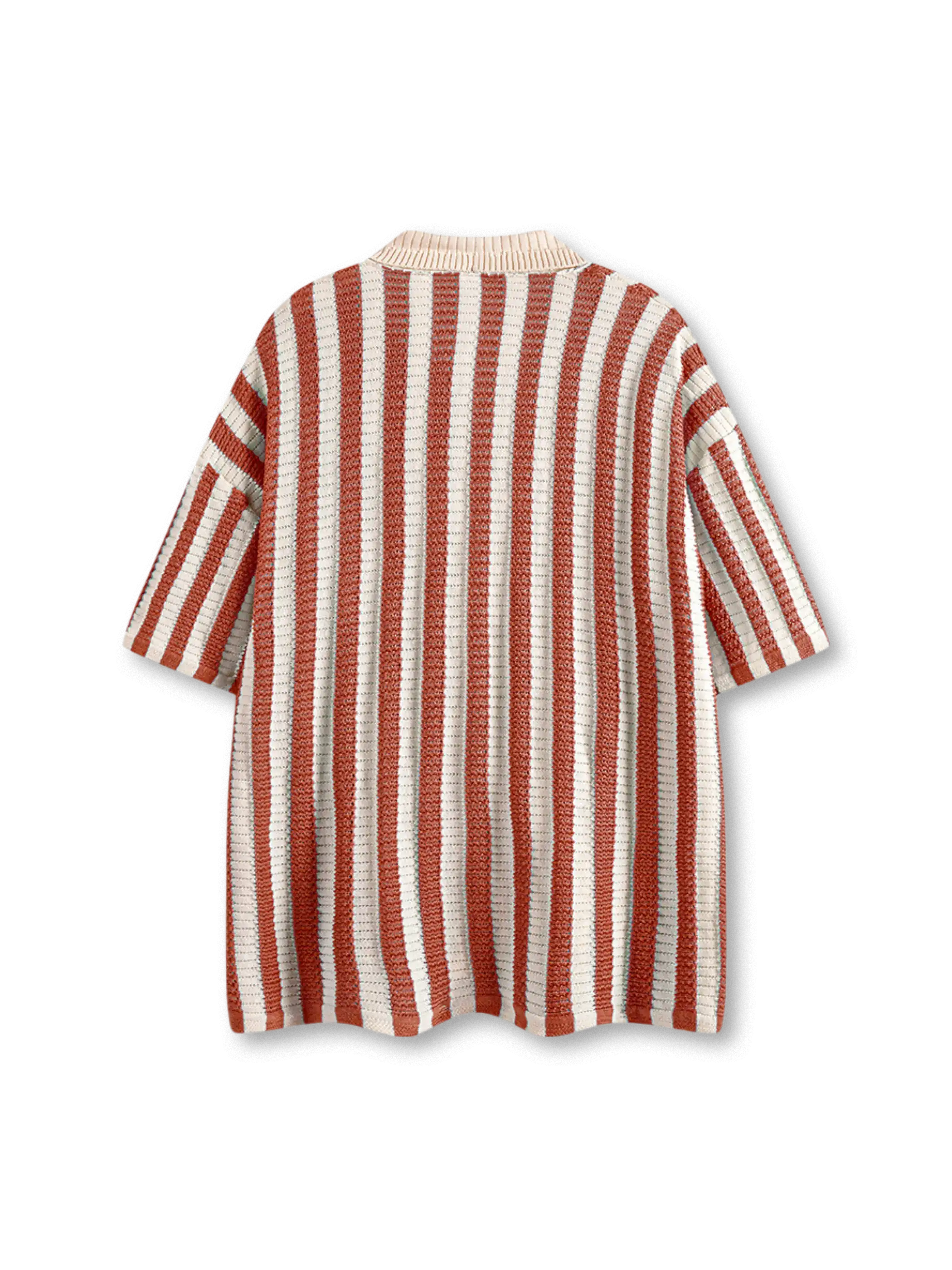 蜂の巣状リブ編みの縦ストライプが映える薄手ニットシャツ
