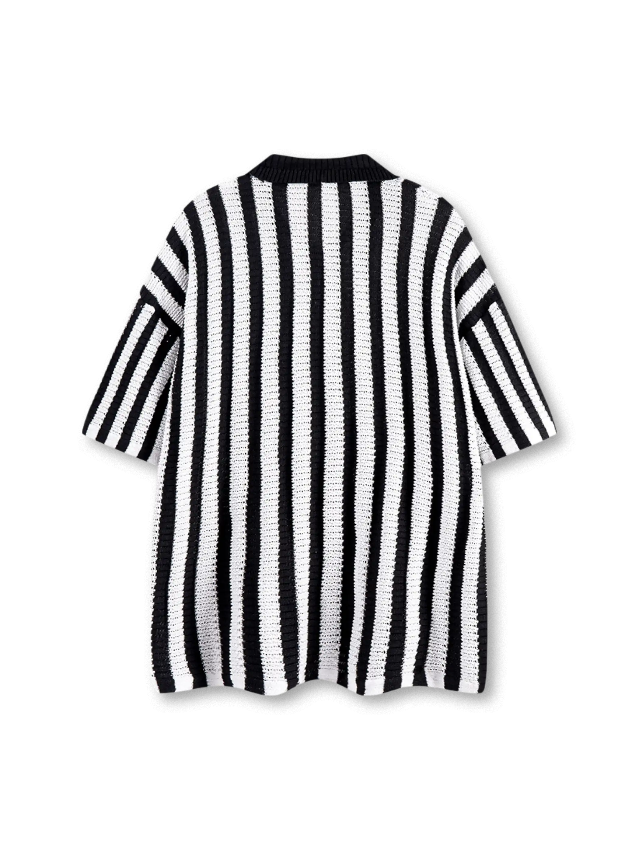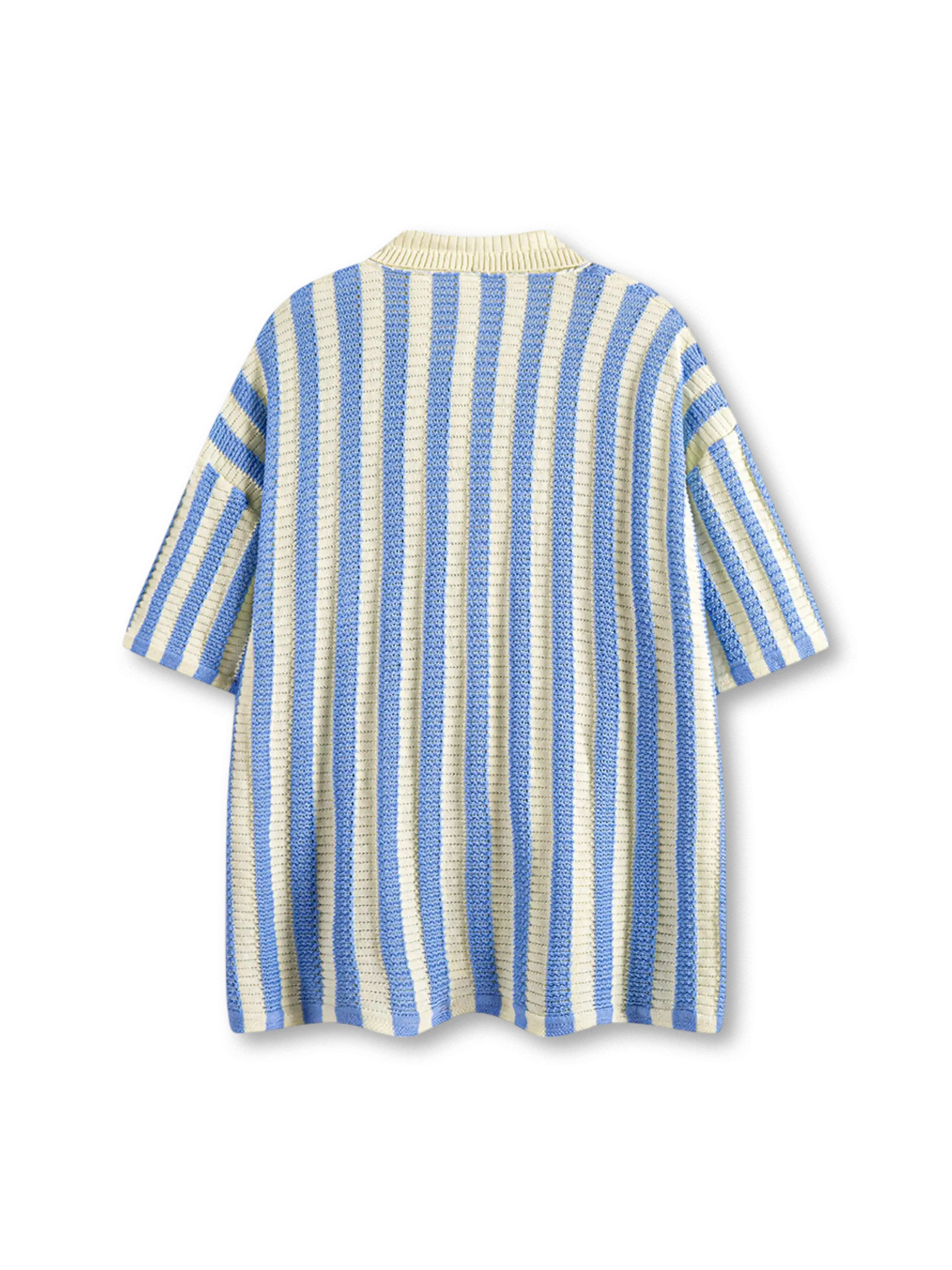 蜂の巣状に凹凸を付けたリブ編みで、繊細な縦ストライプ柄を表現。薄手のポリエステル素材は通気性と速乾性に優れ、汗ばむ季節でもさらりとした着心地をキープ。オープンカラーはリラックス感をもたらし、細かい小ボタンと緻密な縫製が上質な印象を添えます。