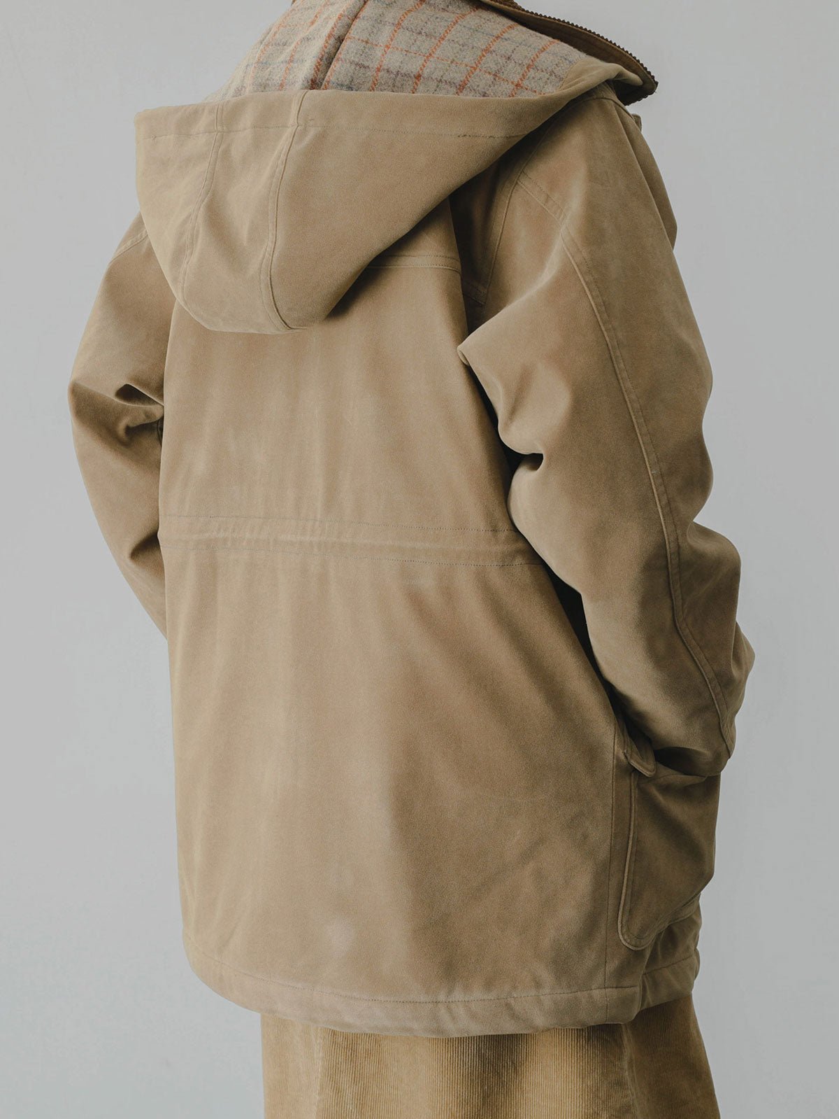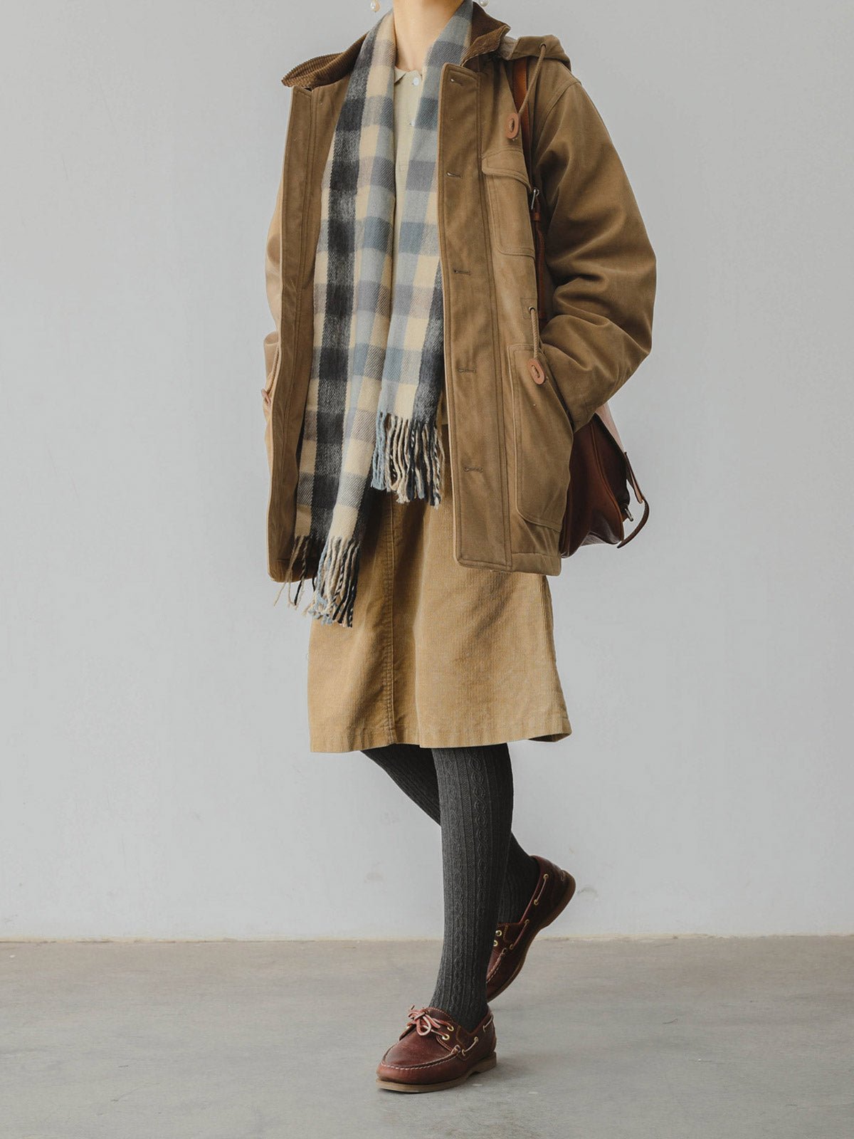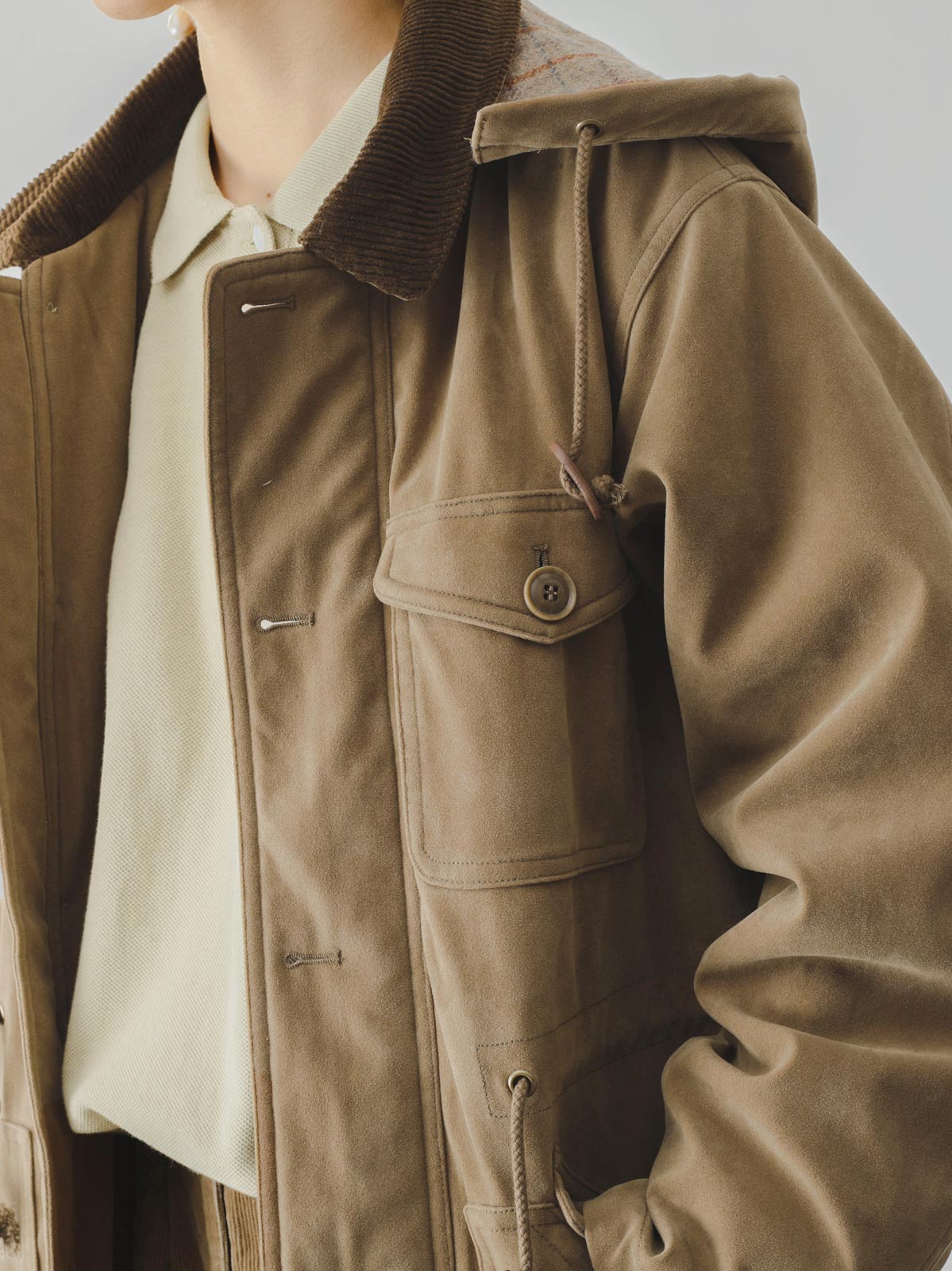 このスエード ベルベットジャケットは、クラシックなワークウェアデザインを採用し、多機能ポケットとゆったりとしたカットが日常の着こなしに実用的かつスタイリッシュな選択肢を提供します。フード付きのデザインはカジュアルでリラックスした雰囲気を加え、内側のチェック柄のディテールはレトロな魅力を演出しています。