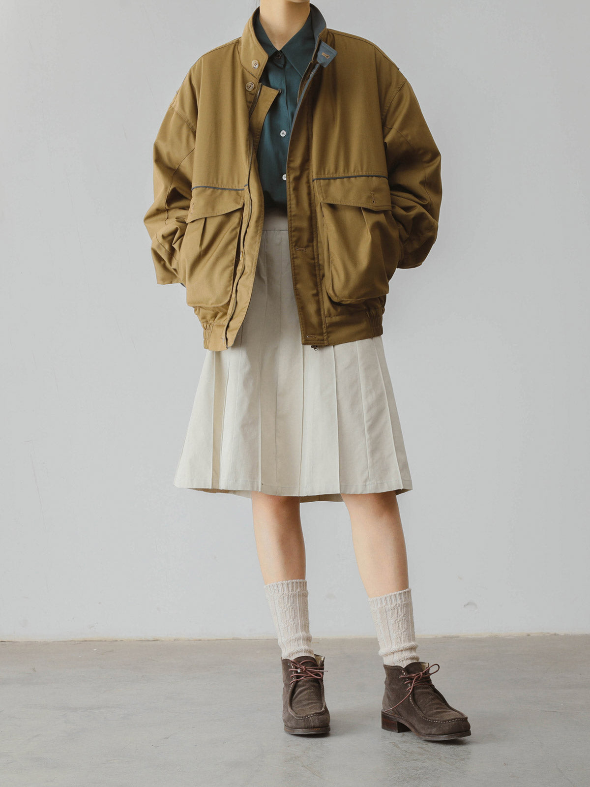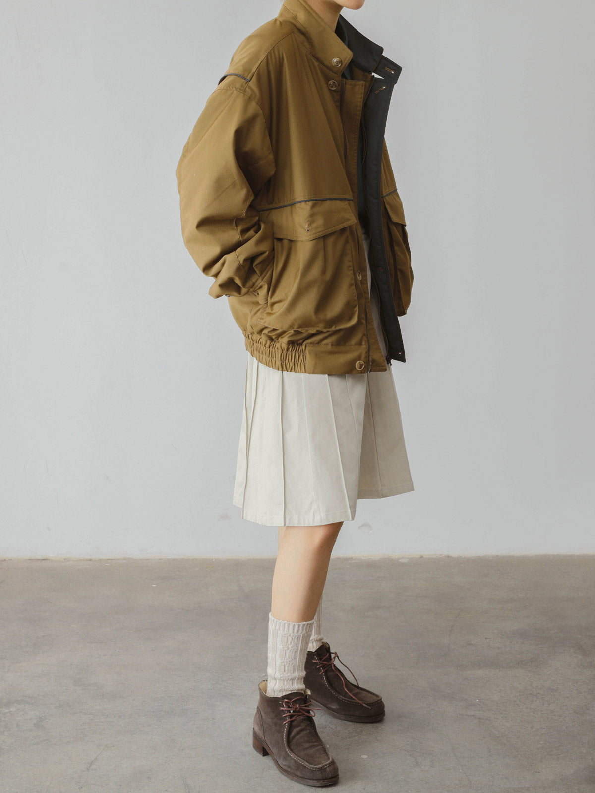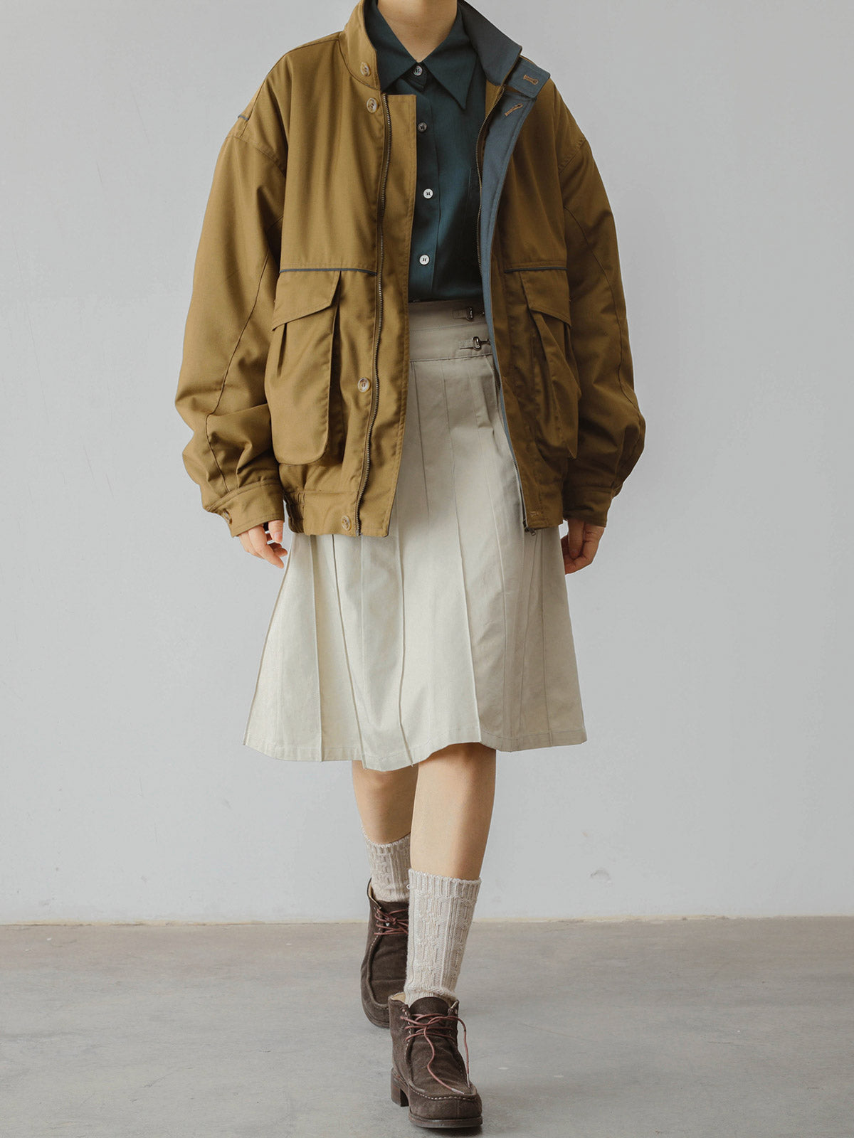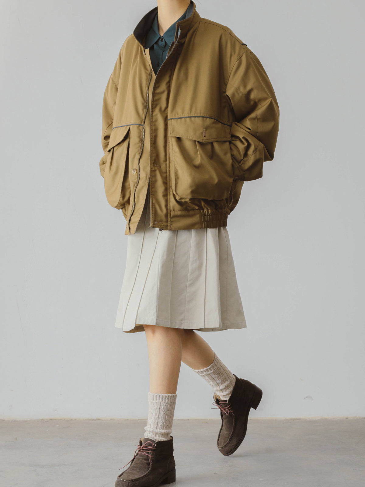 素材の選択と二重ポケットのワークウェアディテールは、ジャケットの実用性を強調すると同時にファッション感も加えています。カラーブロック要素は襟のデザインに取り入れられ、視覚的な魅力を提供します。